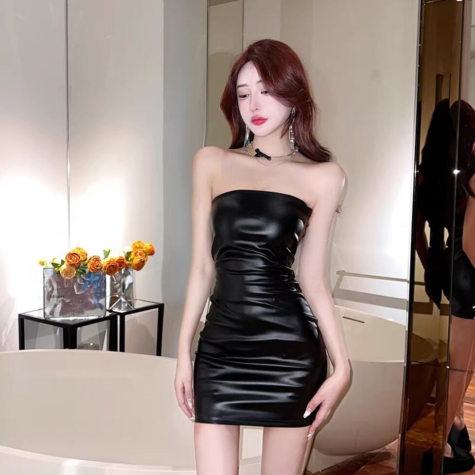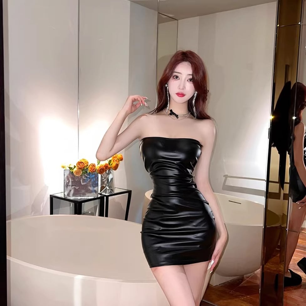 タイトなフェイクレザーミニワンピースです。セクシーなショート丈にギャザーがメリハリに陰影をつけるシルエット。ワイルドに艶めくレザーが女性らしくかっこよい風合いです。パーティやイベントでインパクトを演出する存在感のあるアイテムです。