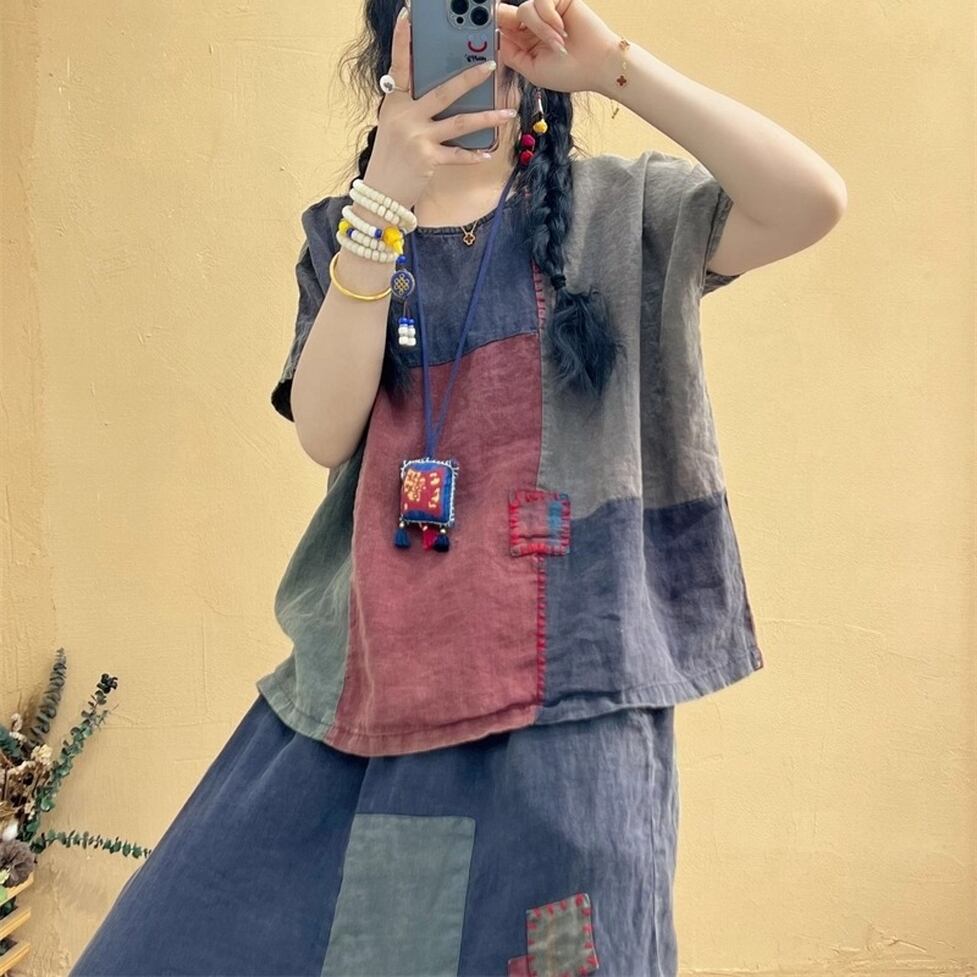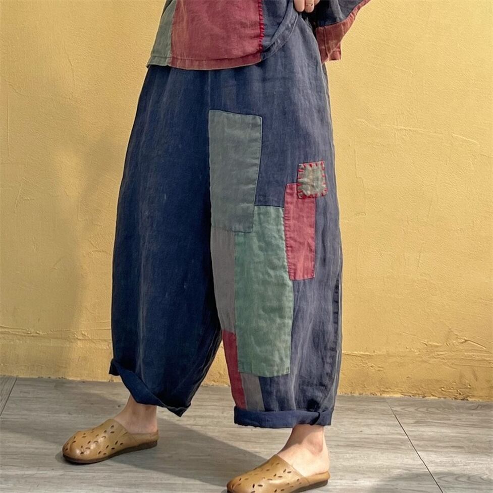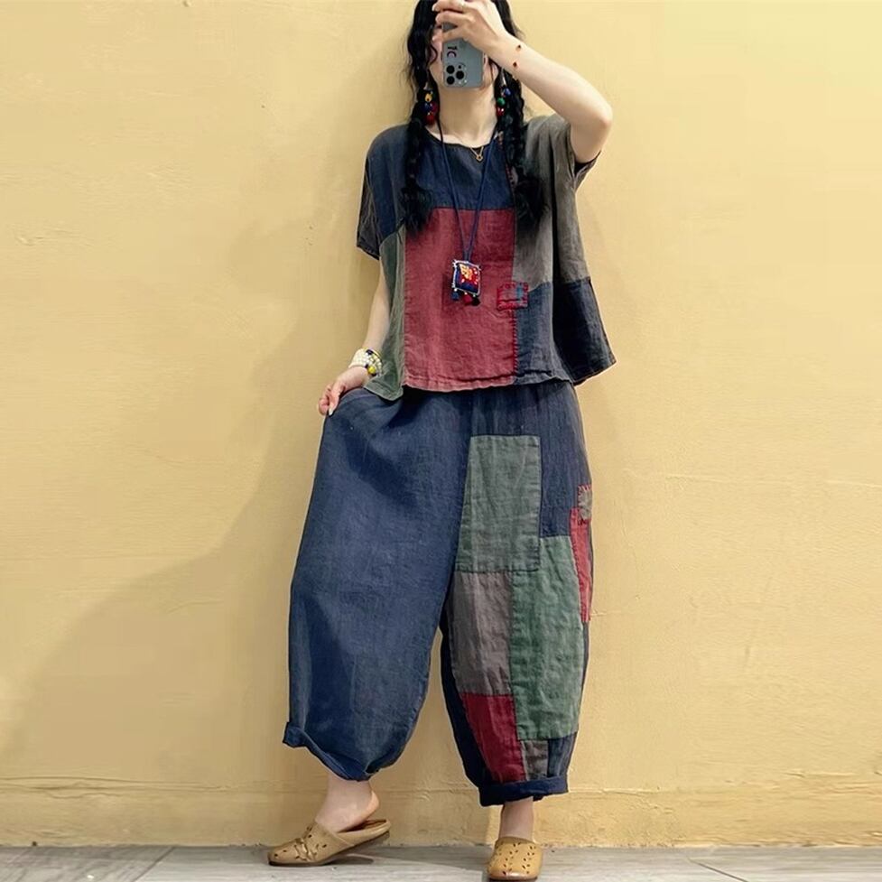 レトロなパッチワークが独特の雰囲気を引き出すパンツセットアップ。ユニセックスな雰囲気で気楽に使えるのがポイントです。格子状の不規則柄で個性的でアートなムードがありながらさらっと着こなせるバランス感も安心です。