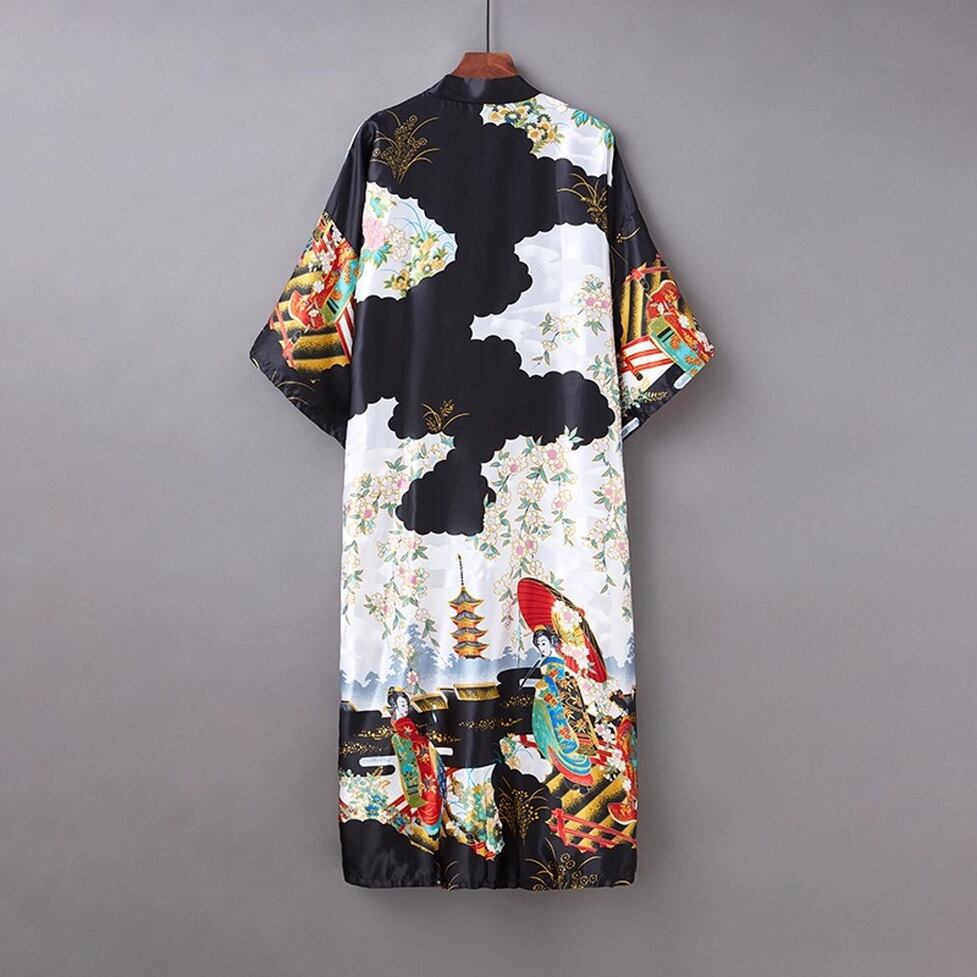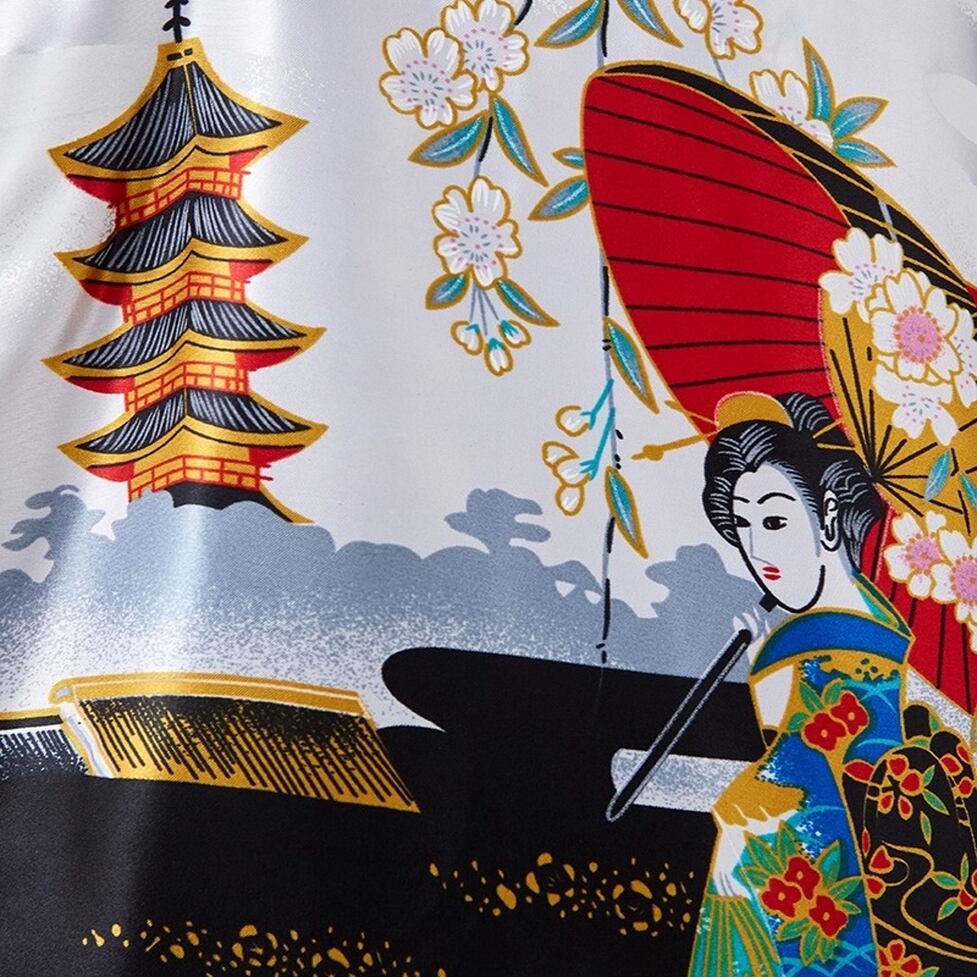 和柄のデザインが目を引く大ぶりの羽織り。ゆったりした開襟のデザインで気楽に着られて存在感はばっちり。ユニセックスな雰囲気でカジュアルからレトロな雰囲気まで演出します。