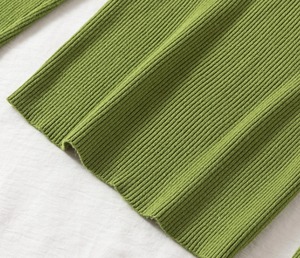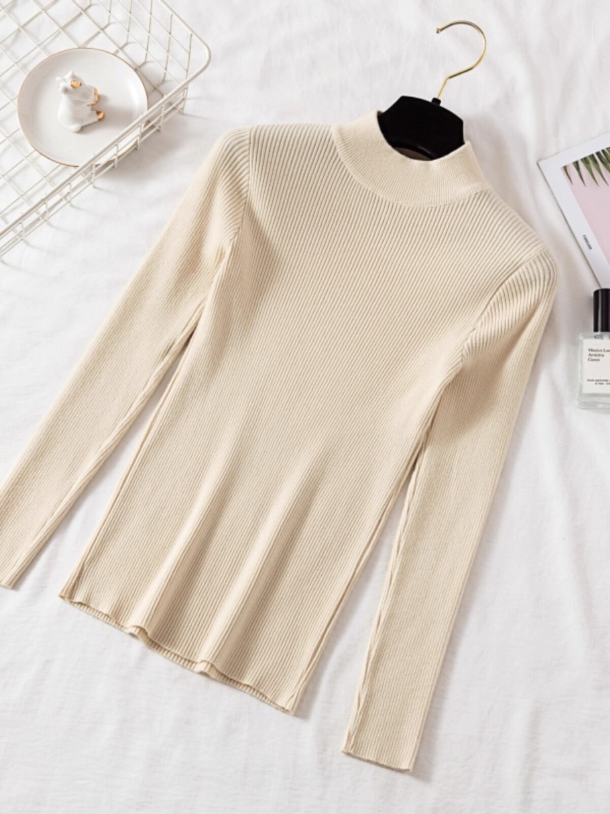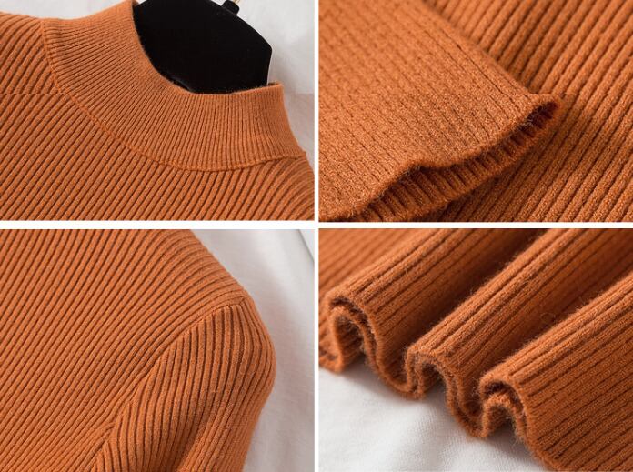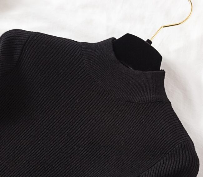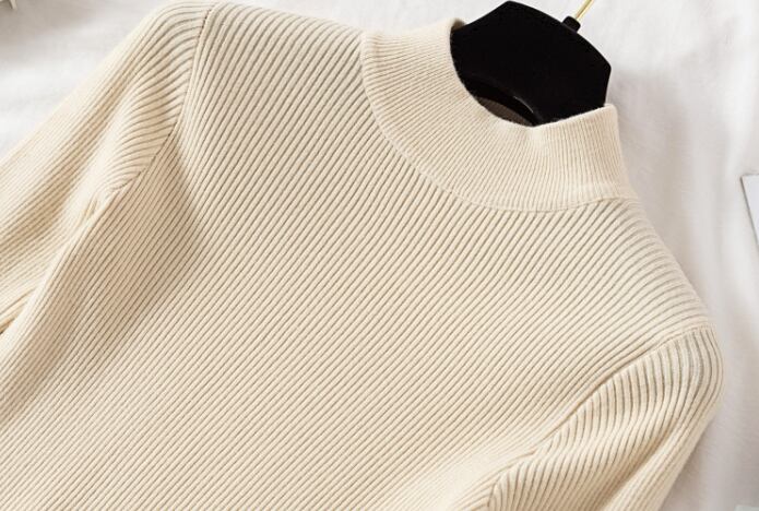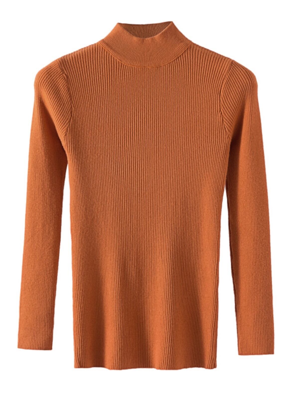 普通丈・長袖・ハイネックのデザインで、襟なしのノーカラーが洗練された印象を与えます。タイトでスリムなシルエットは、女性らしいラインを強調し、リブニットの中厚手素材が季節感を演出。
