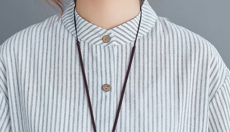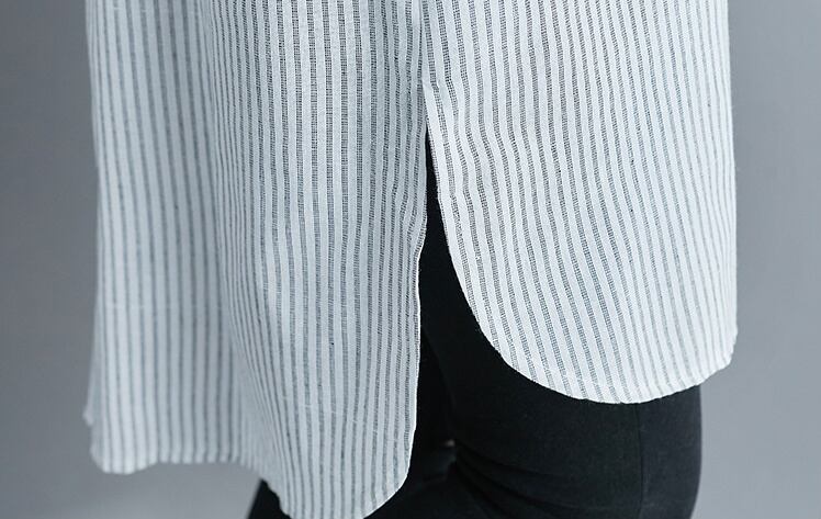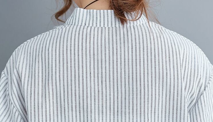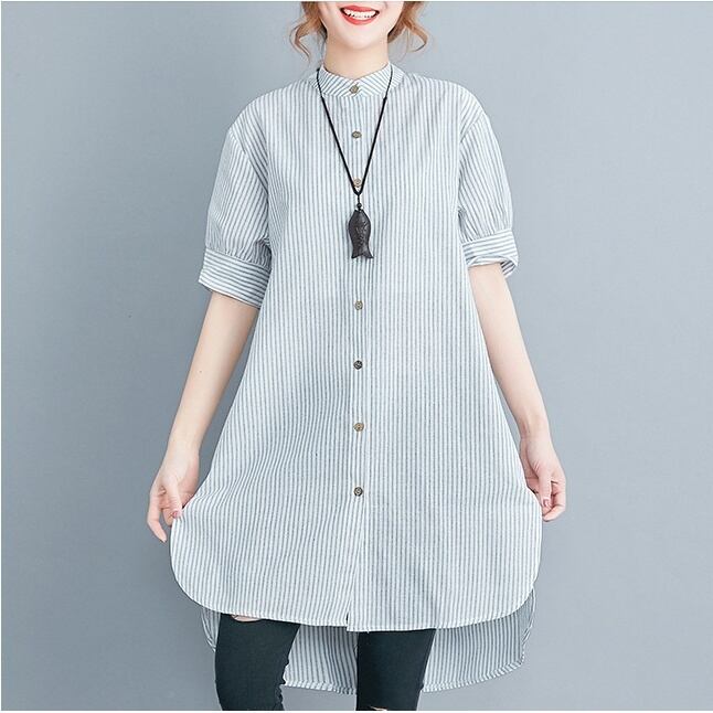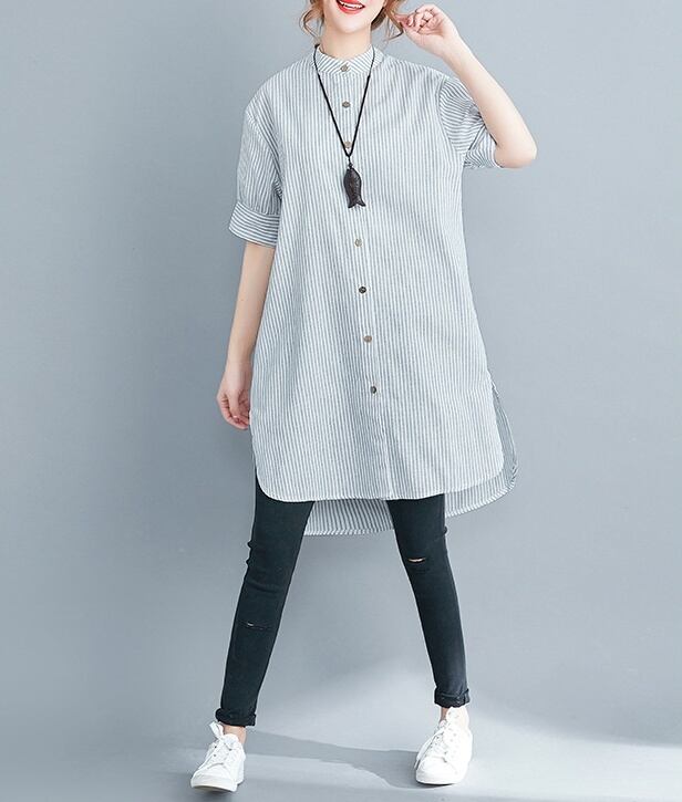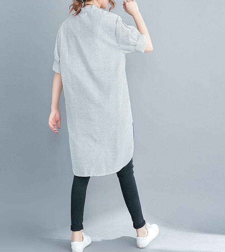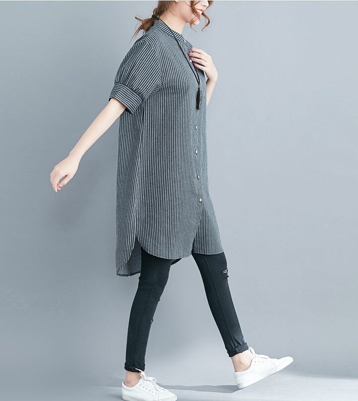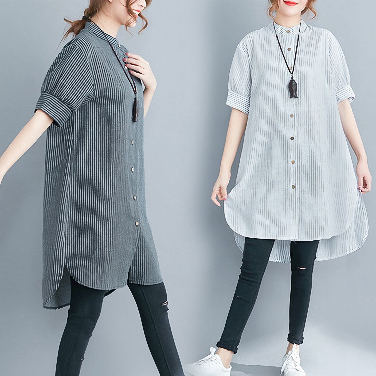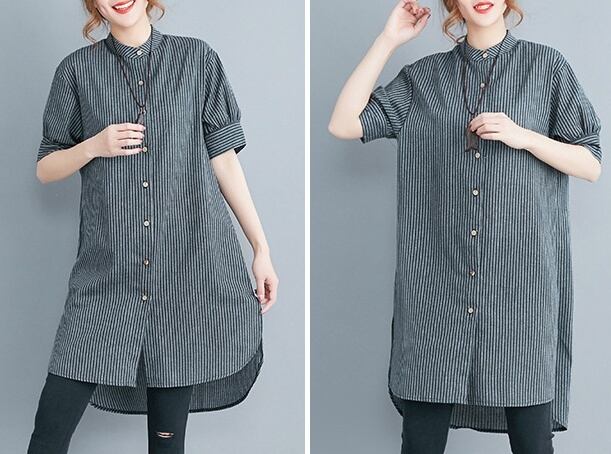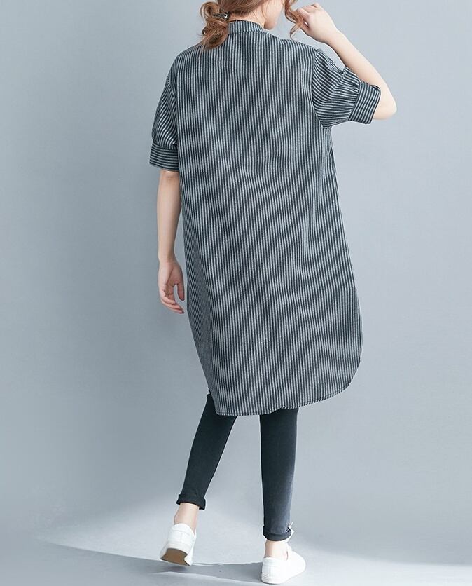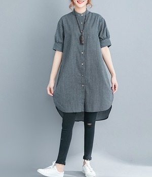 洗練されたスタイルを演出する、アシンメトリーストライプチュニックシャツのご紹介です。前開きのデザインと5分袖のスタイルが、上品さとカジュアル感を絶妙に組み合わせています。スタンドカラーが顔周りを華やかに引き立て、サイドスリットと裾ワイドのディテールが動きのあるシルエットを実現。春夏秋のシーズンにぴったりな一品です。