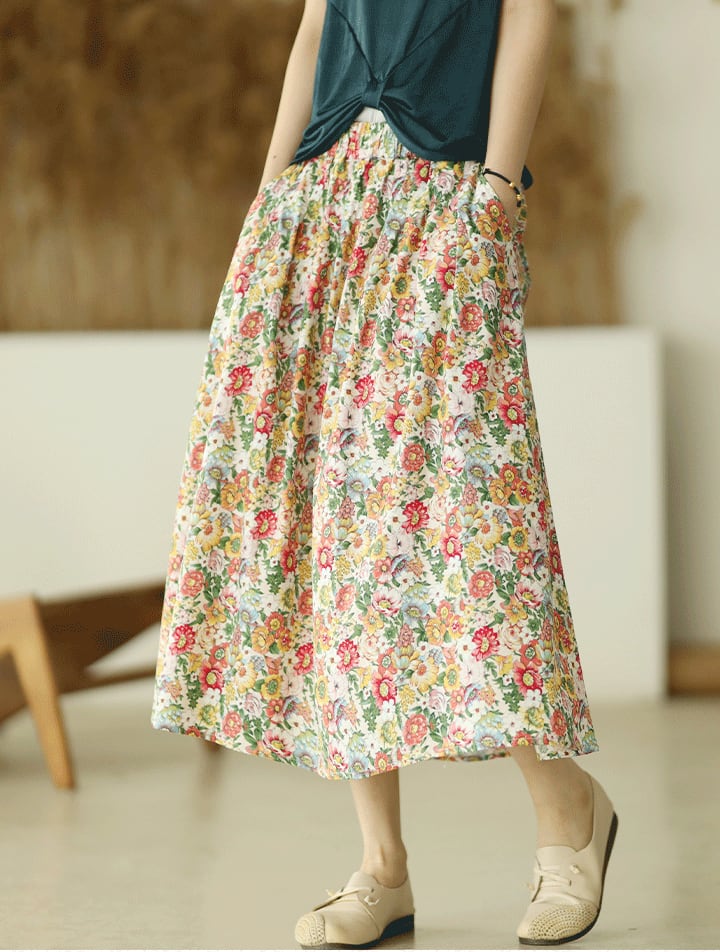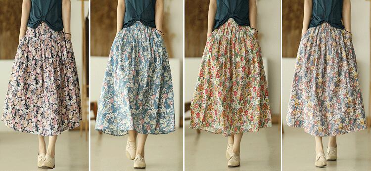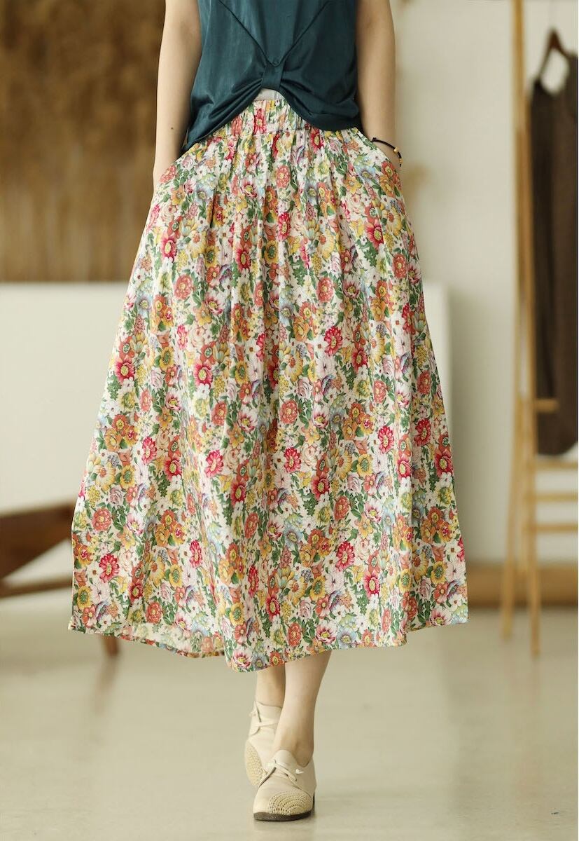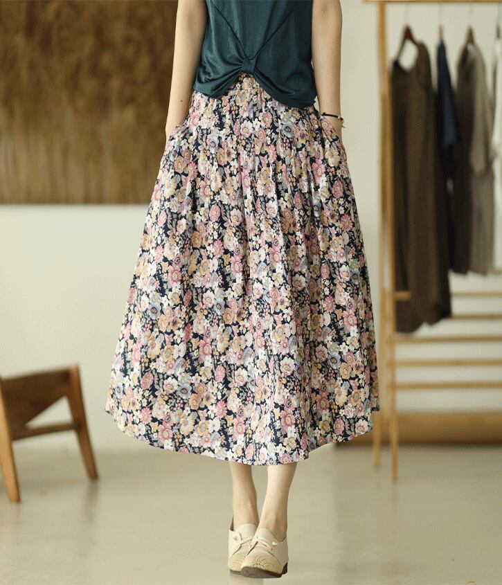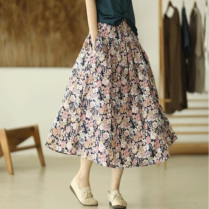 花柄総柄がレトロな雰囲気のミモレ丈Aラインスカート!