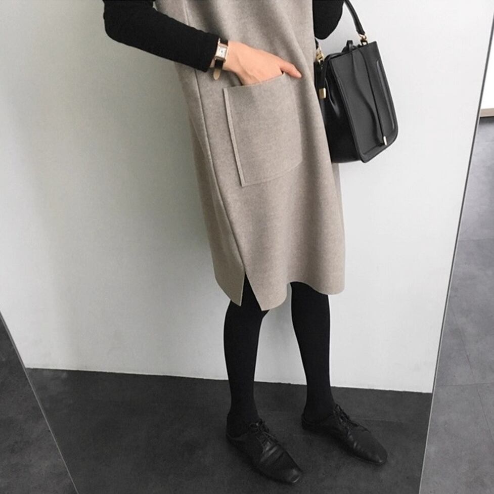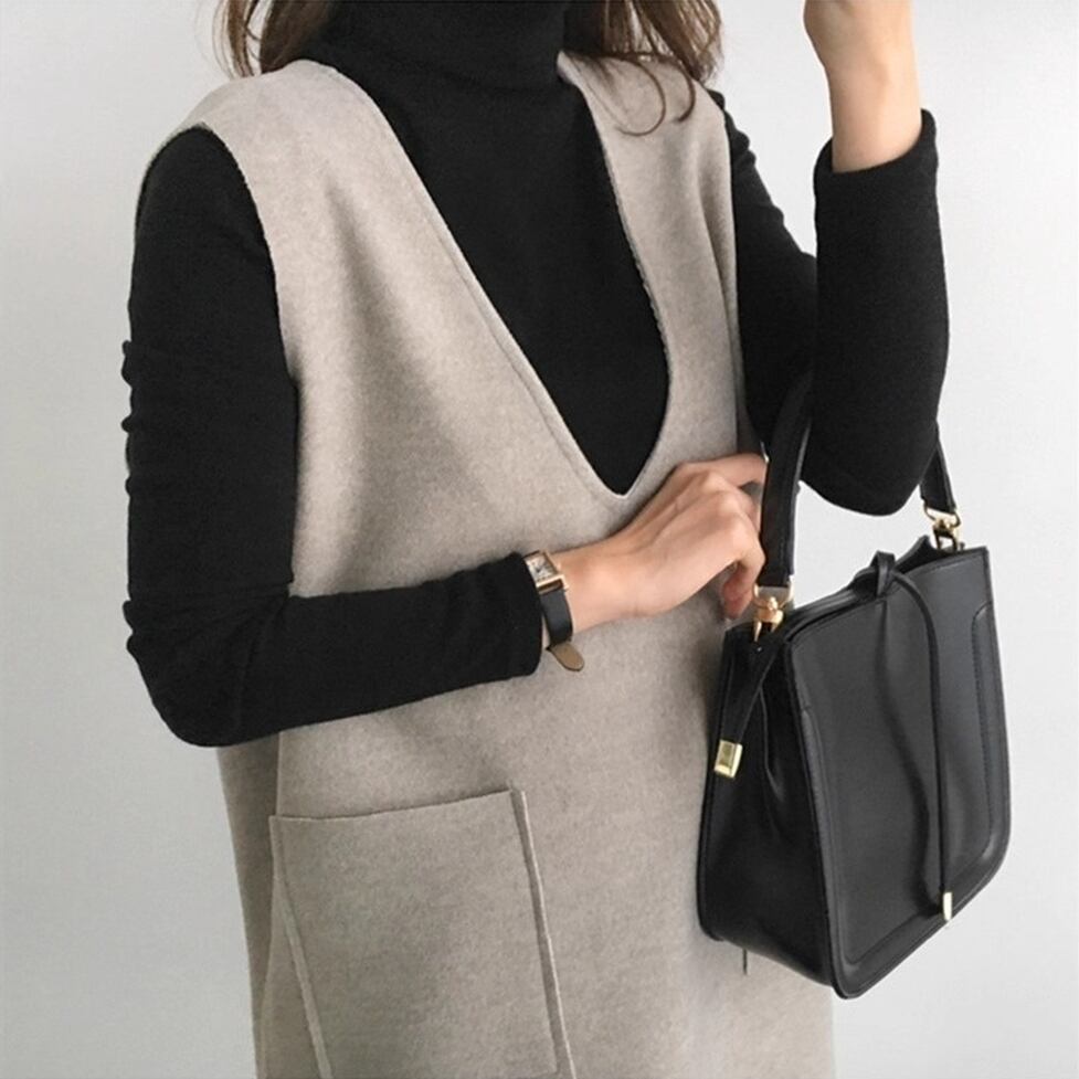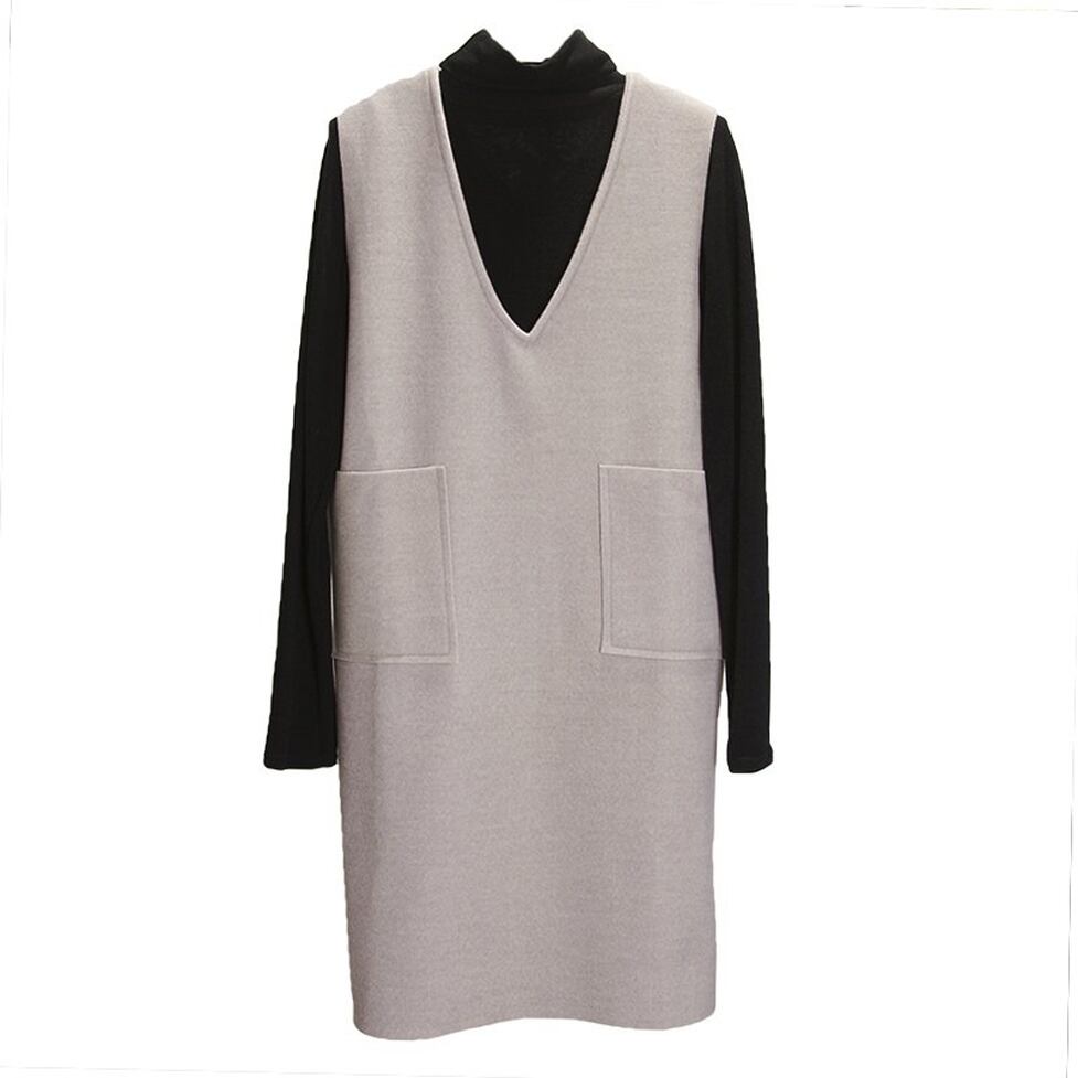 大人ガーリーなストレートジャンスカワンピとプレーンなトップスのセット。深めのVネックでデコルテラインを綺麗に演出するベストワンピース。大きなポケットがアクセントです。それぞれ単品でも使えてどんなアイテムと合わせてもマッチするシーンレスなアイテムです。