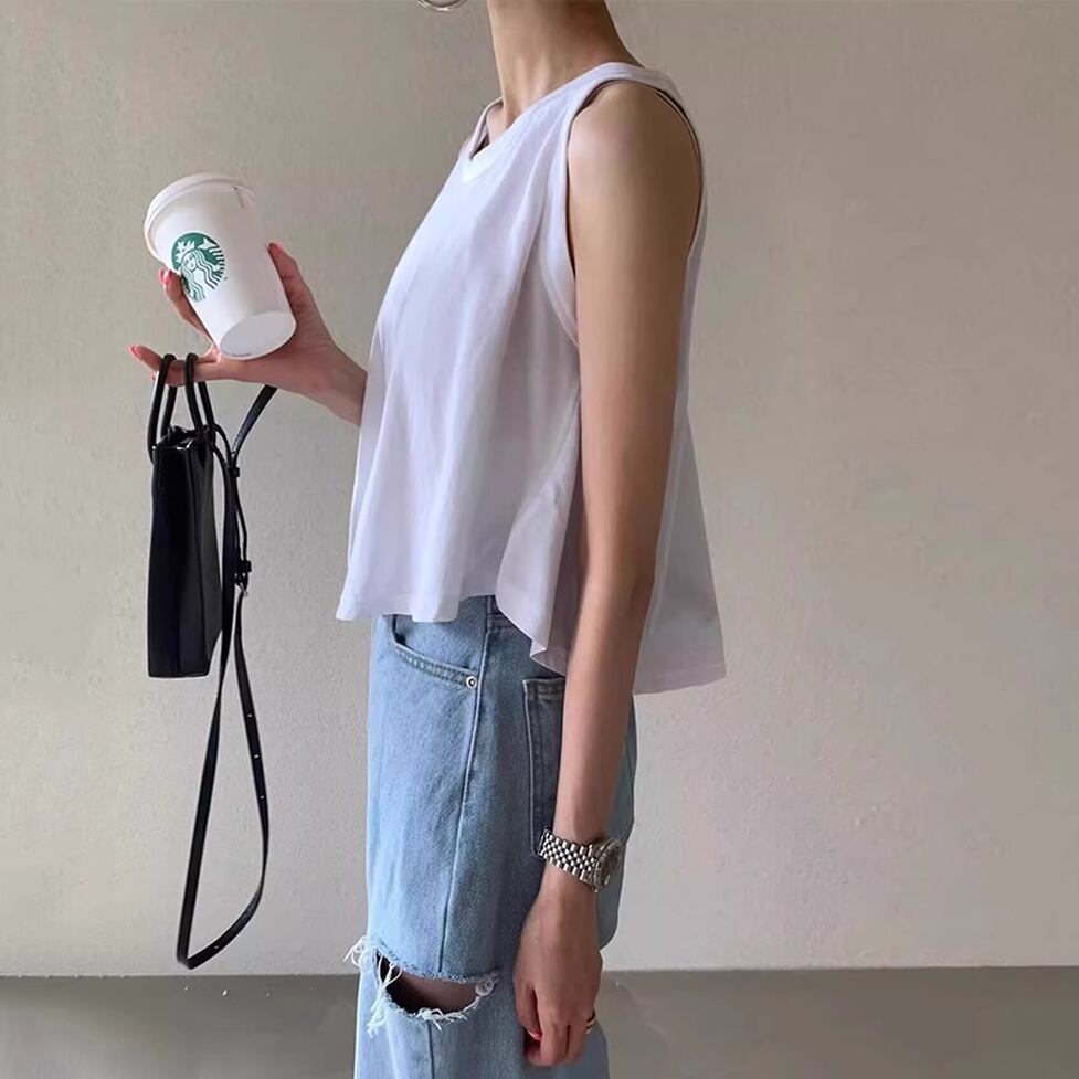シンプルながらもこだわりの詰まったデザインが魅力のタンクトップです。絶妙に広がるシルエットがポイント。フィット感がありつつも開放感も演出。短めの丈感がアクティブな印象を引き立てます。デニムやワイドパンツと合わせればこなれ感のあるカジュアルスタイルに。スカートやジャケットを羽織れば洗練された印象に仕上がります。