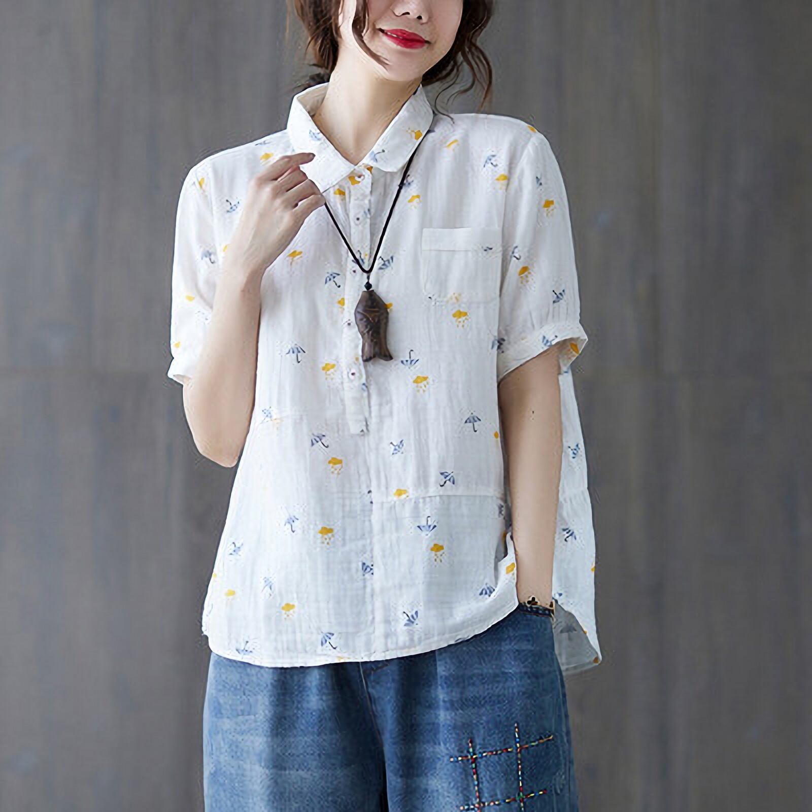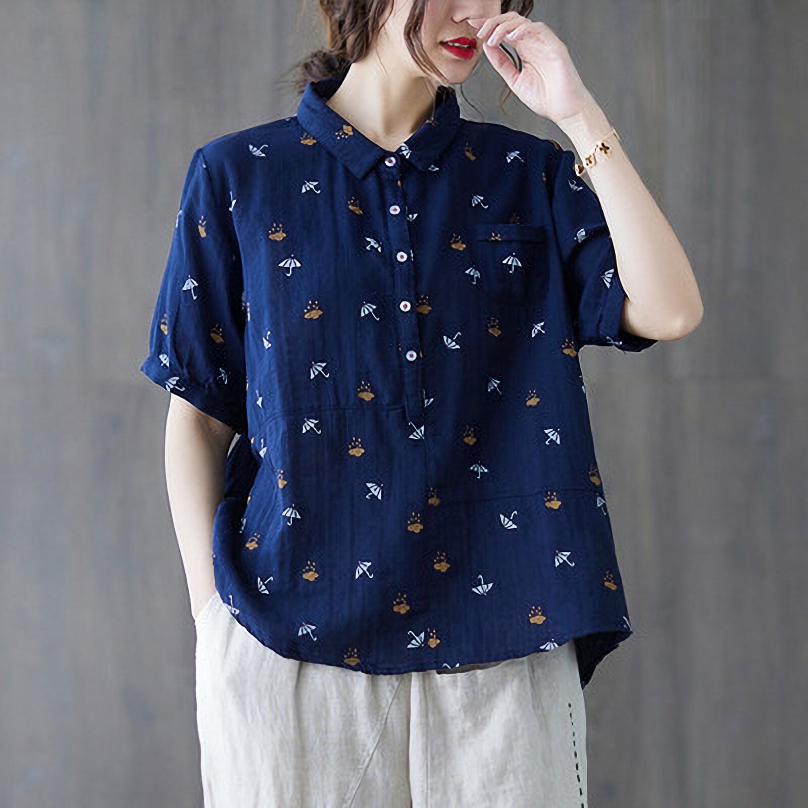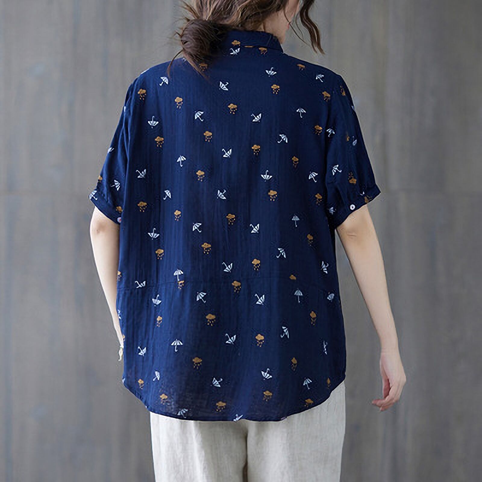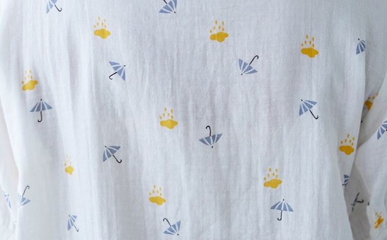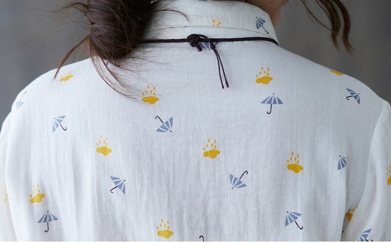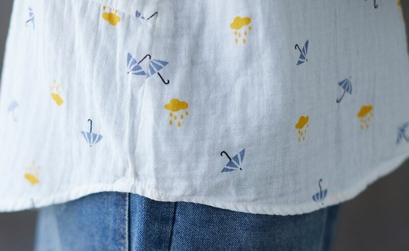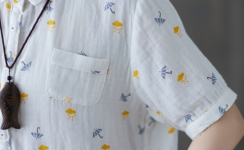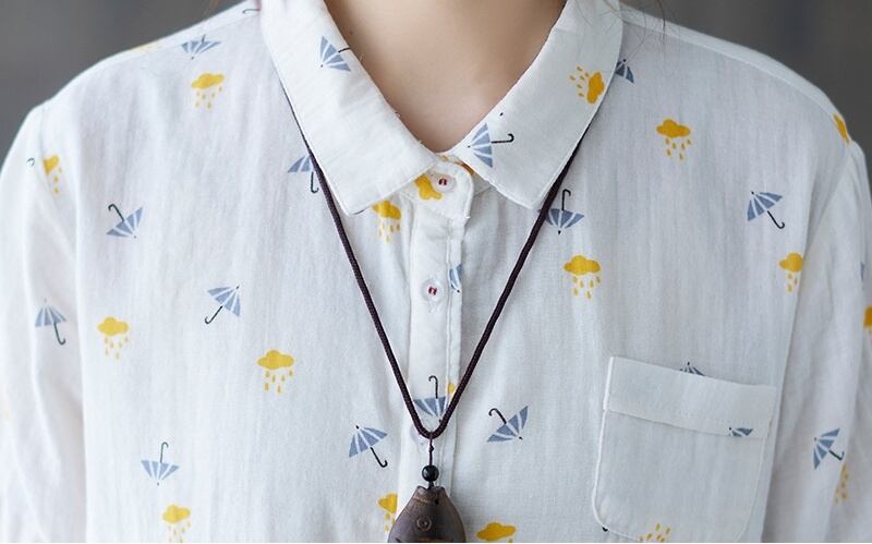 傘柄のデザインが特徴的で、甘さの中に大人の上品さを演出します。柔らかいコットン素材を使用しているため、さらっとした着心地で、特に春から夏の暑い季節にぴったりです。前開きのYシャツスタイルは、通学やショッピング、カフェでのひとときに欠かせない存在感を発揮します。