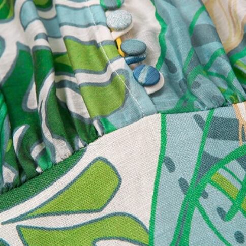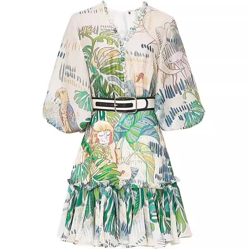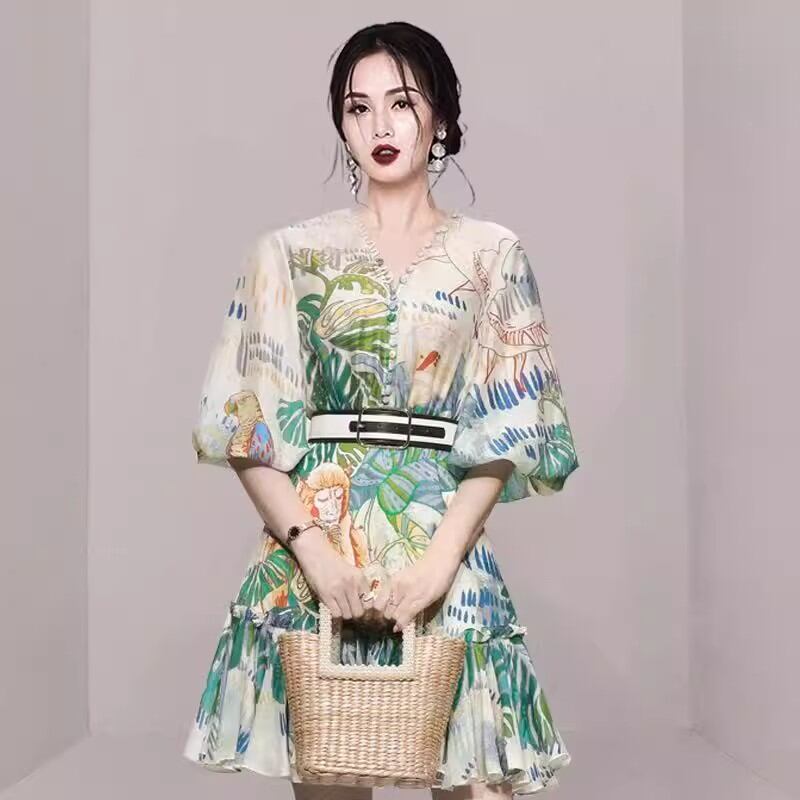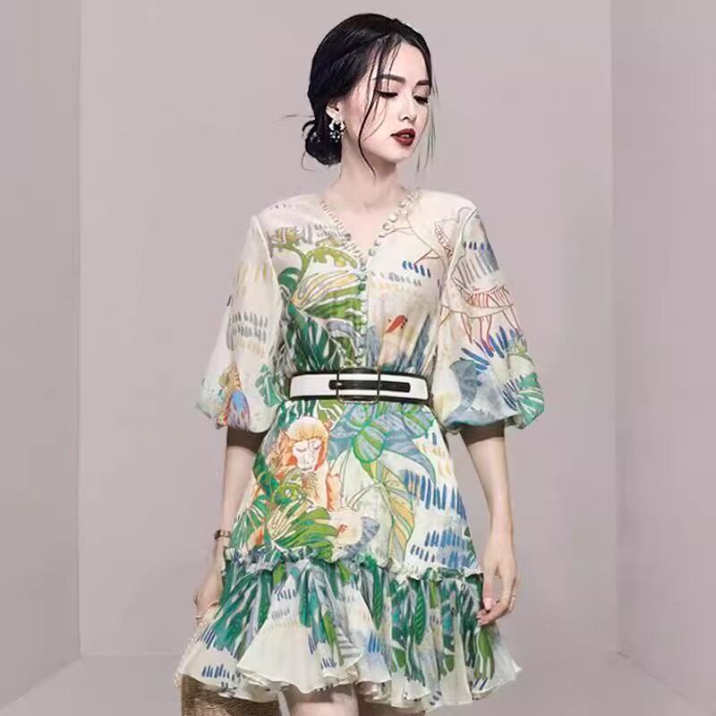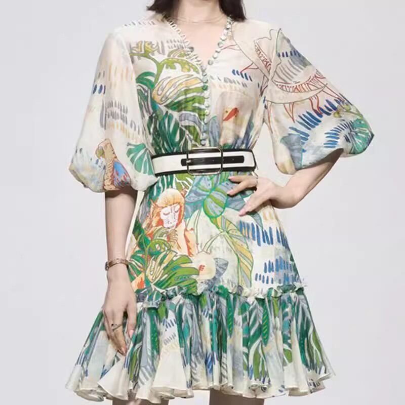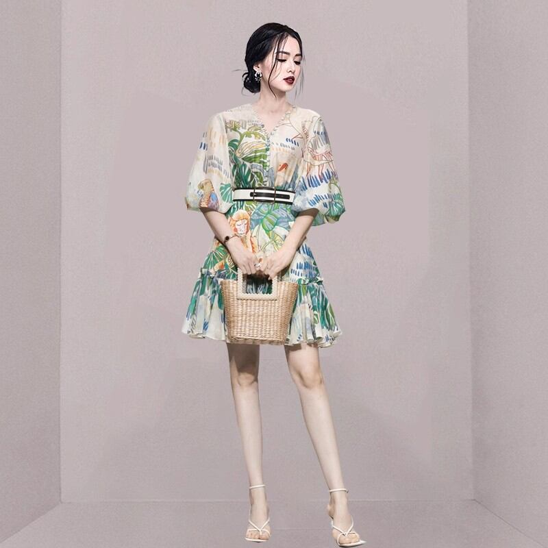 エキゾチックなリゾート柄が目を引くワンピース!ボリューム袖とVネックが大人可愛い印象を与えます。ショートな膝上丈は、お出かけやリゾートにぴったりの一着です。透け感のある薄手の生地が女性らしさを一層引き立てます。