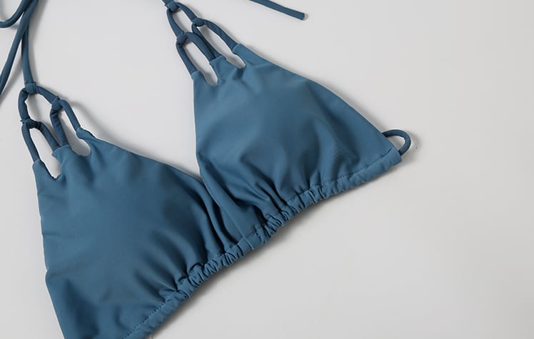 タンキニと紐の三角ビキニが組み合わさったこの上下セットは、ホルターネックスタイルでバックシャンなデザインがアクセントに。