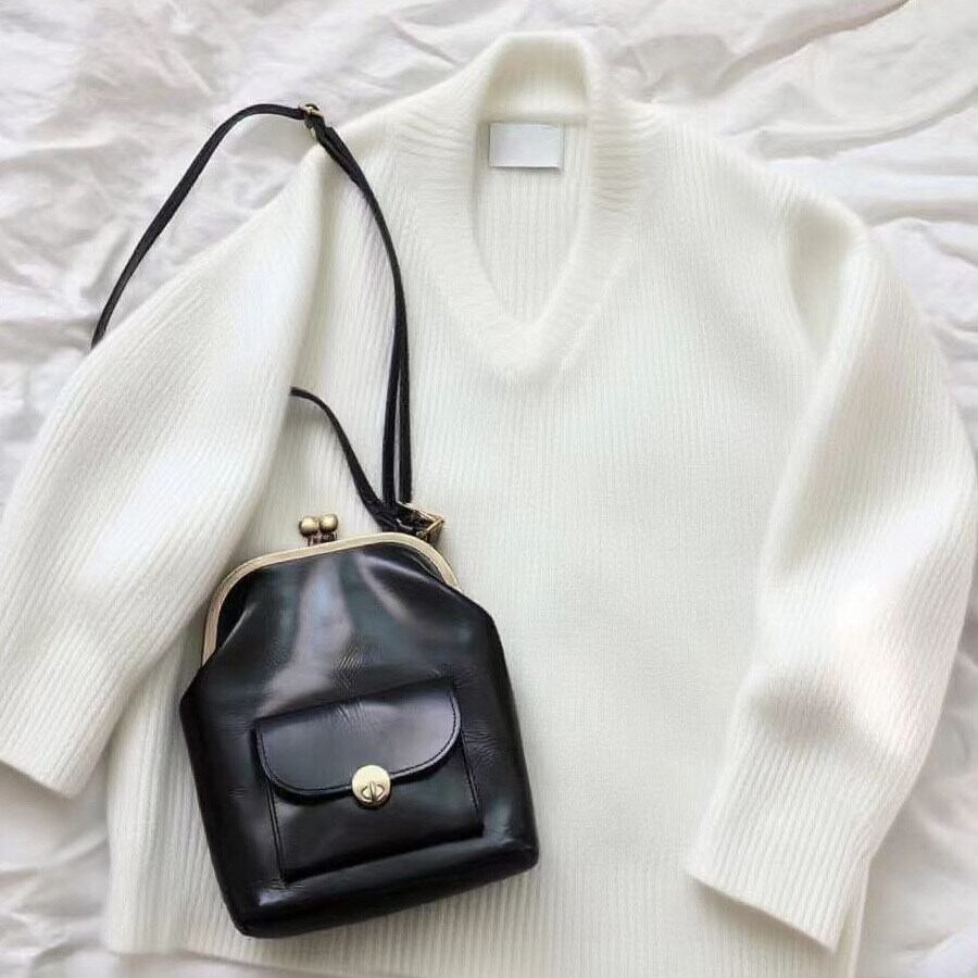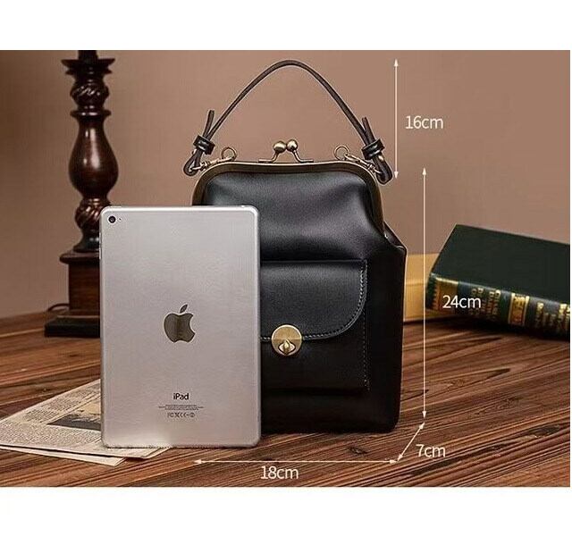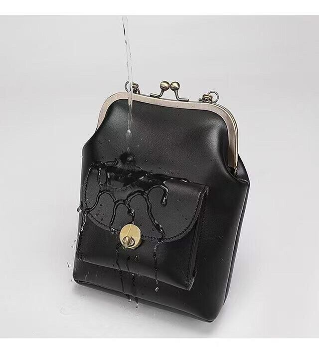 内部は大きく開くがま口デザインで、スマホやタブレット、コスメなどをすっきり収納できる実用性の高さが魅力です。