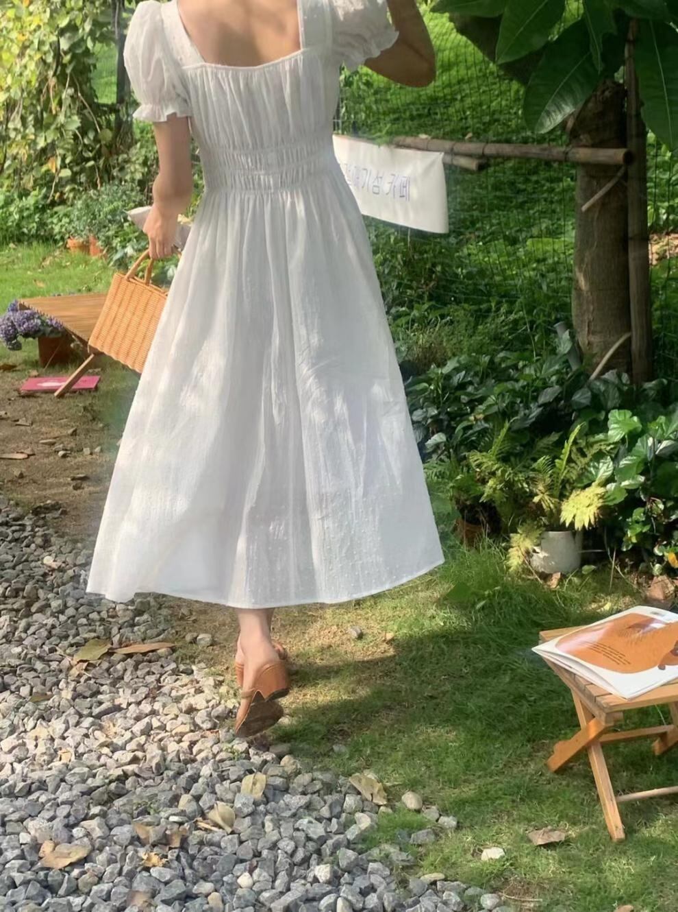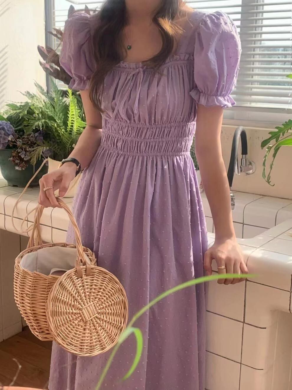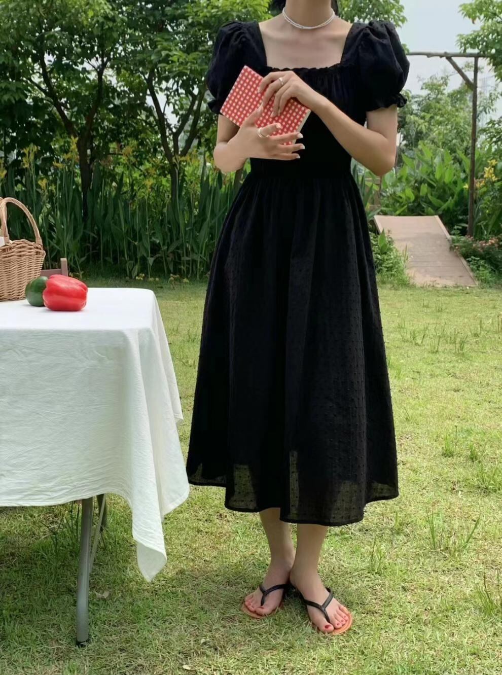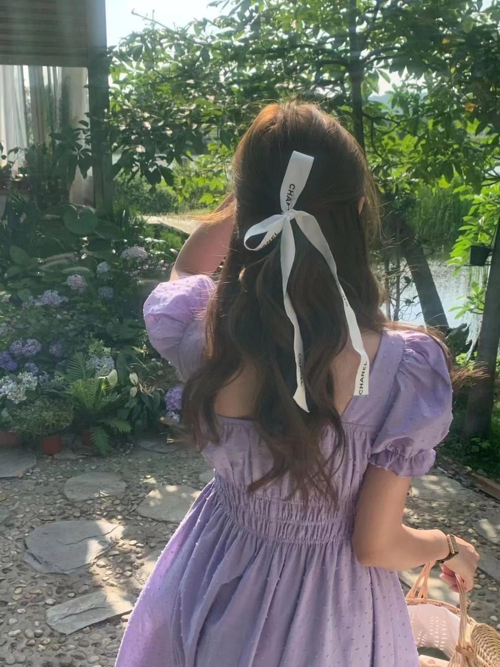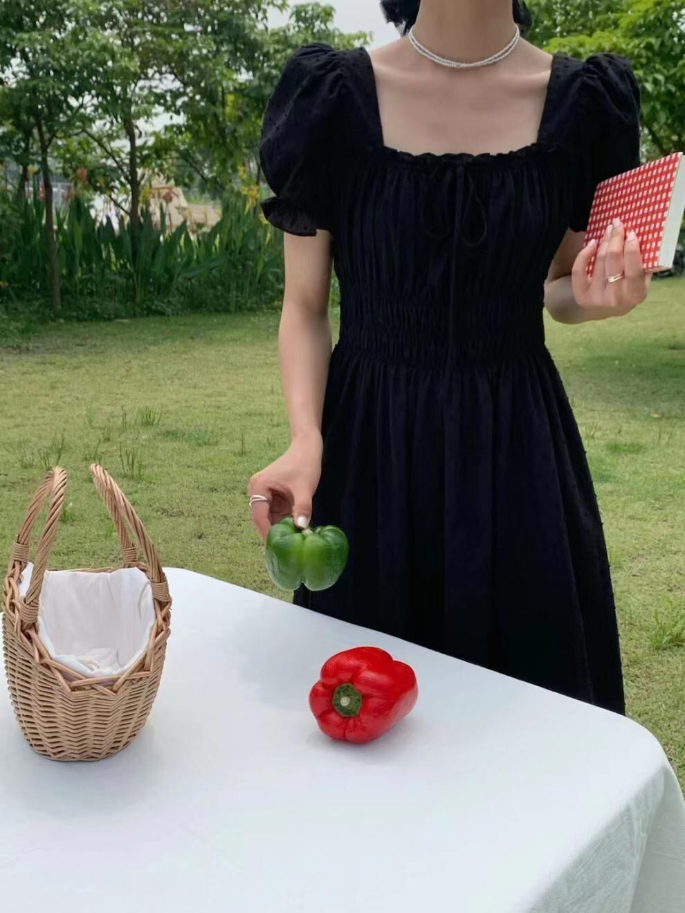 スクエアネックとパフスリーブが顔まわりを華やかに見せ、ウエストのシャーリングとリボンディテールで女性らしいシルエットを演出します。
