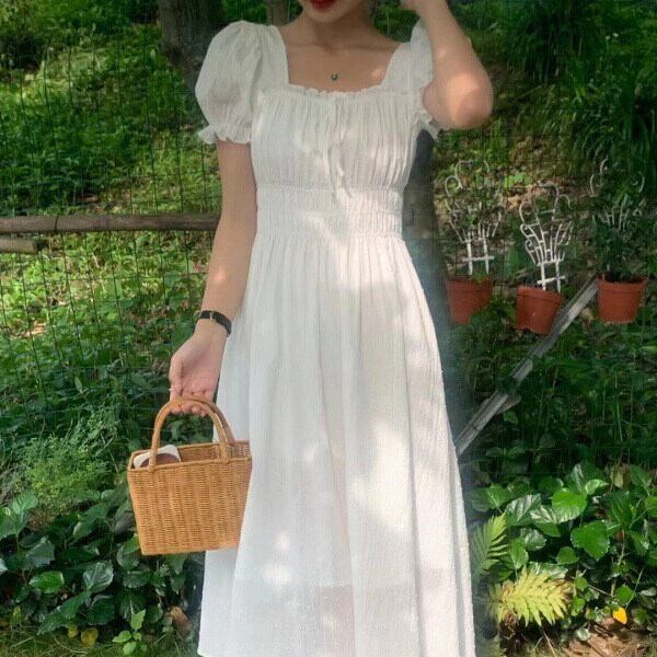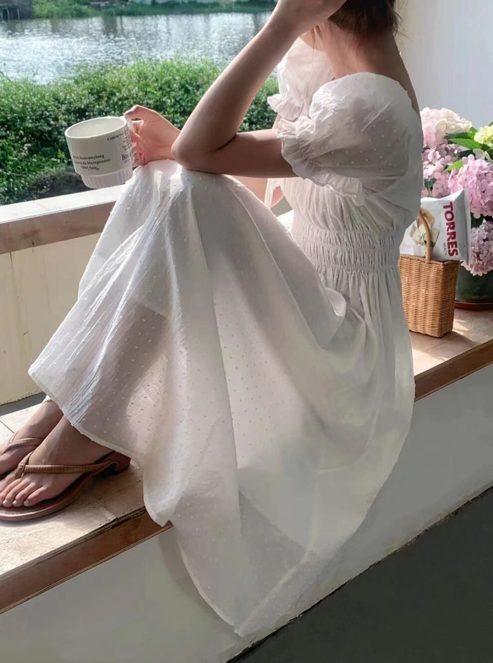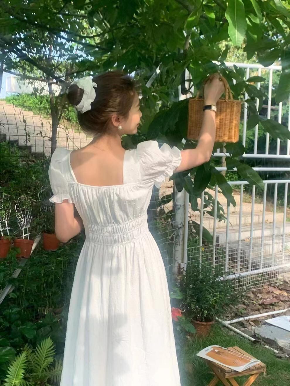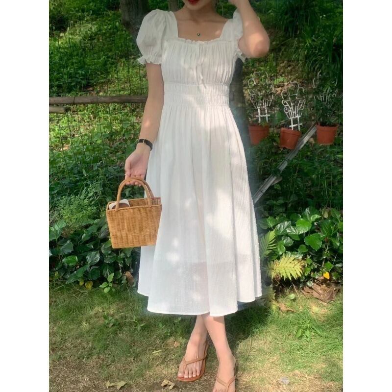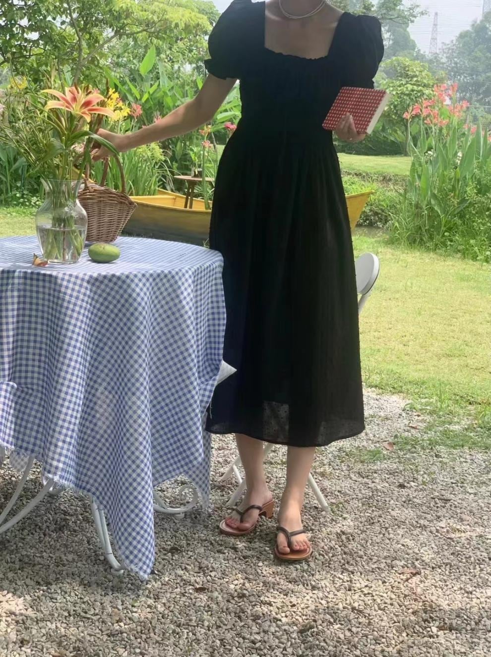 スクエアネックとパフスリーブが顔まわりを華やかに見せ、ウエストのシャーリングとリボンディテールで女性らしいシルエットを演出します。