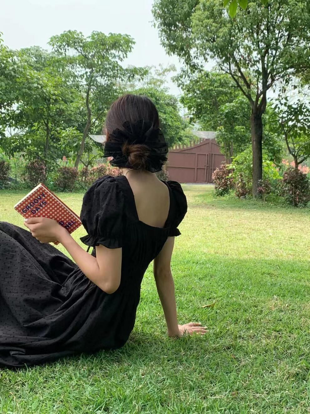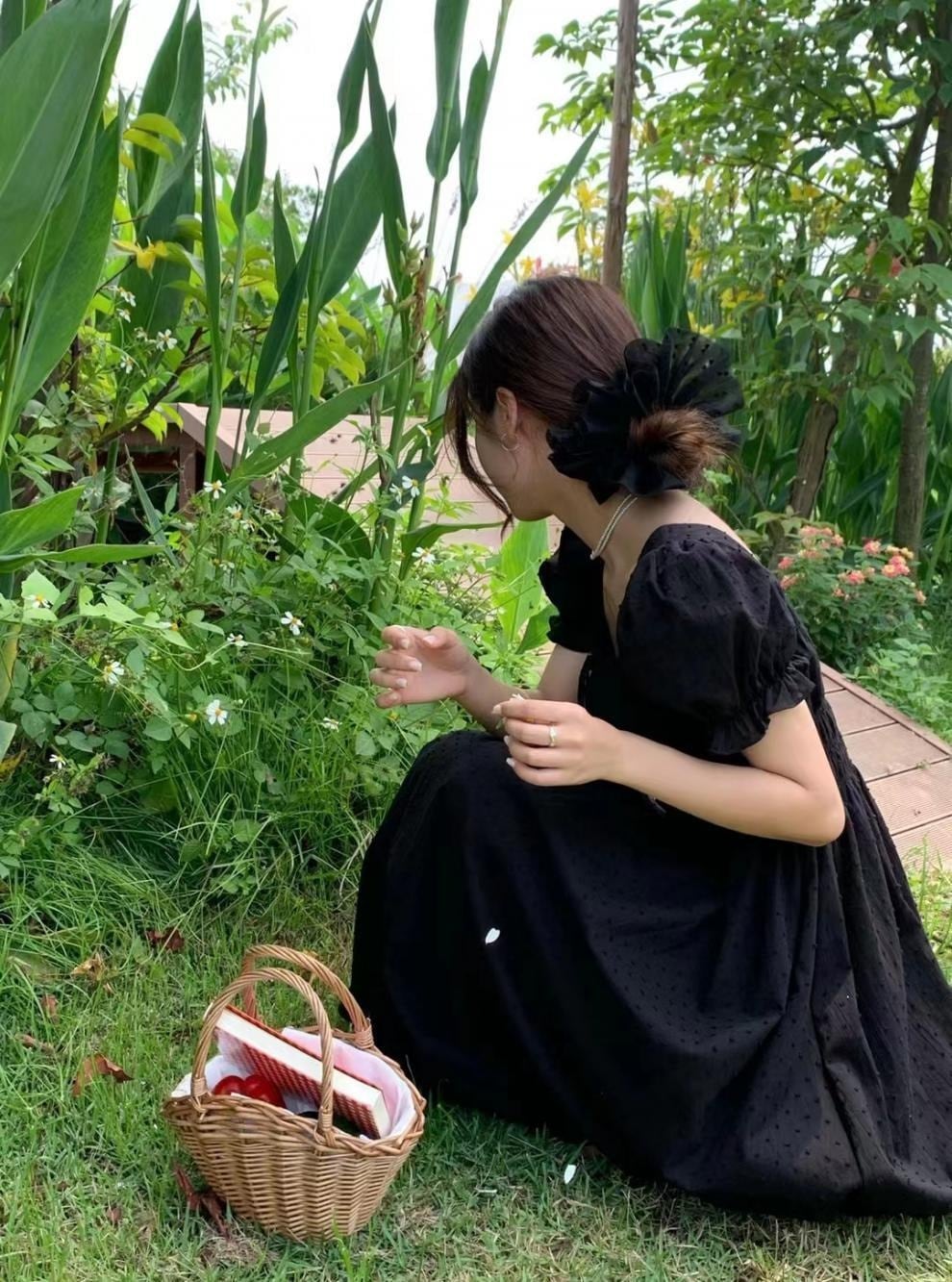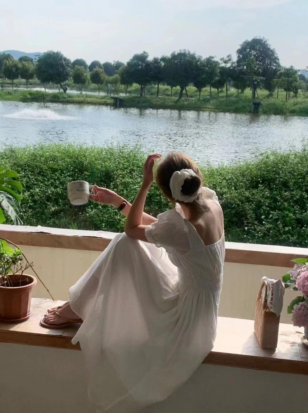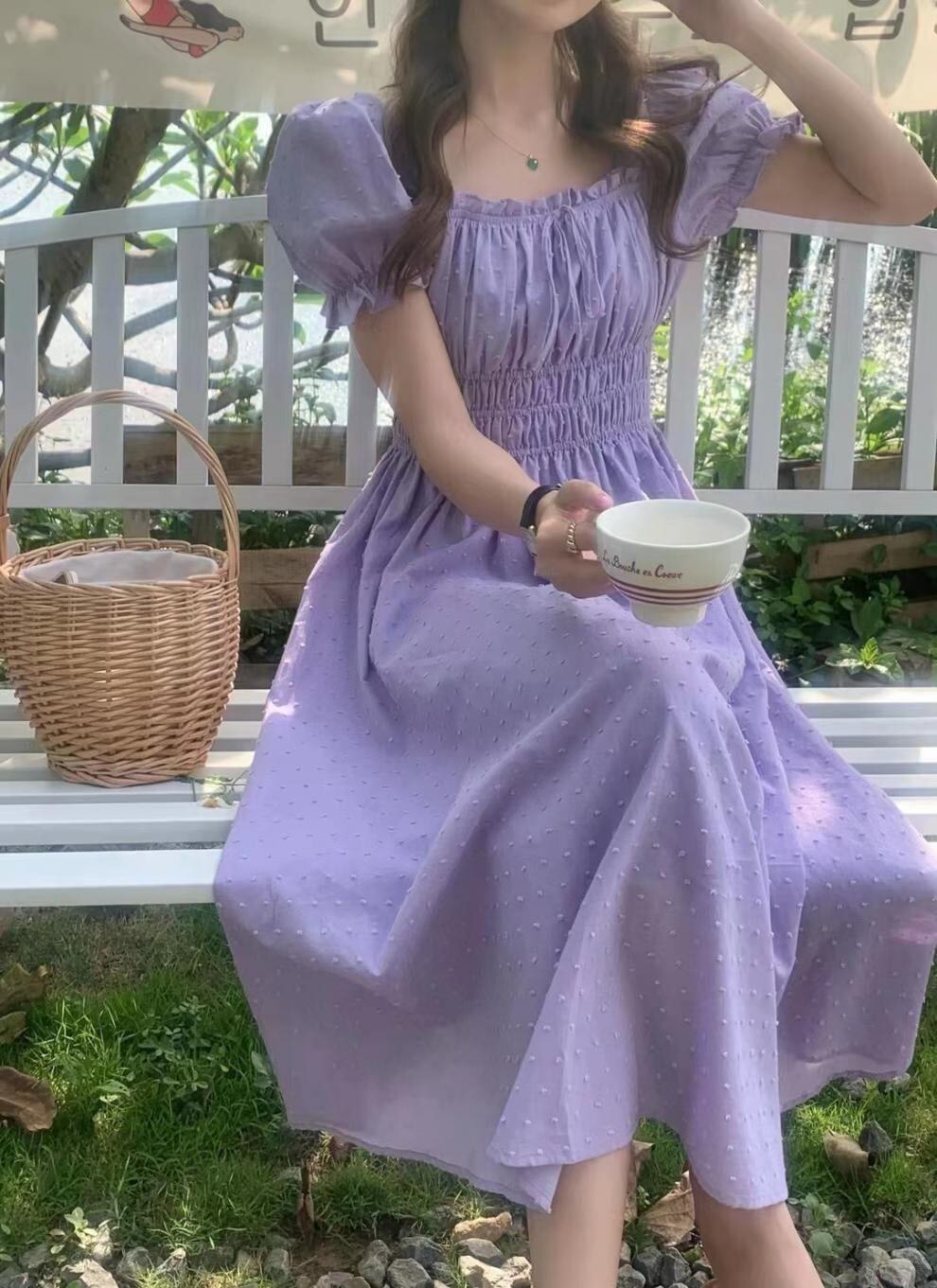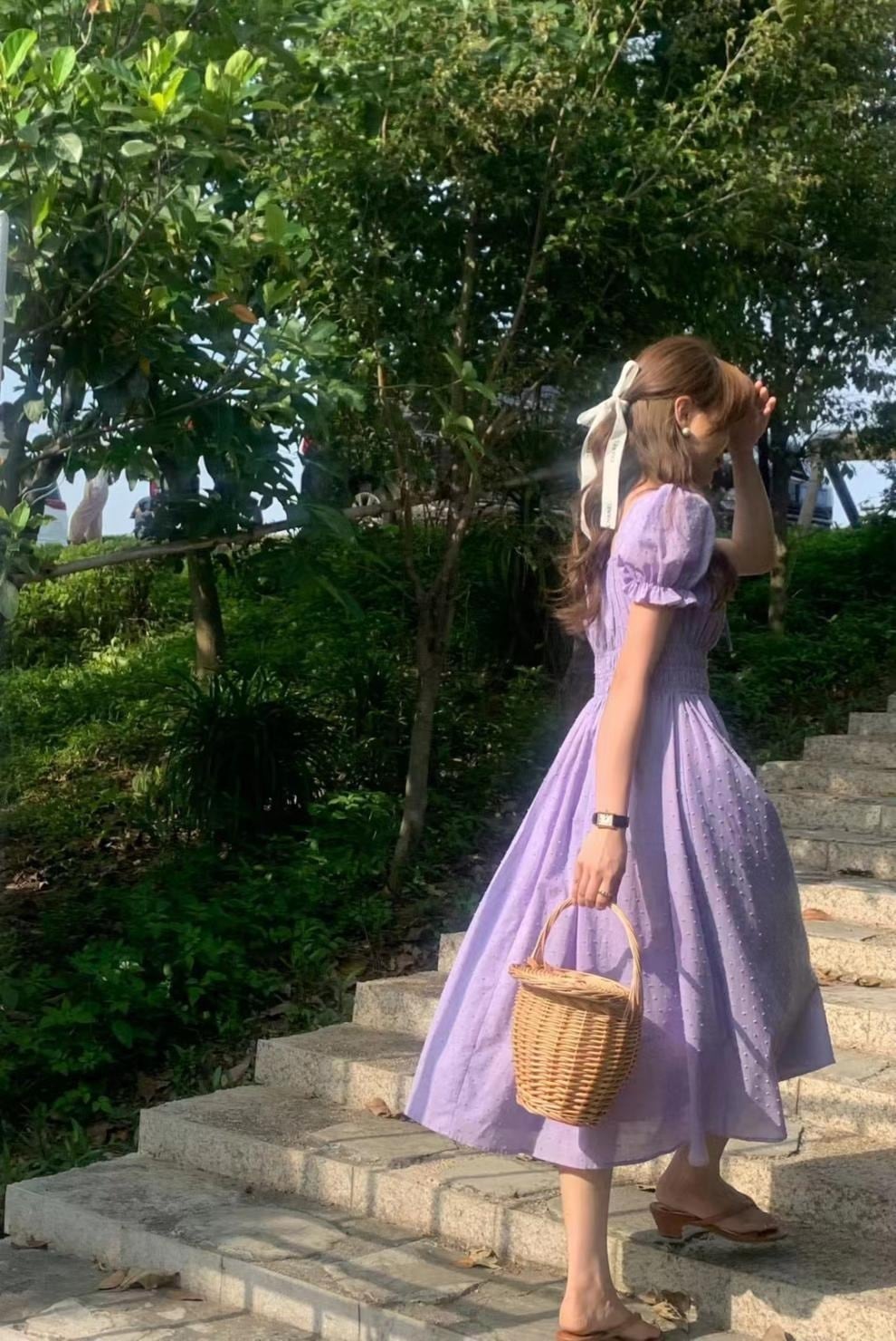 スクエアネックとパフスリーブが顔まわりを華やかに見せ、ウエストのシャーリングとリボンディテールで女性らしいシルエットを演出します。