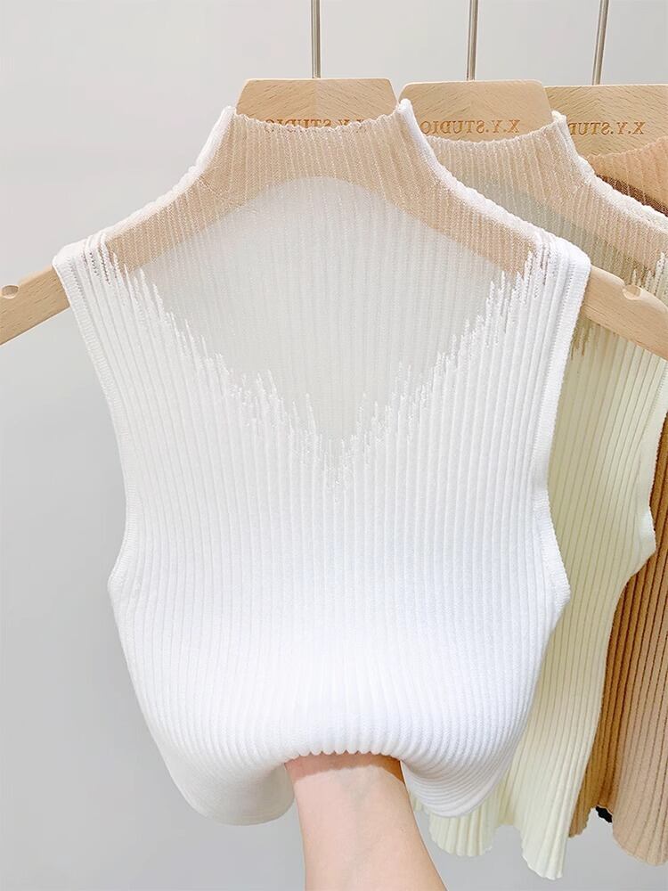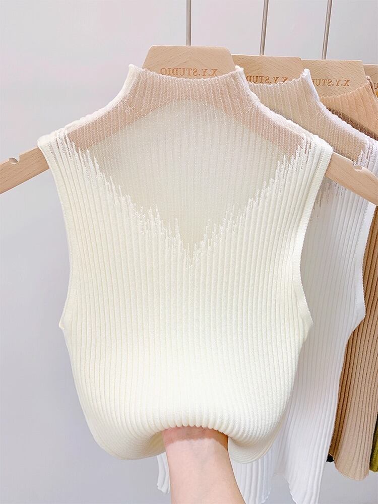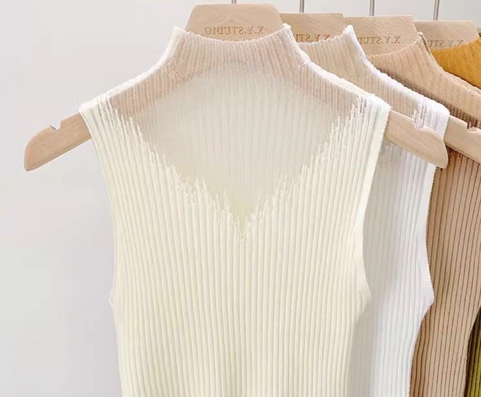 袖なしのノースリーブデザインが涼しげで、ハイネックの襟なしスタイルが上品さを演出します。