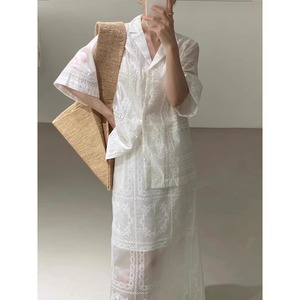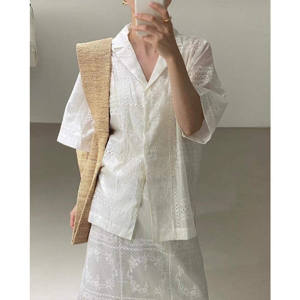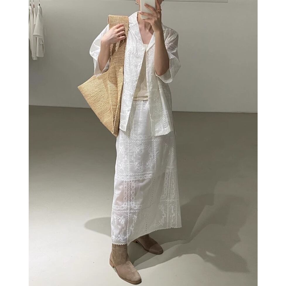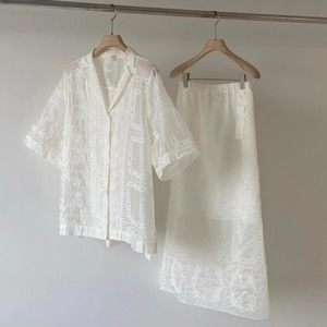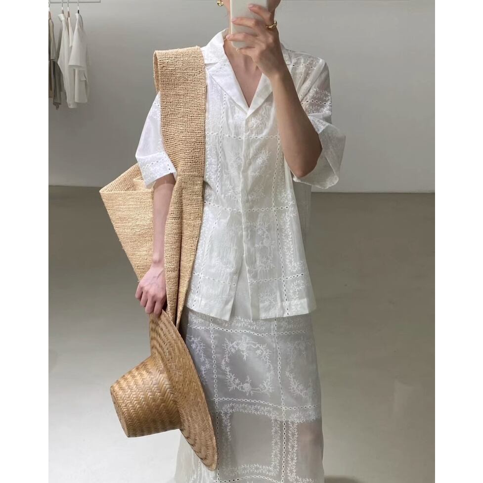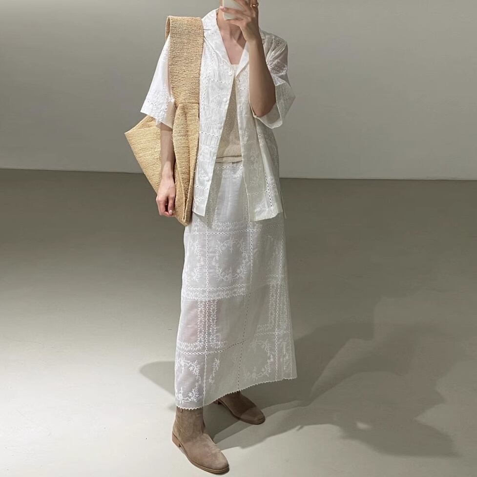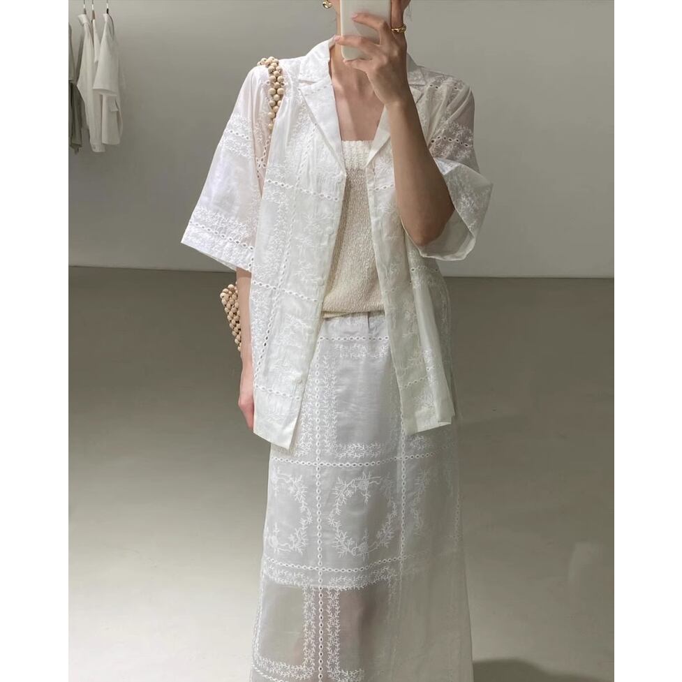 シアーなカットワークのシャツとスカートのセットアップ。大人のチャーミングな一面がきわ立つハンサムとフェミニンを両立。好感度の高い女っぽさに着地してスタイルアップも期待できる。色みをリンクさせた一体化がそれとなくドレスアップ。