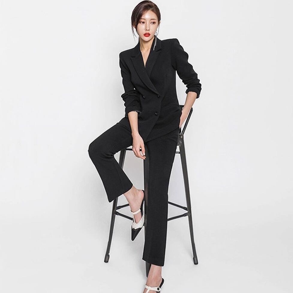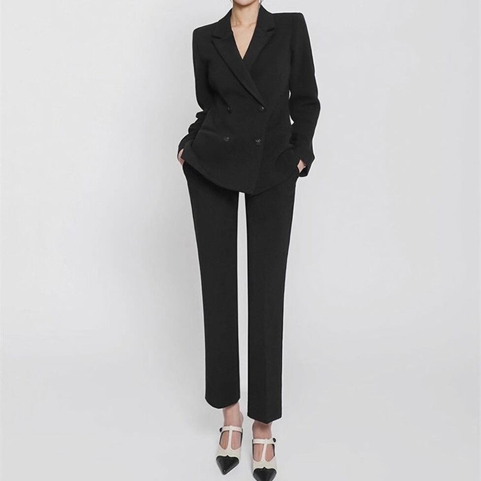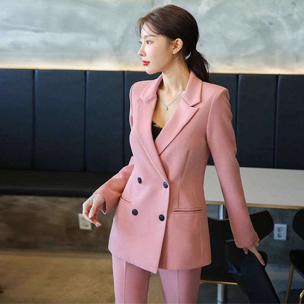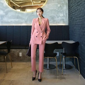 スタイリッシュなダブルジャケットとセンタープレスパンツのスーツ。浮かずに着回せるキレイな色は着方で遊んでもシックを保てる。きちんと感をあと押しする端正な落ち着きでハンサムに仕上げて。ほんのり甘くまろやかながら洗練された印象はキープ。