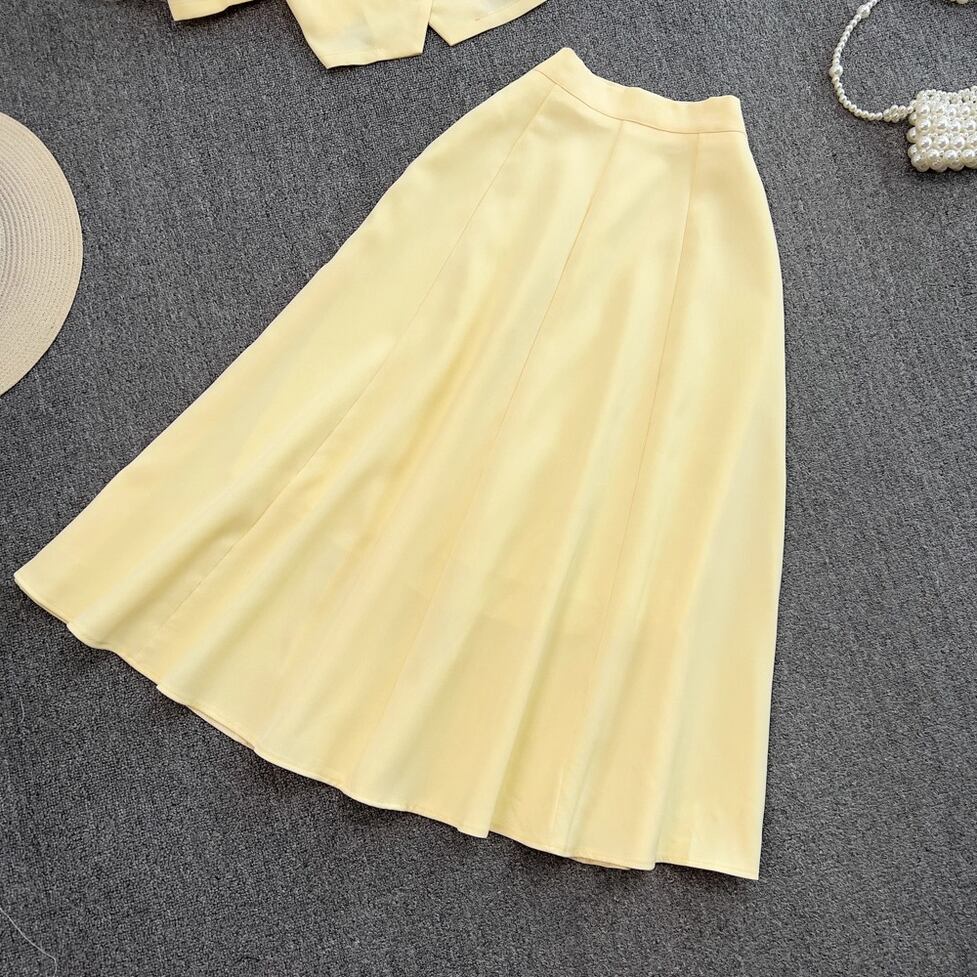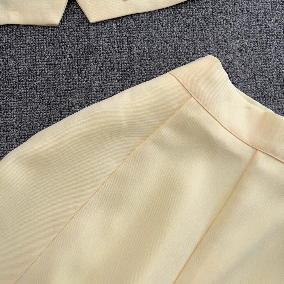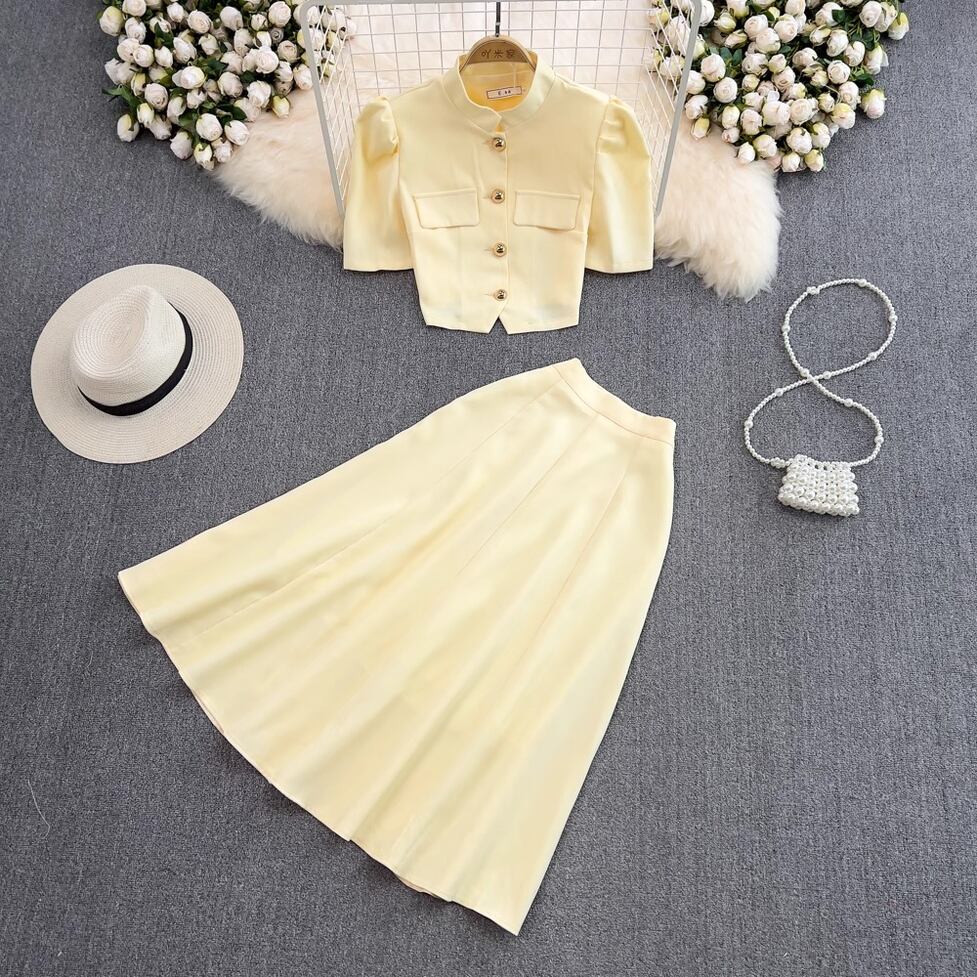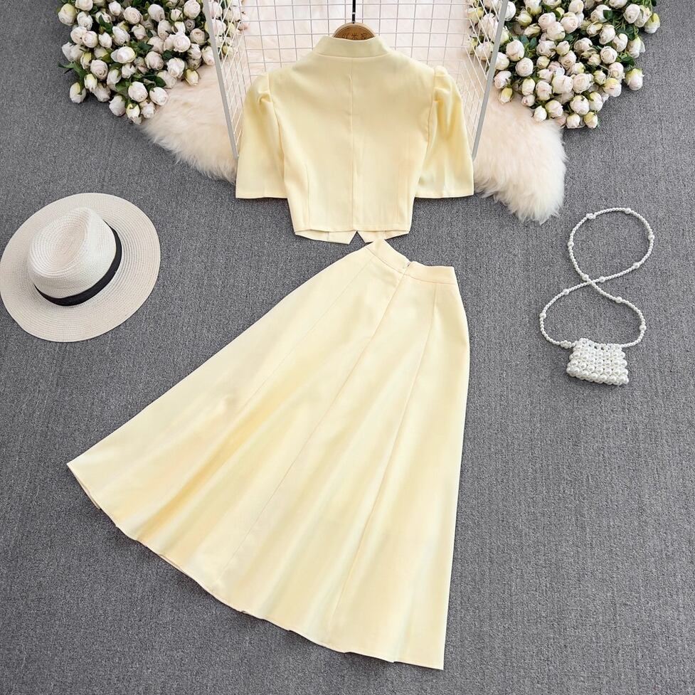 レトロな雰囲気でムードを盛り上げるスカートセットアップ。大人のチャーミングな一面がきわ立つハンサムとフェミニンを両立。好感度の高い女っぽさに着地してスタイルアップも期待できる。色みをリンクさせた一体化がそれとなくドレスアップ。