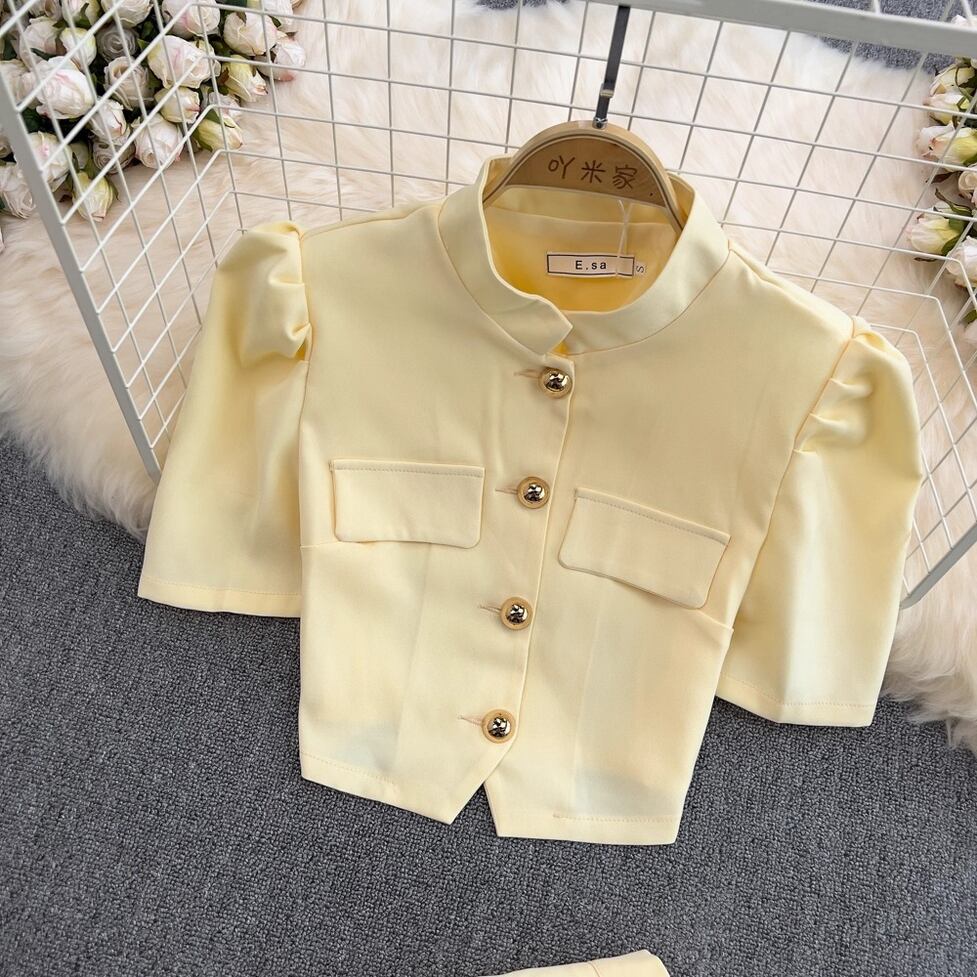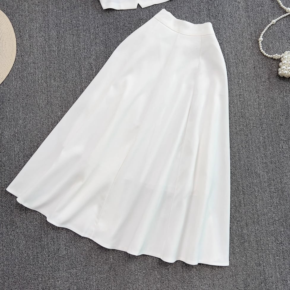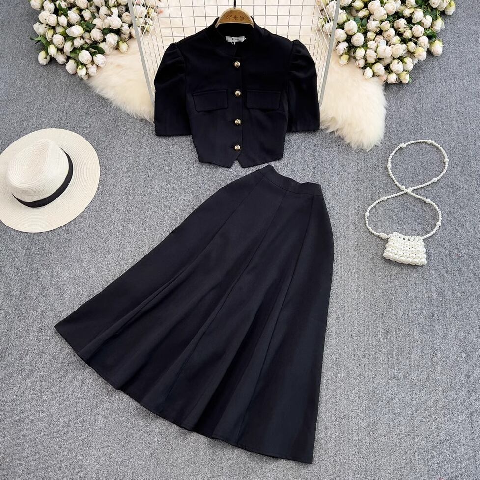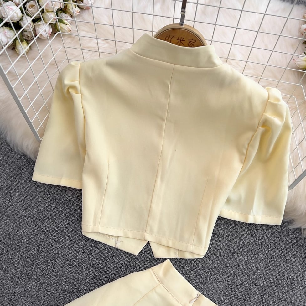 レトロな雰囲気でムードを盛り上げるスカートセットアップ。大人のチャーミングな一面がきわ立つハンサムとフェミニンを両立。好感度の高い女っぽさに着地してスタイルアップも期待できる。色みをリンクさせた一体化がそれとなくドレスアップ。