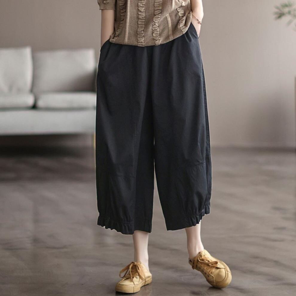 裾ギャザーが魅力のクロップド丈ワイドパンツ。