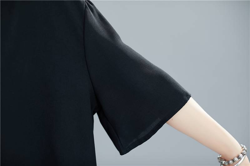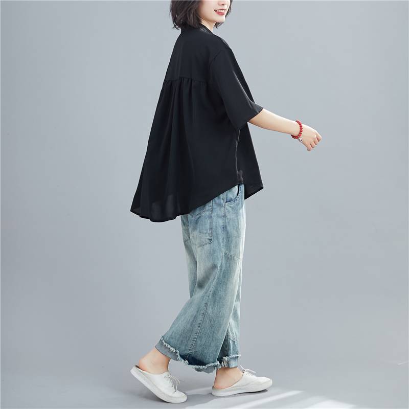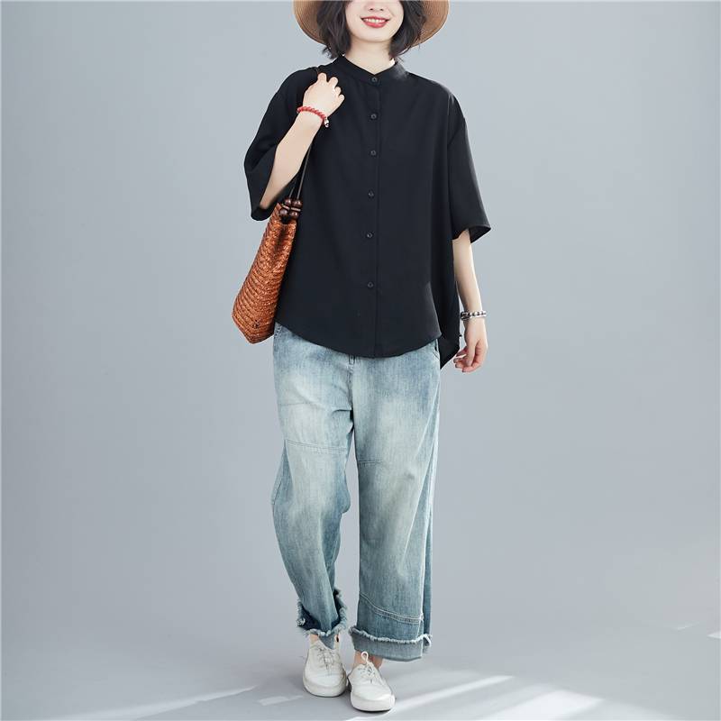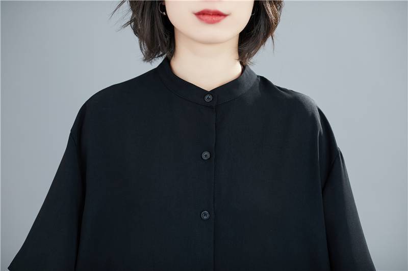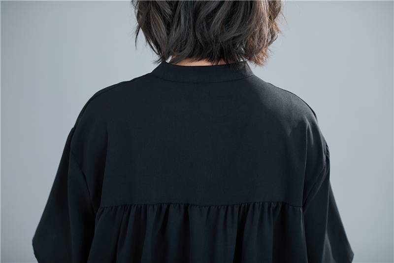 前開きのデザインと5分袖が、リラックスしたスタイルを演出します。ドロップショルダーのシルエットは、ゆったりとした着心地を提供し、体型カバーにも役立ちます。ワイドな身幅とアシンメトリーなデザインは、着る人にこなれ感とフェミニンな印象をプラスします。