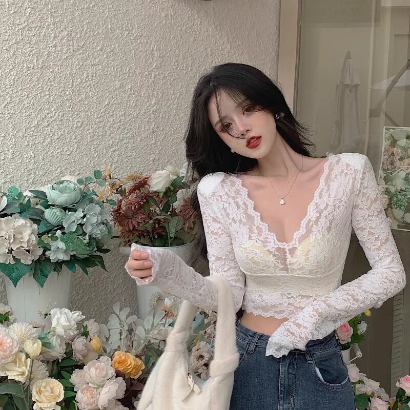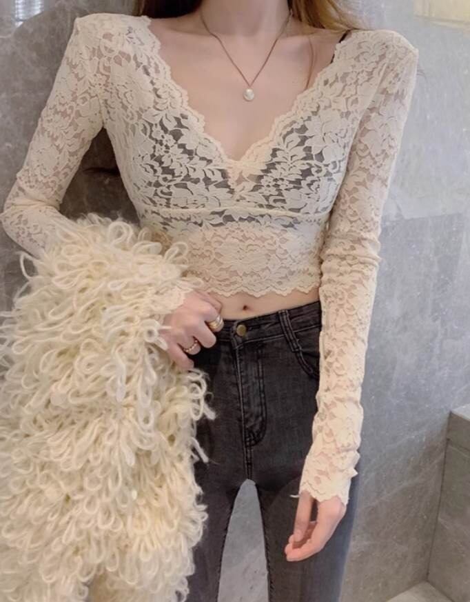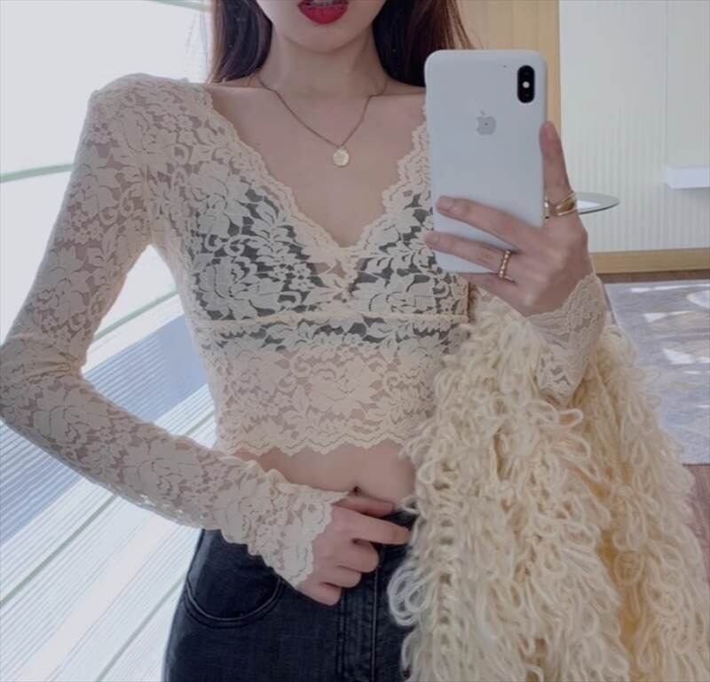薄手の透け感のある素材感を活かし、へそが見えるほどのショート丈もセクシーさを際立てます。