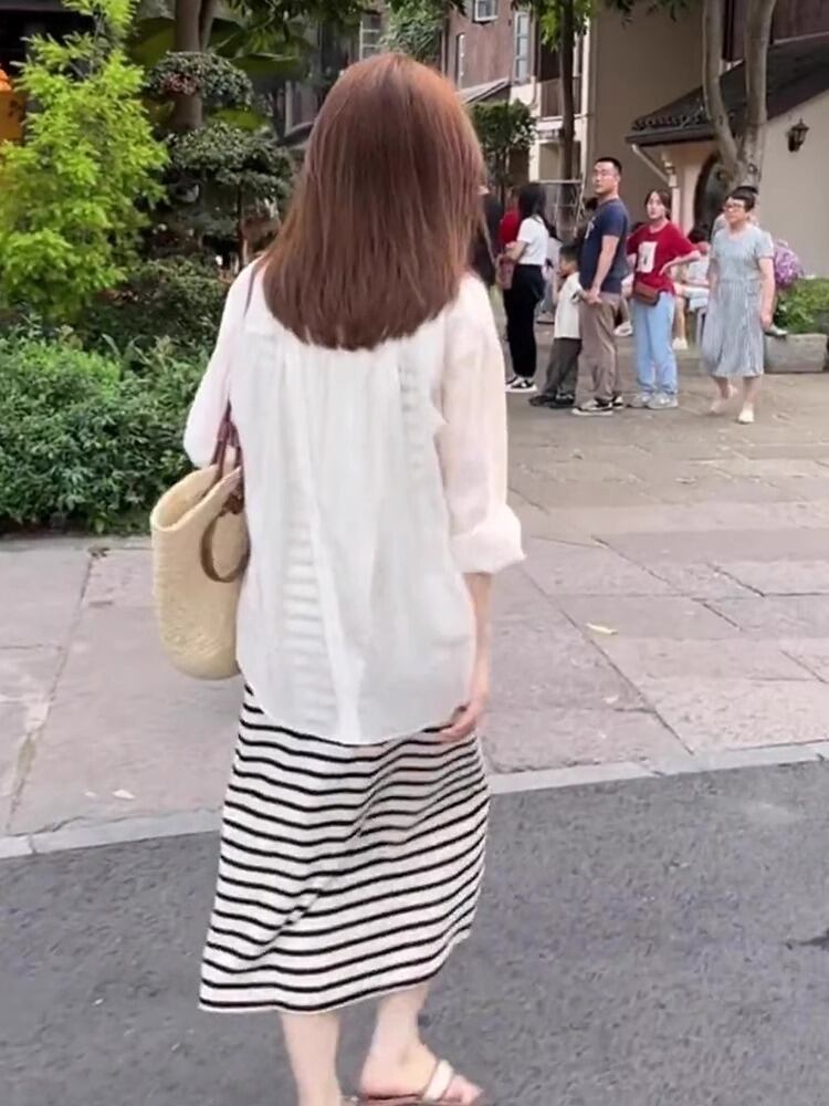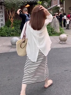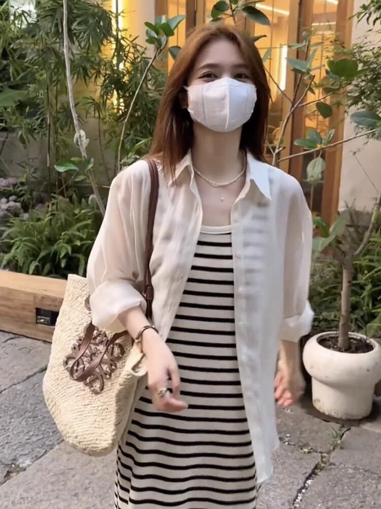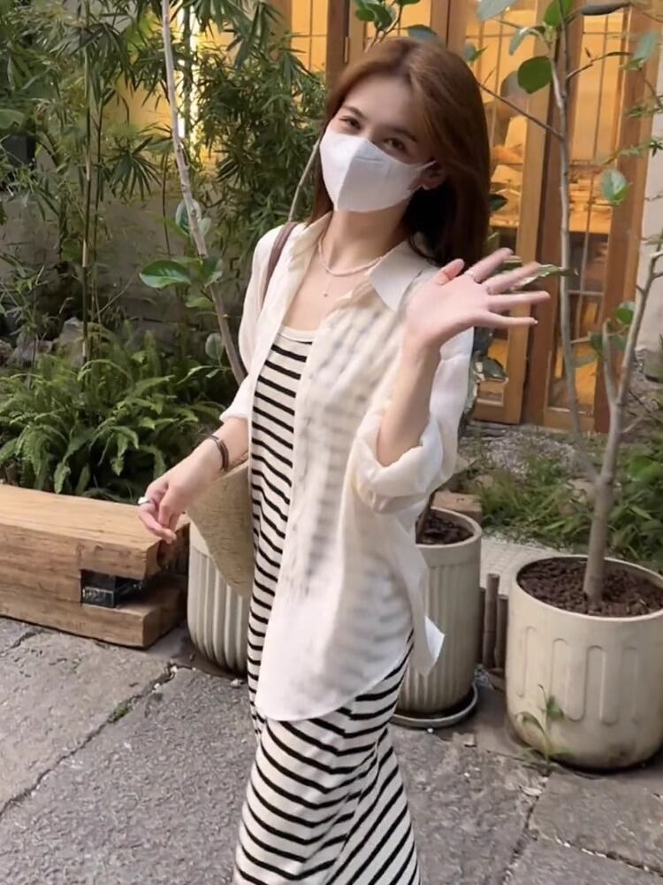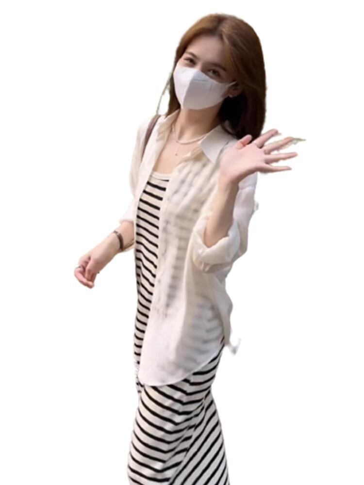 ボーダーのノースリーブワンピースと薄手の長袖シャツを合わせたデザインで、着心地も軽やか。特に春夏秋とロングシーズンにわたって楽しめるアイテムです。