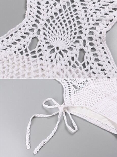 華やかさと大人の抜け感を兼ね備えたホルターネックのモノキニ水着。リボンとニットレースの上品なデザインが、ナチュラルながらも女性らしさを際立たせます。
