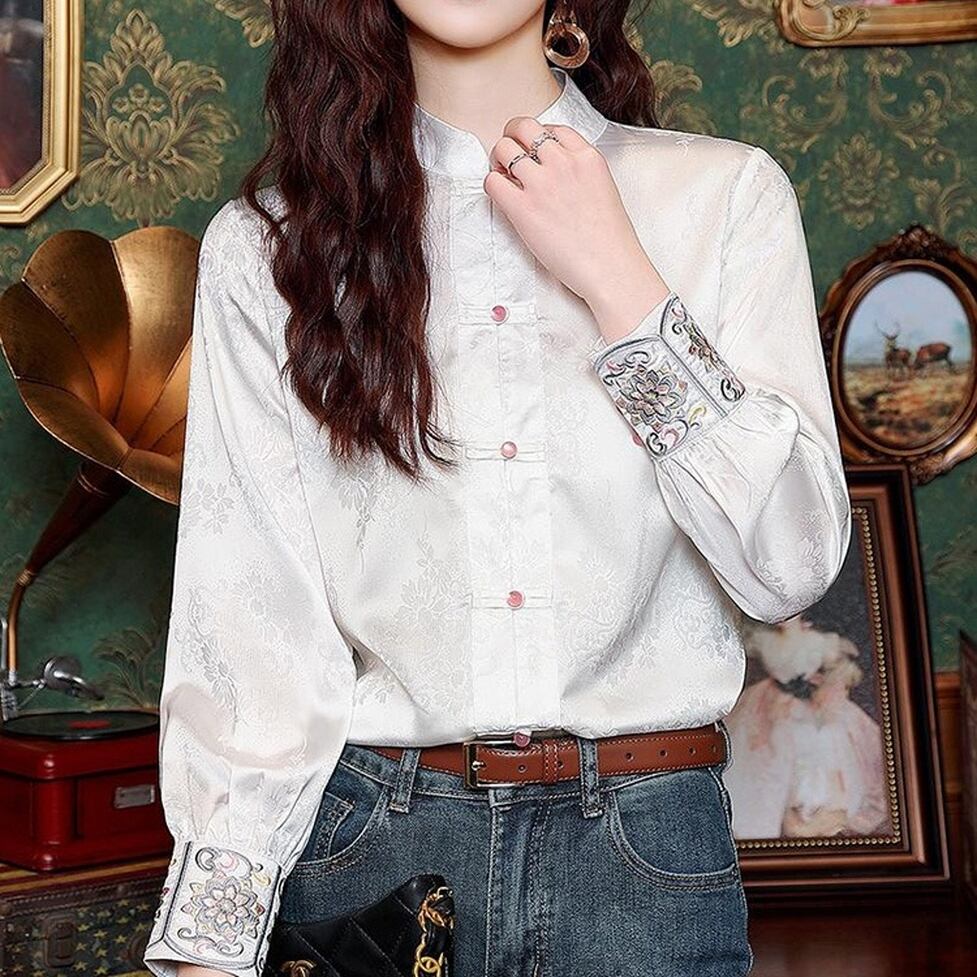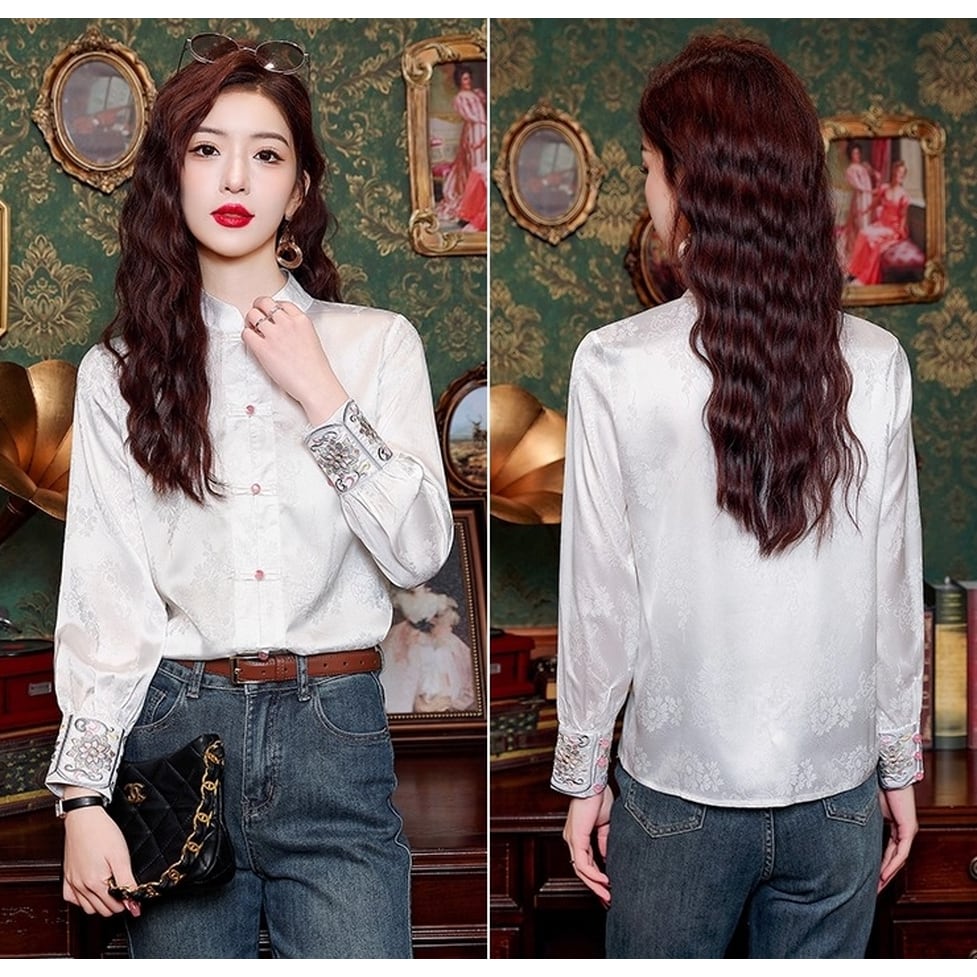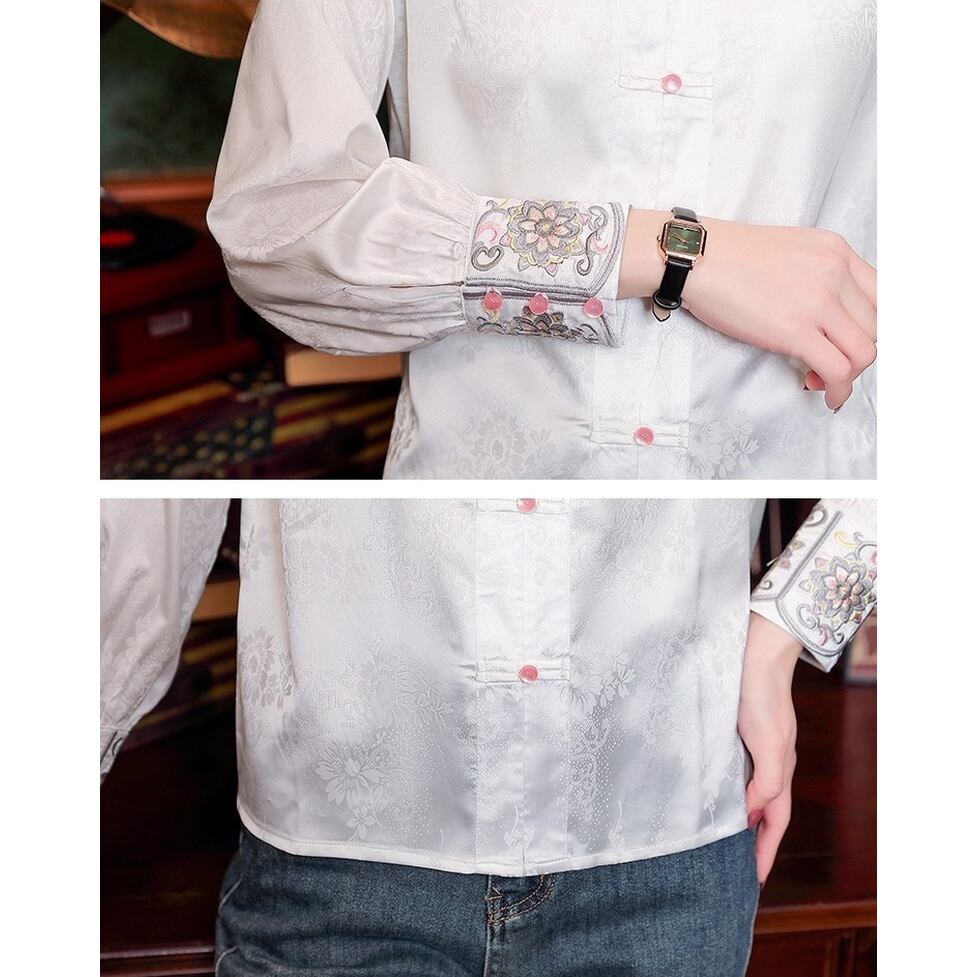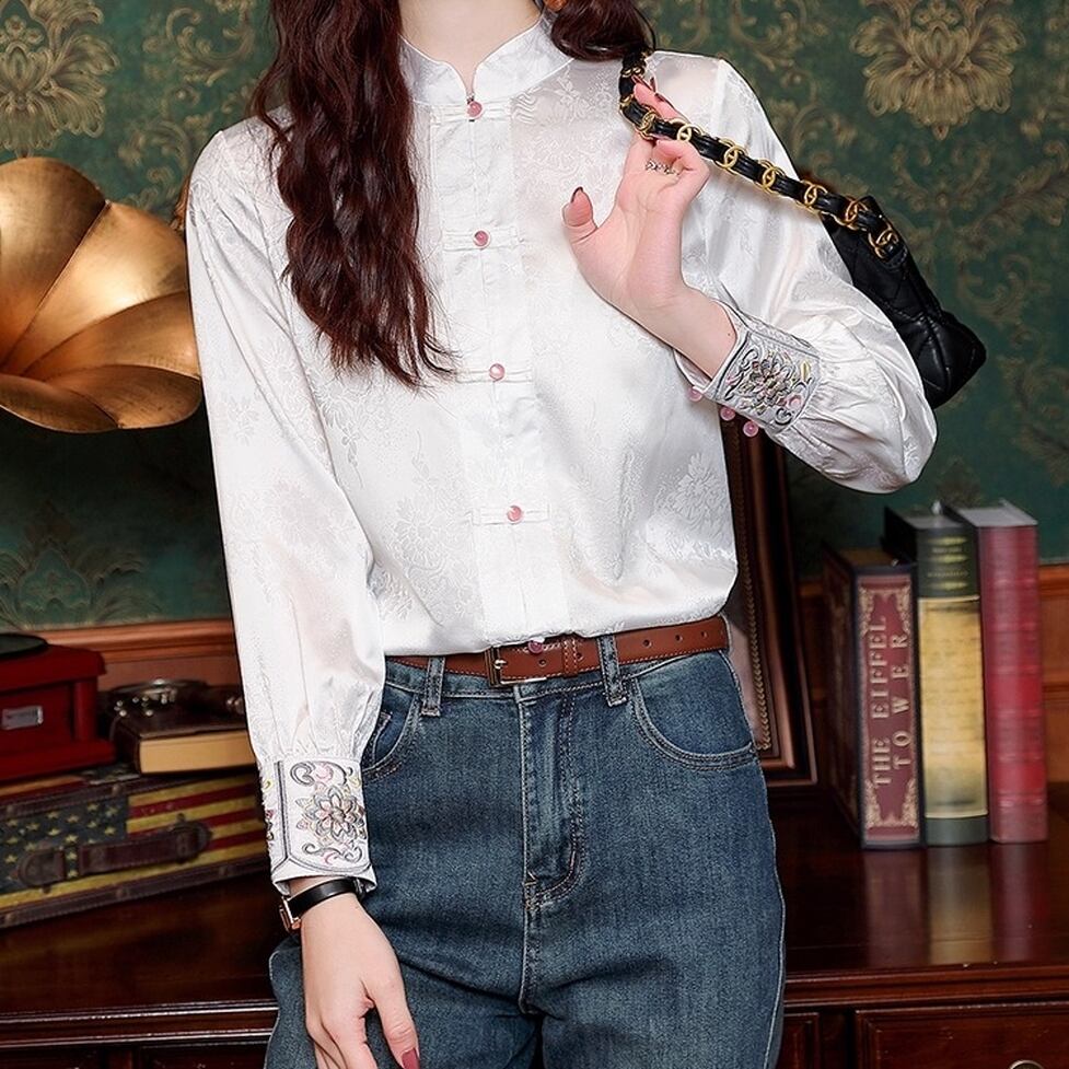上品な光沢のある生地に繊細な刺繍が施されたエレガントなチャイナカラーのブラウス。伝統的なデザインにモダンなエッセンスを加え洗練された雰囲気を演出。ボタンディテールがアクセントに。可愛らしいデザインながらも上品な印象を与えてくれます。普段使いはもちろん特別な日にも着たくなるようなアイテムです。