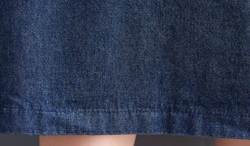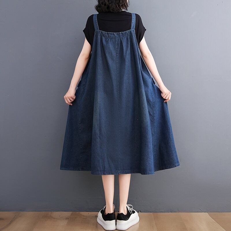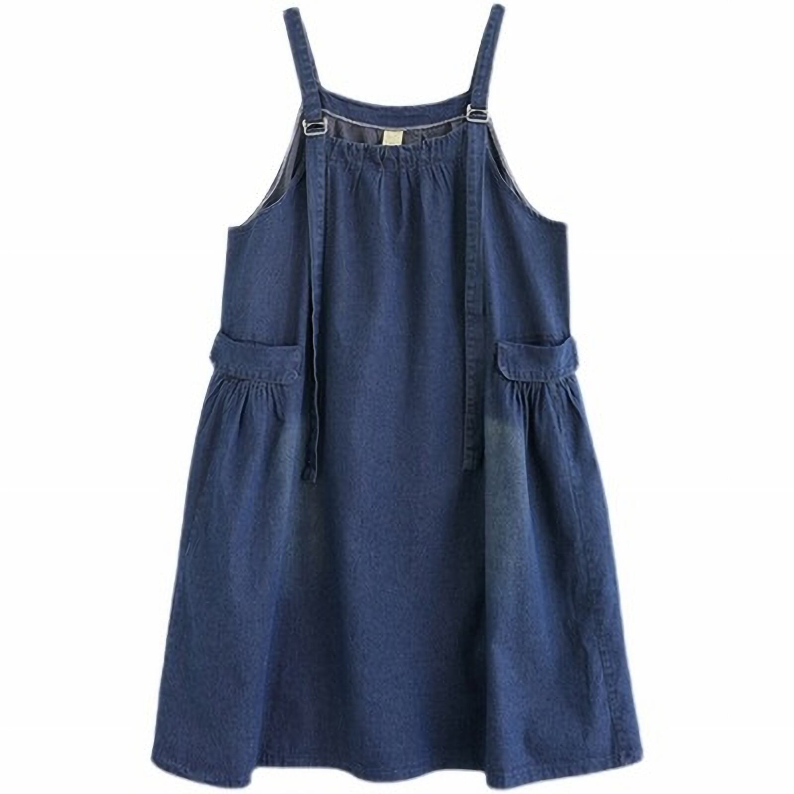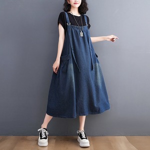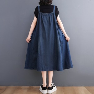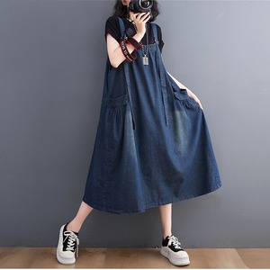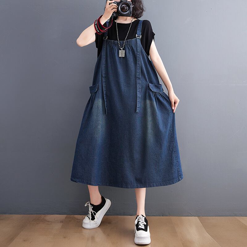 ノースリーブで襟なしのシンプルなデザインが特徴のこのジャンパースカートは、Aラインシルエットで、女性らしいラインを美しく引き立てます。厚手のブルーデニム生地は、着心地が良く、体型カバー効果も抜群です。普段使いからお出かけまで、どんなシーンでも活躍します。