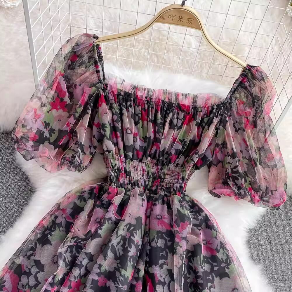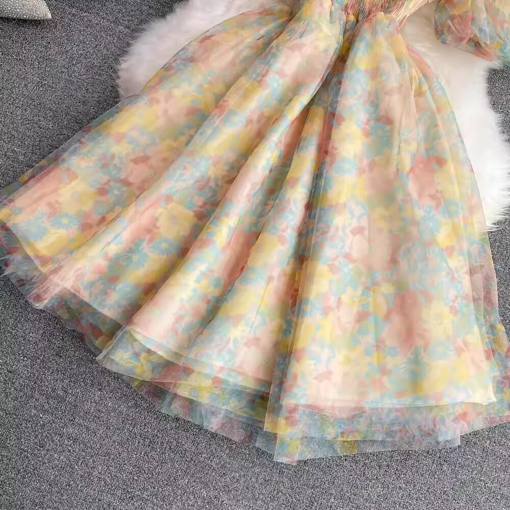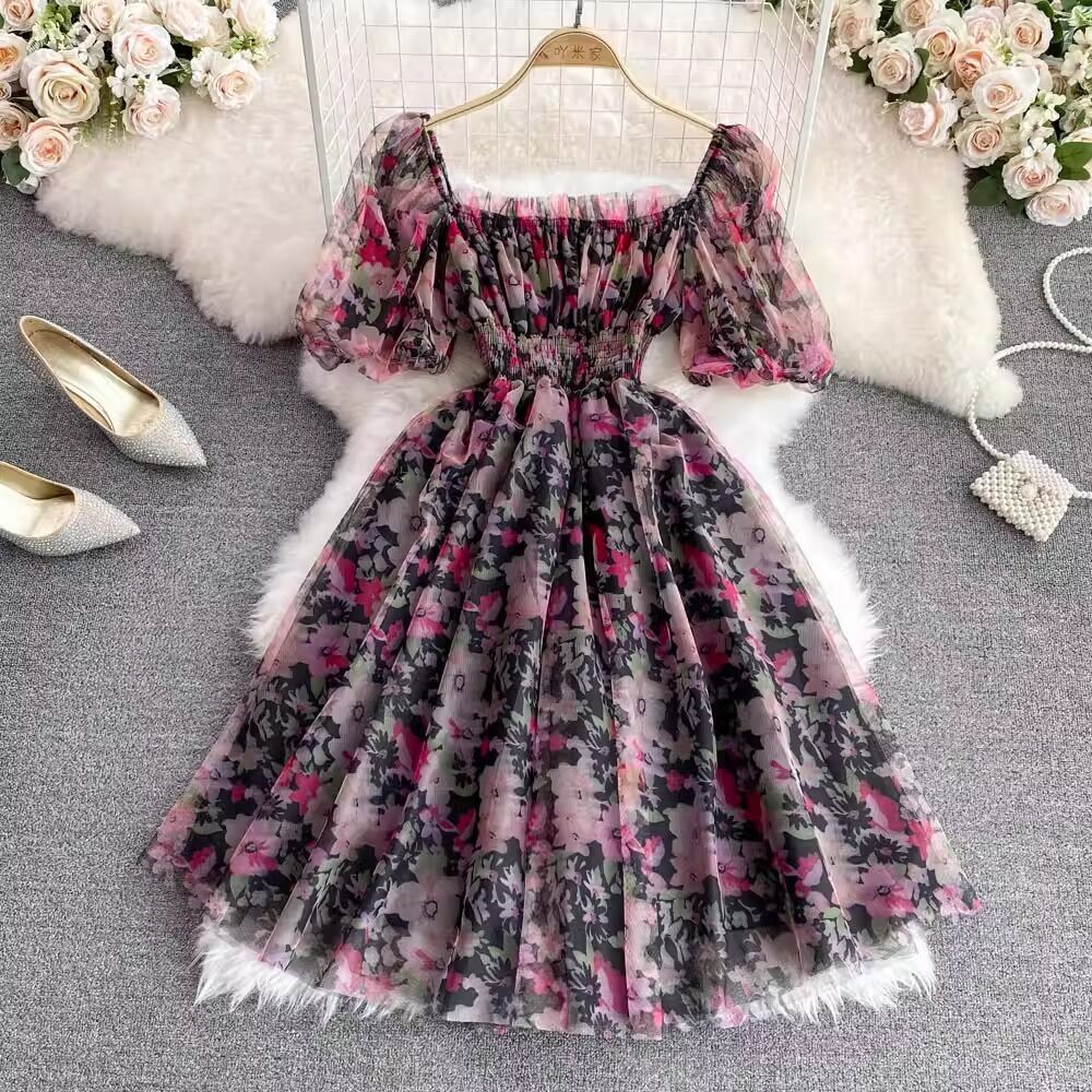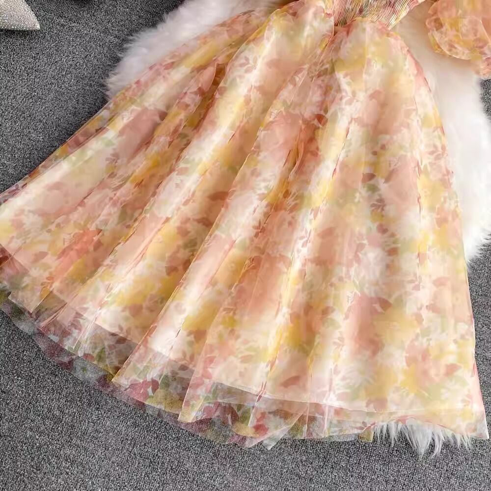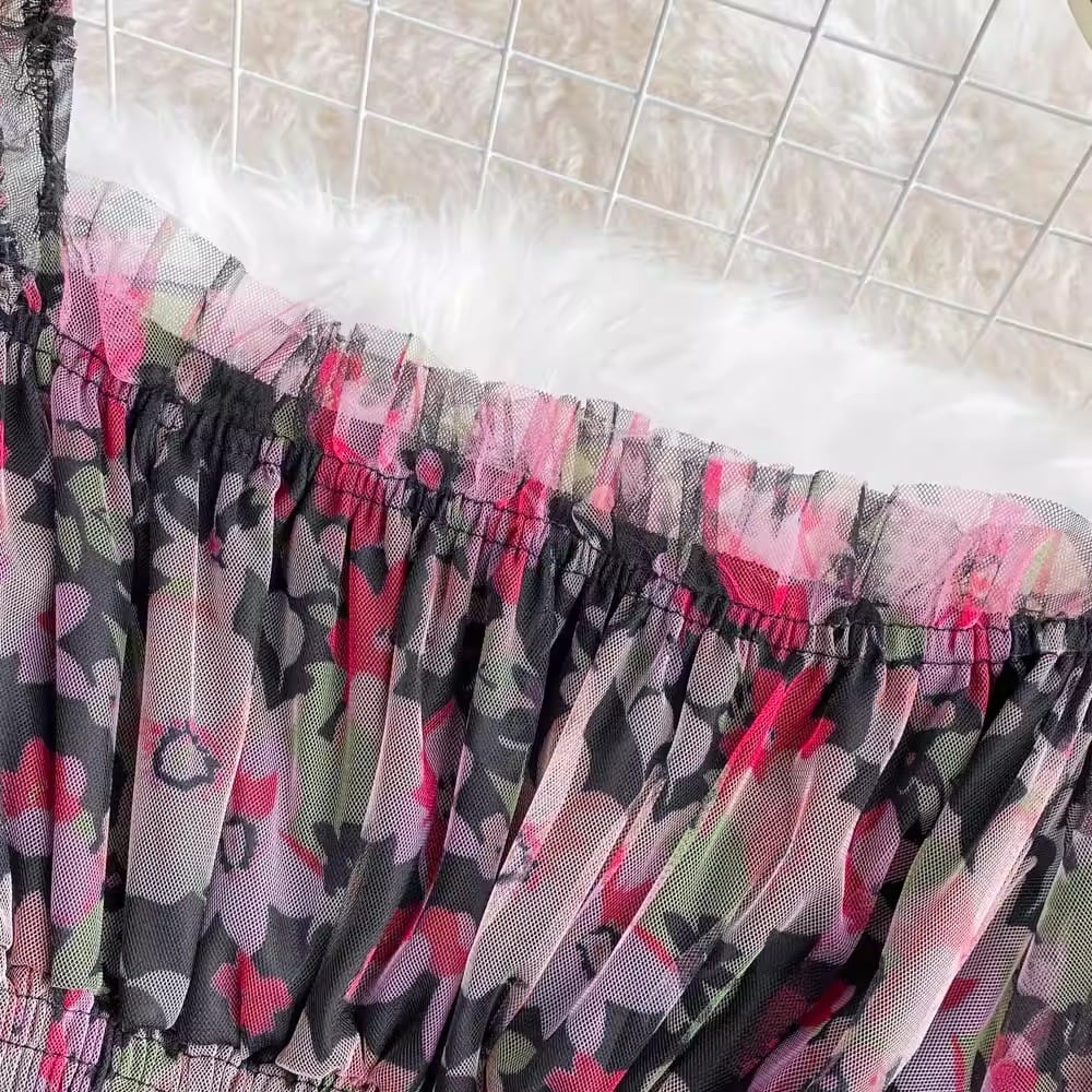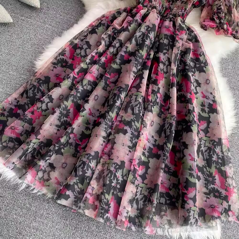 柔らかなチュールと花柄デザインが印象的な、春夏にぴったりのフレアワンピースです。