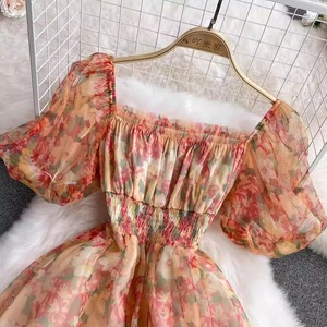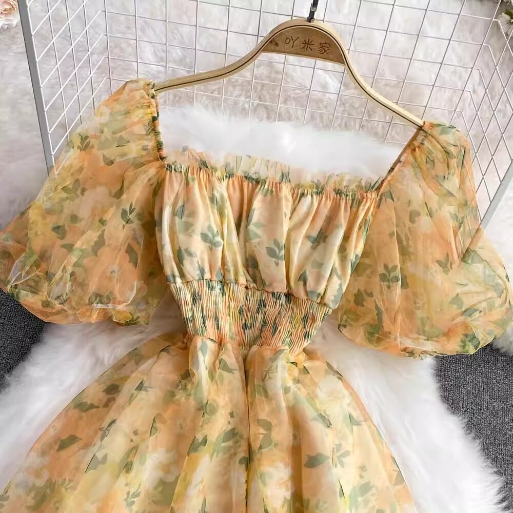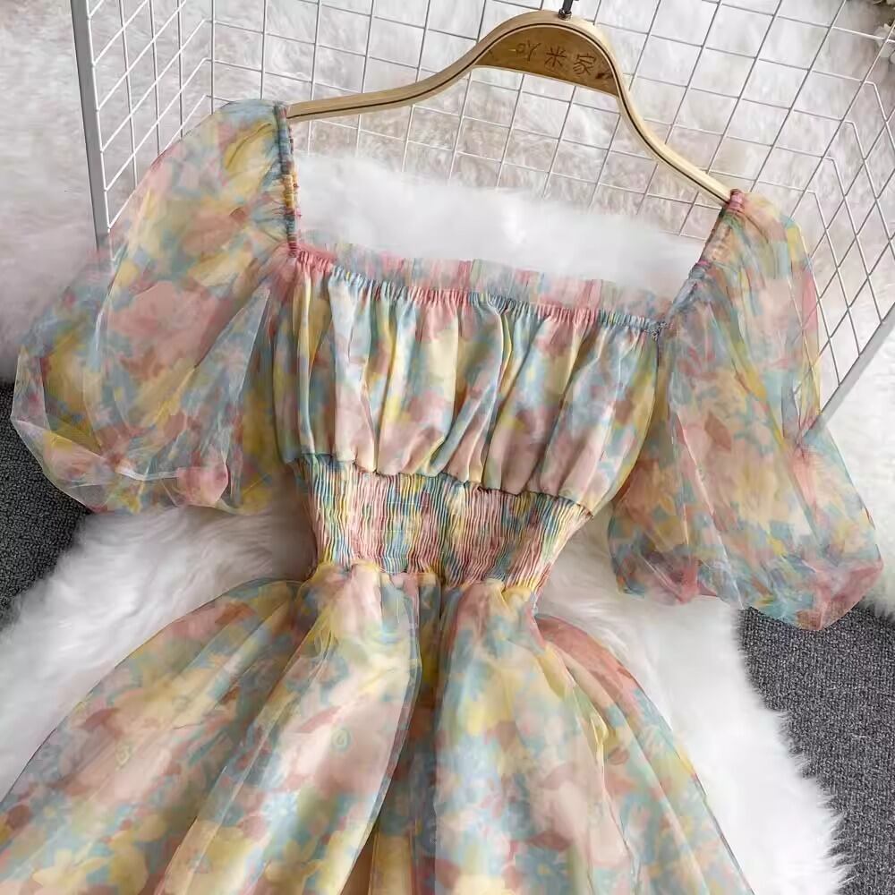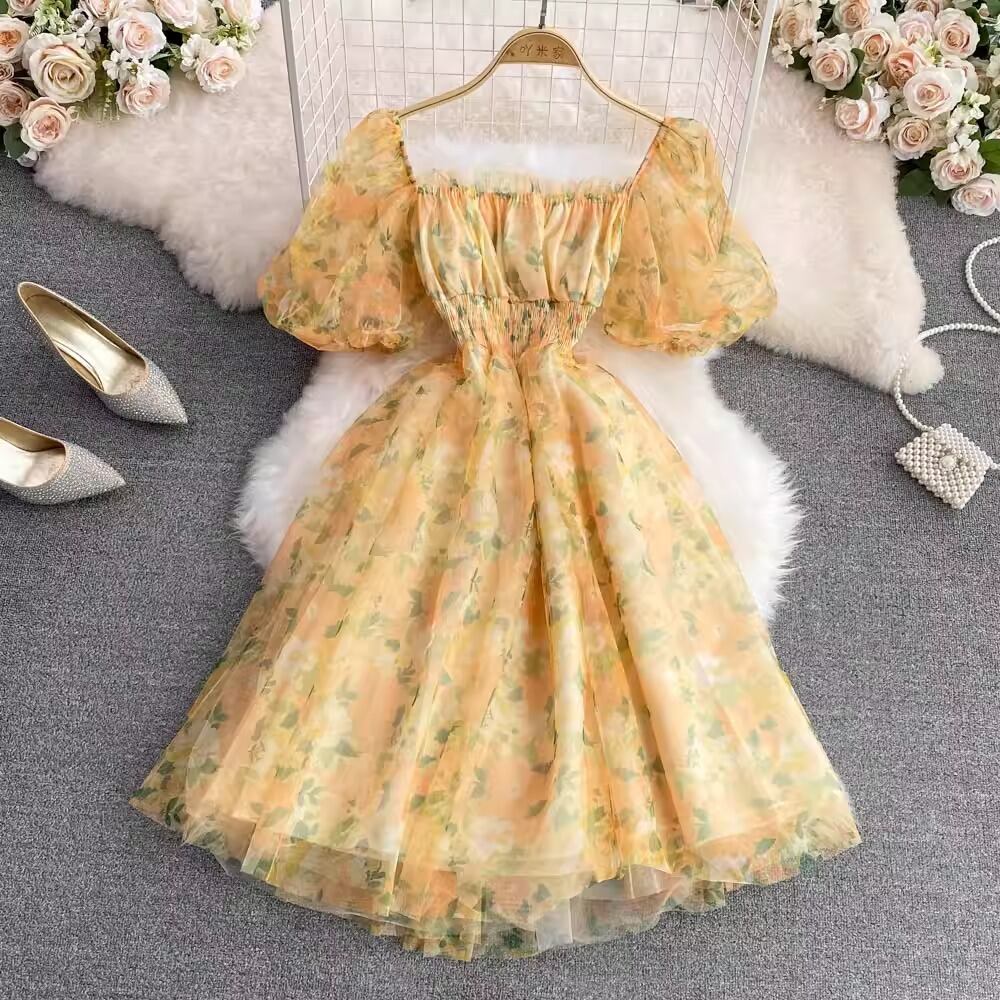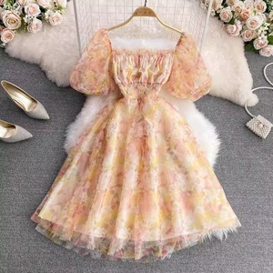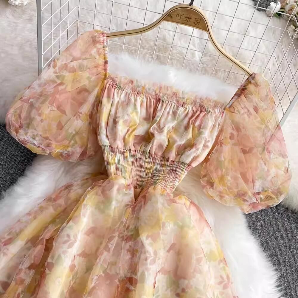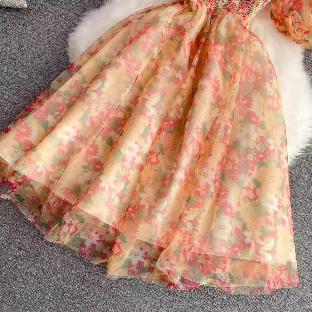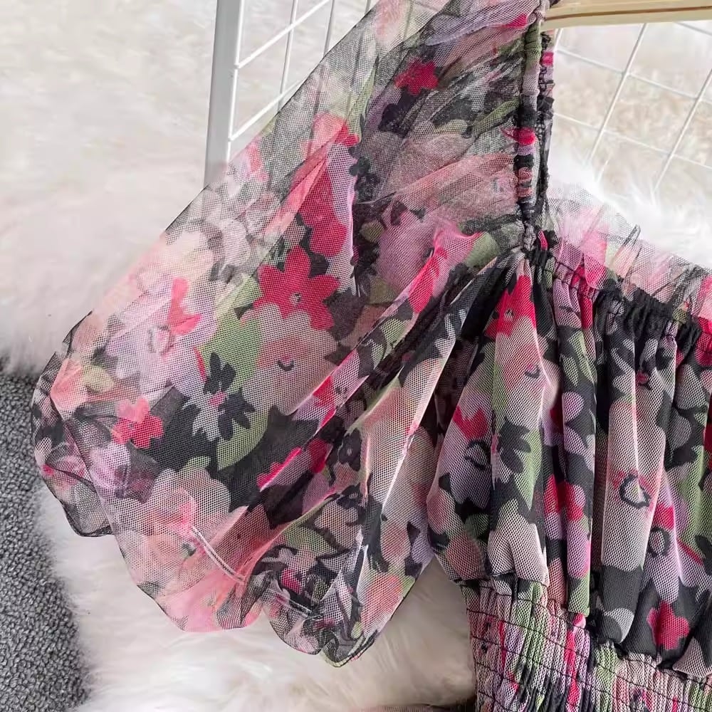 柔らかなチュールと花柄デザインが印象的な、春夏にぴったりのフレアワンピースです。