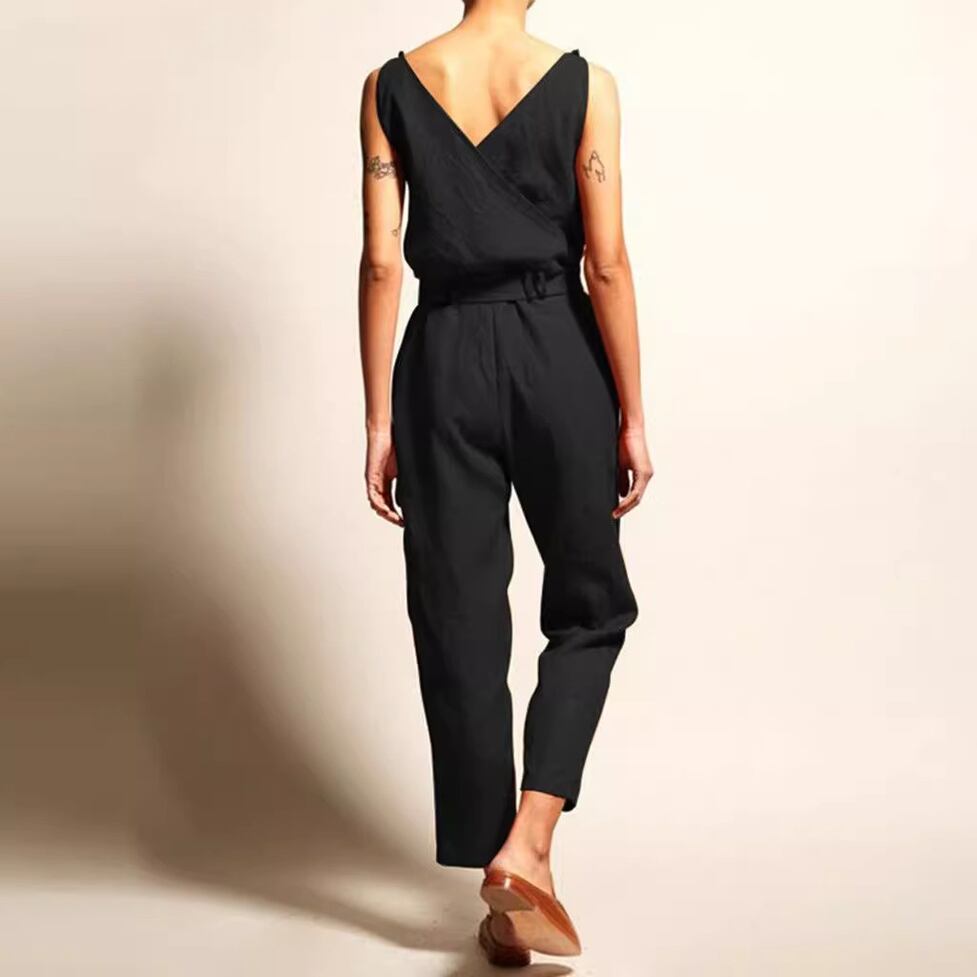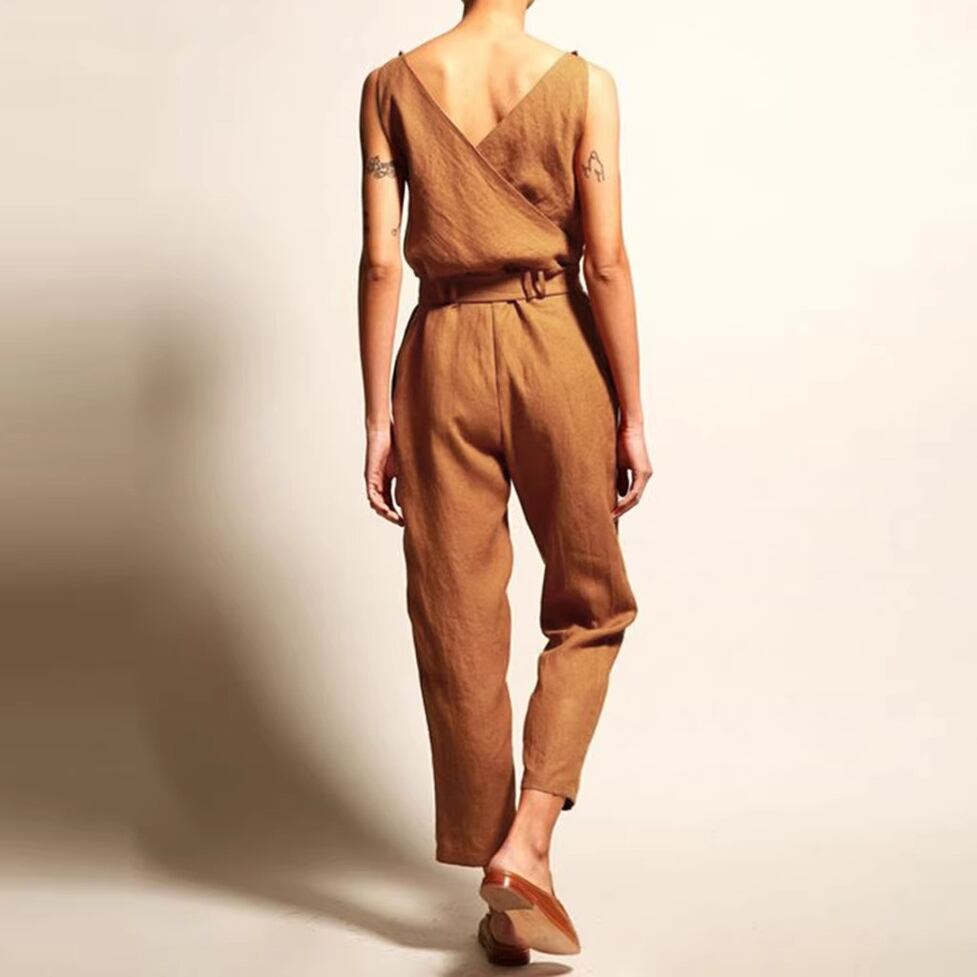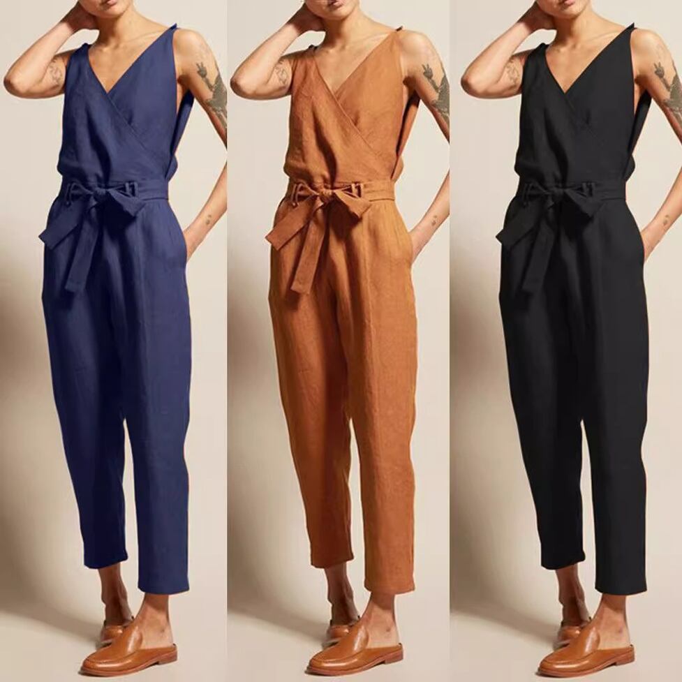 すっきりとしたノースリーブが魅力的なコンビネゾン。オトナっぽさを演出するカシュクールのようなデザインがポイントです。ウエストリボンでスタイルアップ効果を演出。ジャケットをプラスしたコーディネートもおすすめです。ゆったりとしたサイジングで気になるボディラインも自然にカバーし合わせるアイテム次第でカジュアルにも綺麗めスタイルにもマッチ。