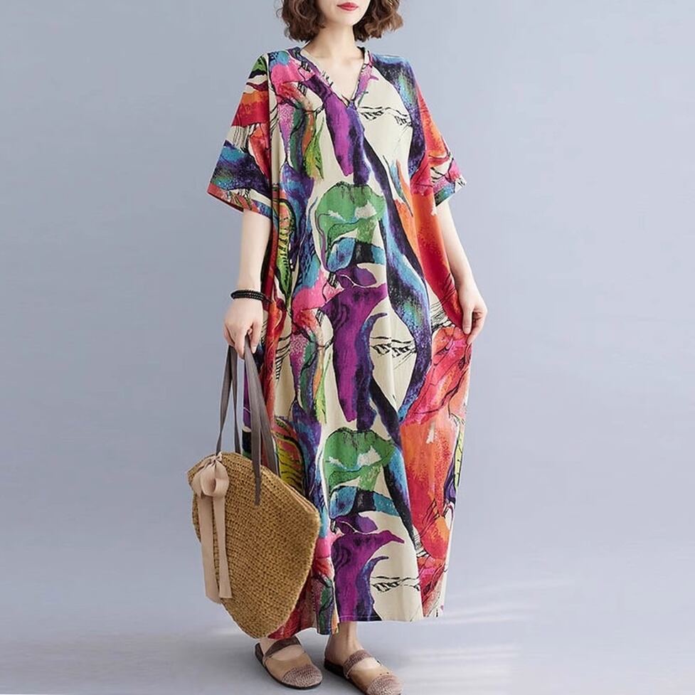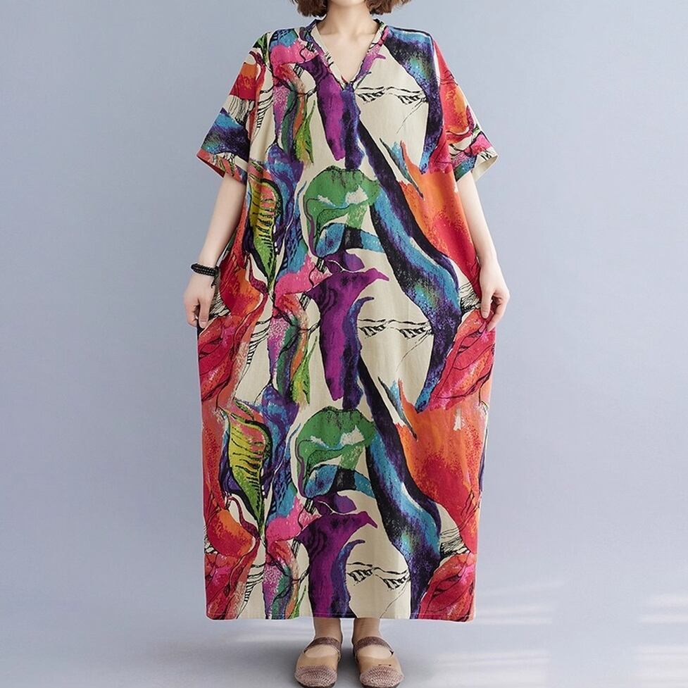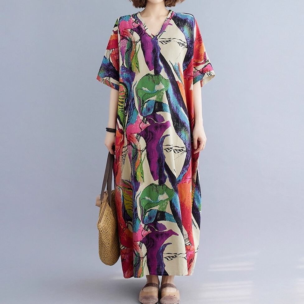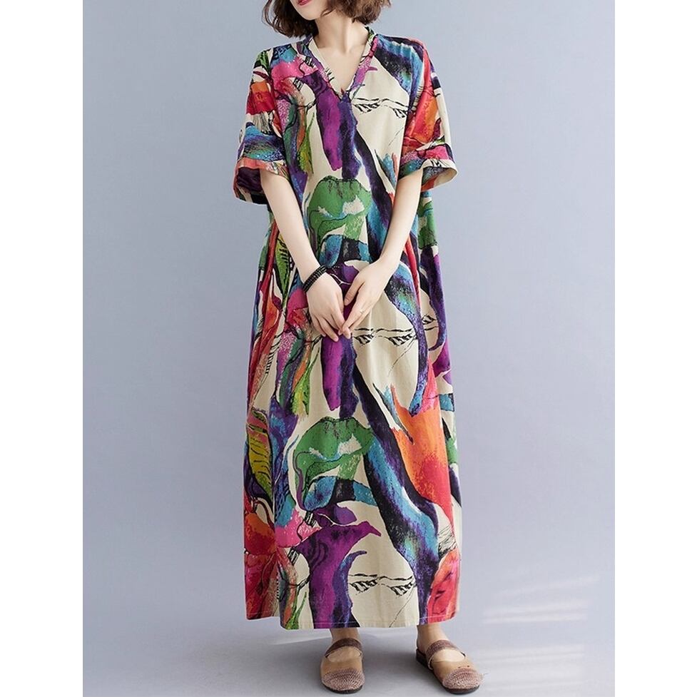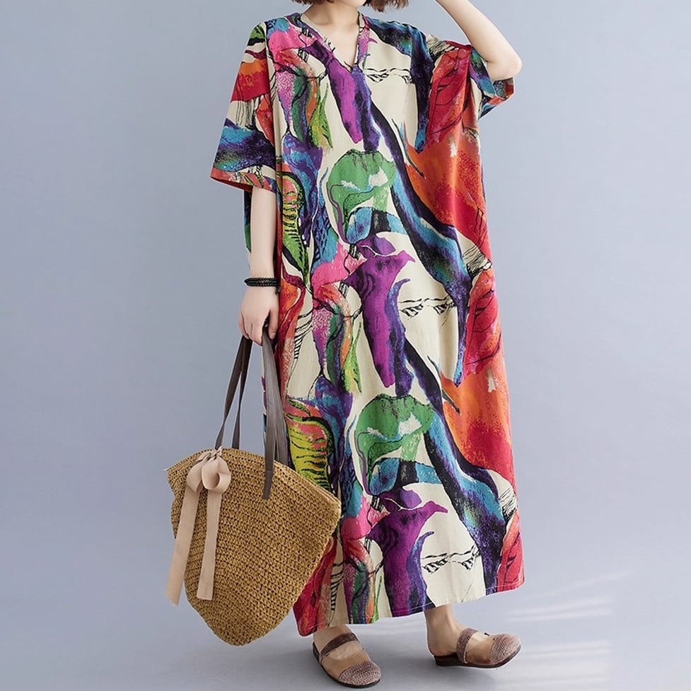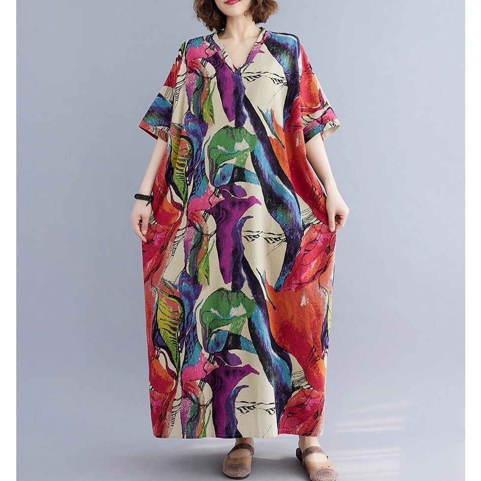 たっぷりフレアなマキシ丈ワンピ。ゆったりなのに着痩せが叶う。布をたっぷりぜいたくに使って ストンと綺麗な落ち感とドレープの生まれる美しいシルエットに。お出かけ時はもちろん 自宅でのリラックスタイムにもおすすめです。ジオメトリックな色づかいがレトロな雰囲気を演出。一枚着るだけでしっかりとお洒落が叶う主役級アイテムです。