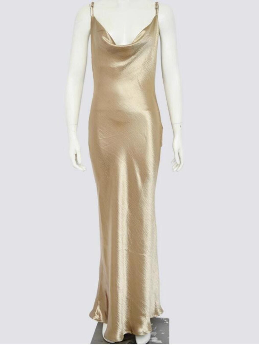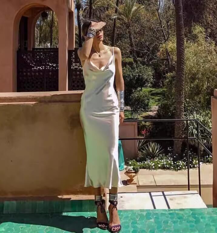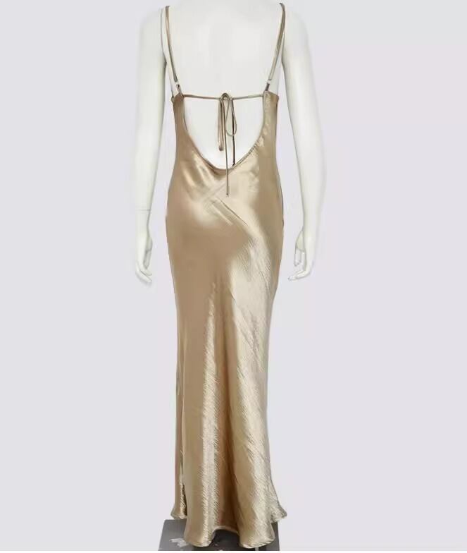キャミソールとVネックデザインにより、すっきりとした印象を与え、マーメイドシルエットが女性らしいラインを引き立てます。