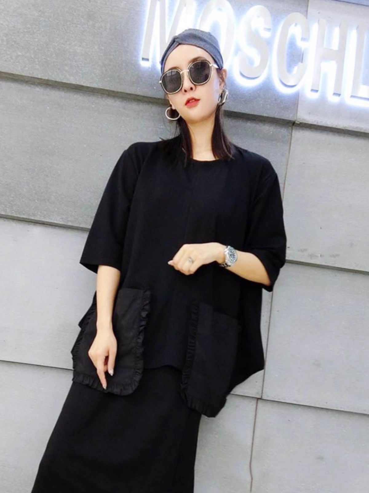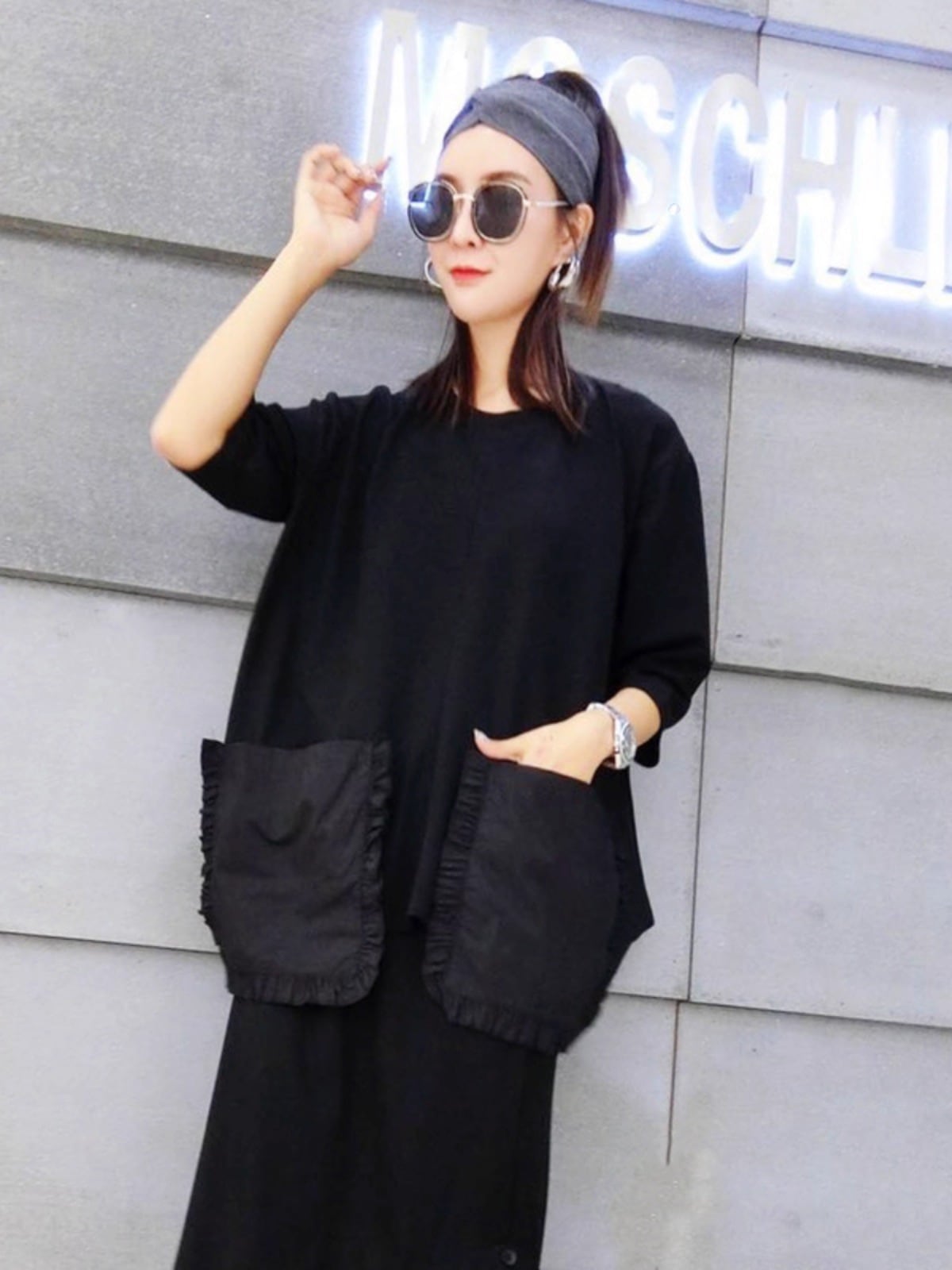 大きなポケットが印象的で、ゆったりとしたミディアム丈が体型カバーにも優れています。