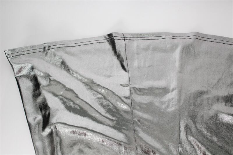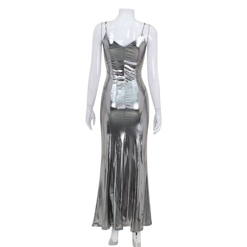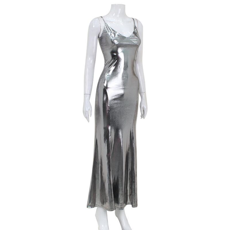 メタリックカラーが目を惹くノースリーブロングドレス。