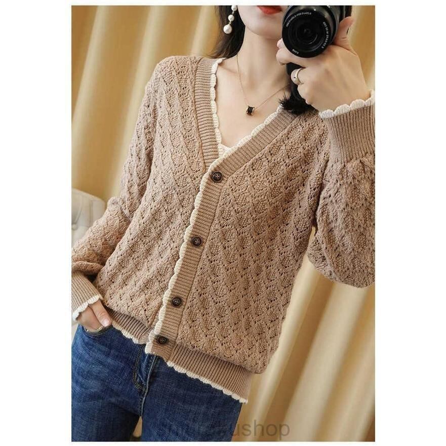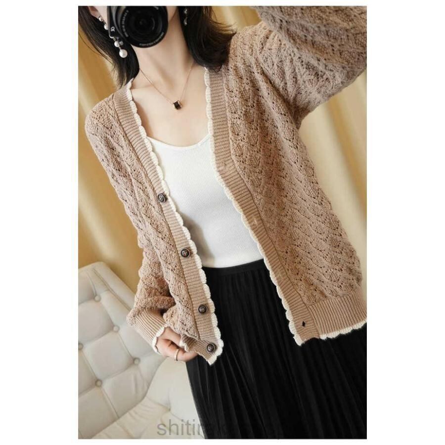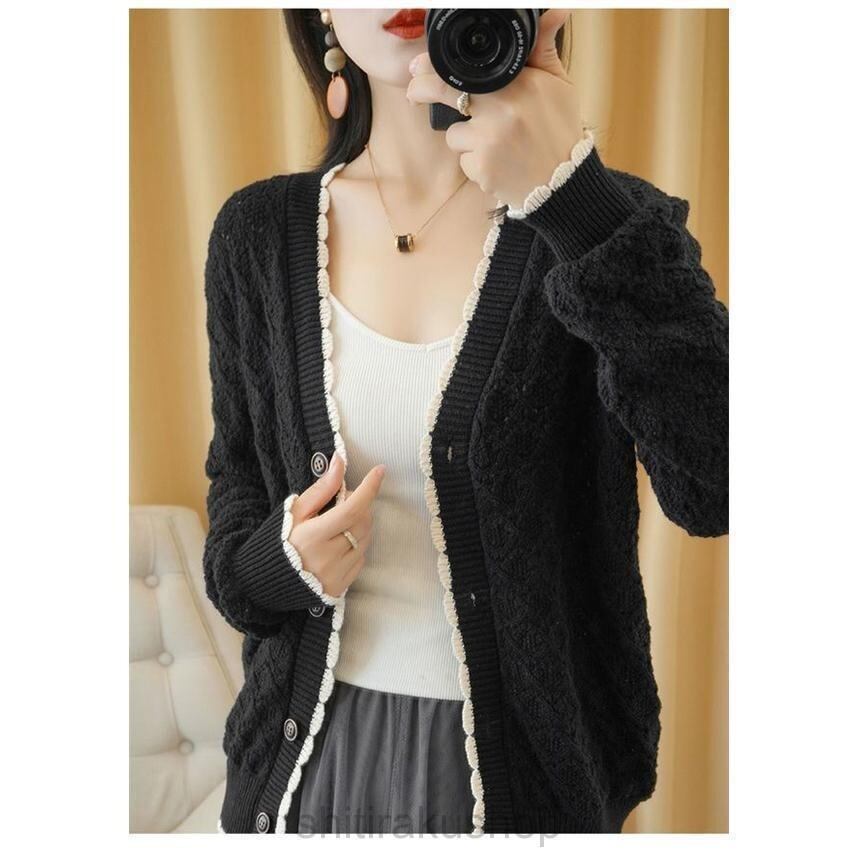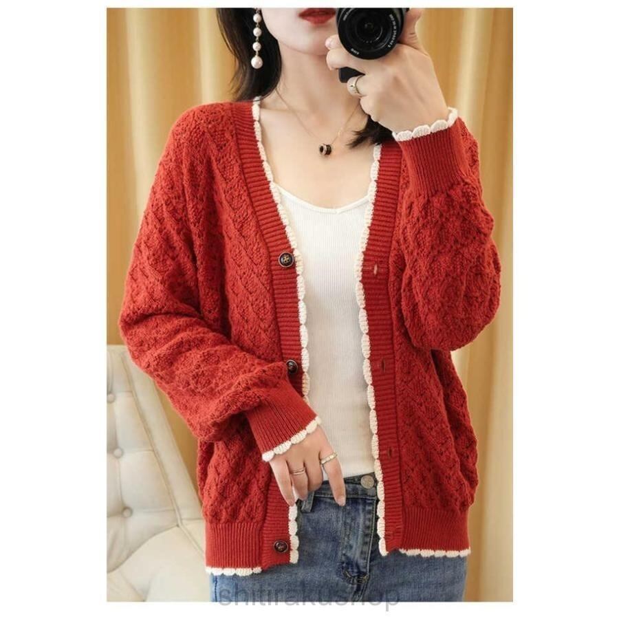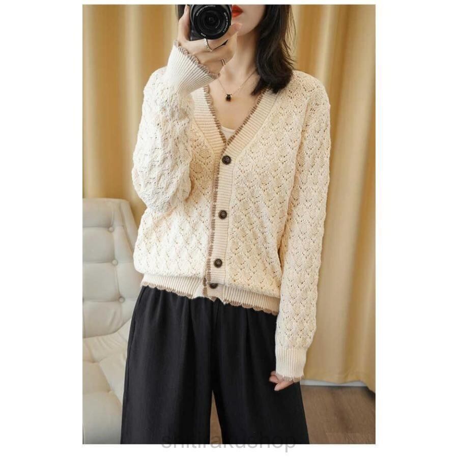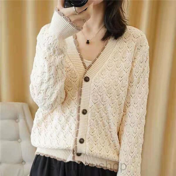 前開きのデザインとVネックで、シンプルさと上品さを兼ね備えています。