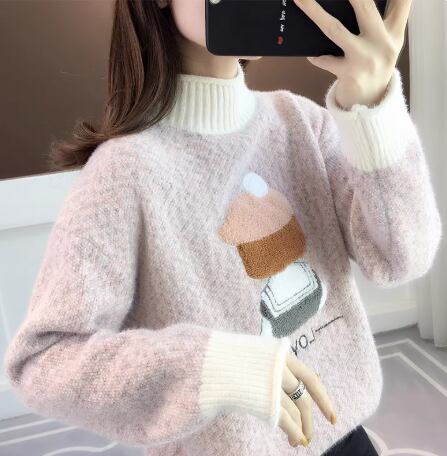 背中を向いた女の子のアップリケとロゴと袖口・襟先のカールデザインがアクセントになった長袖ハイネックセーター。カジュアルな中におしゃれな抜け感を演出します。ゆったりシルエットでラフに着こなせるのも魅力。