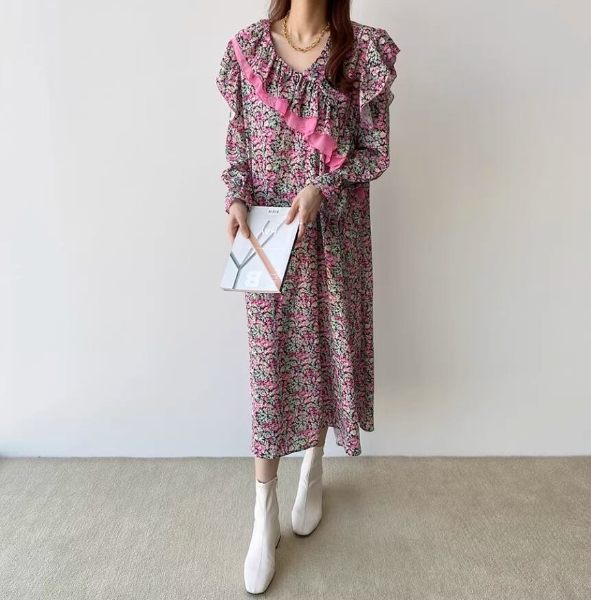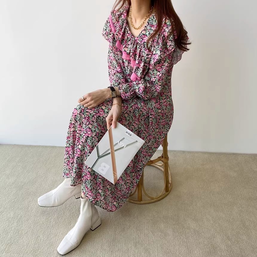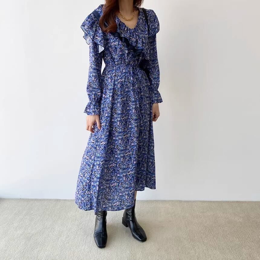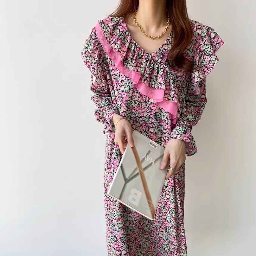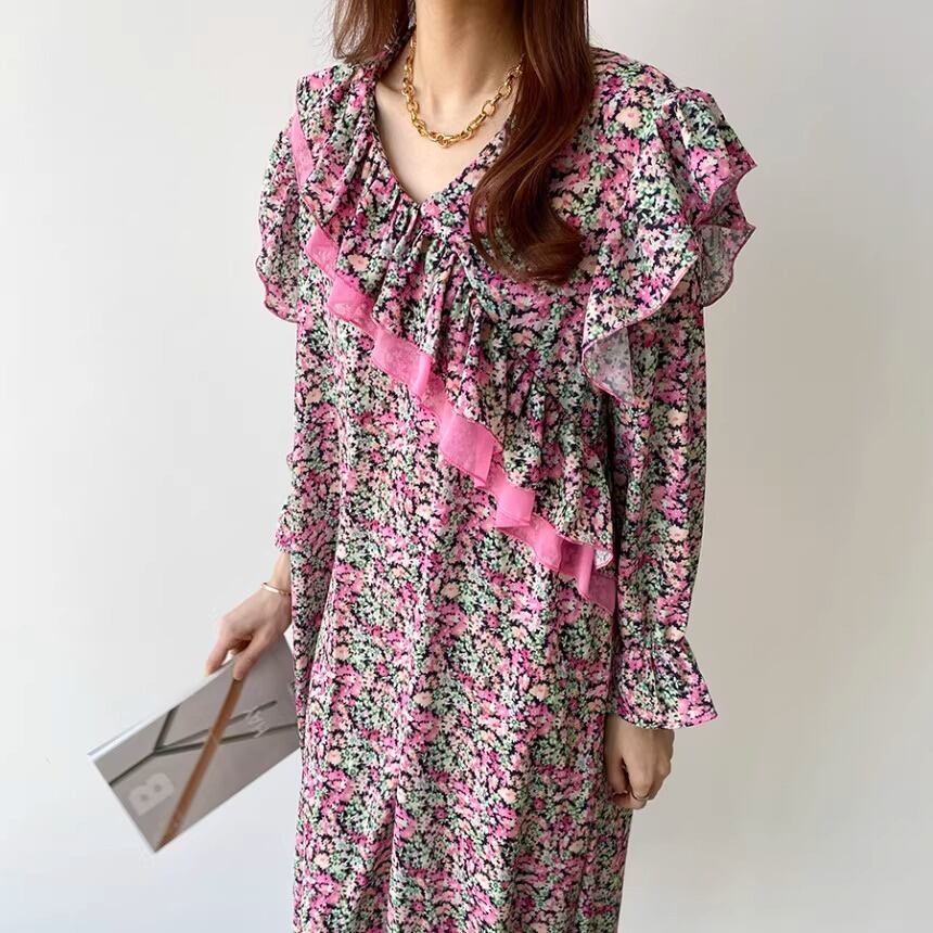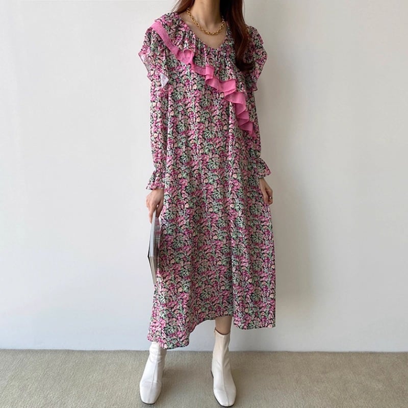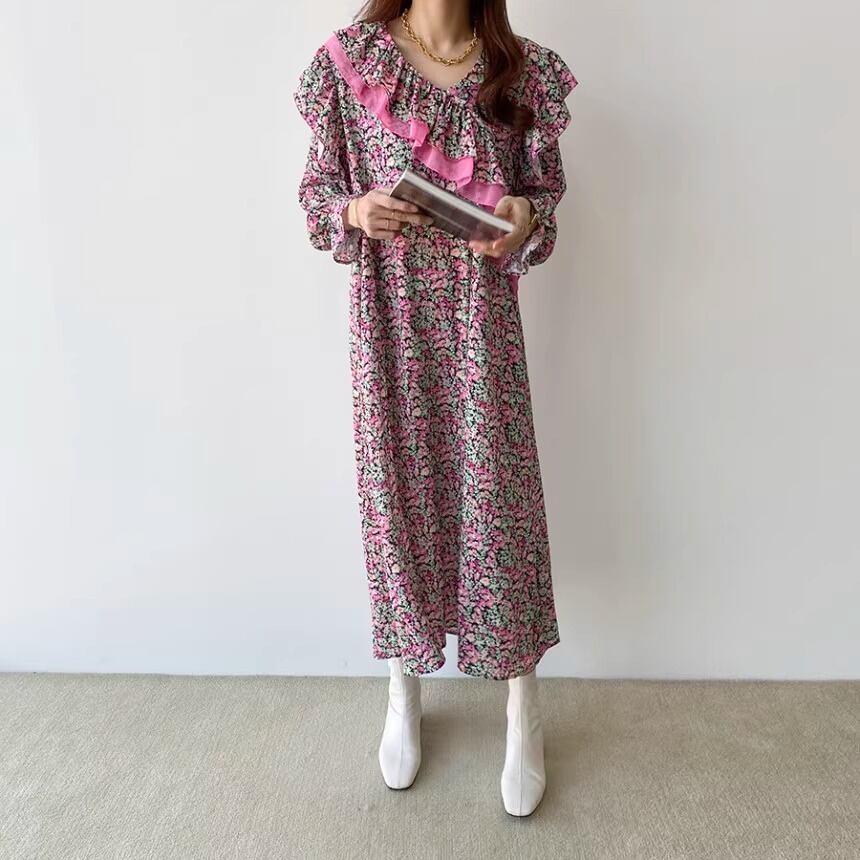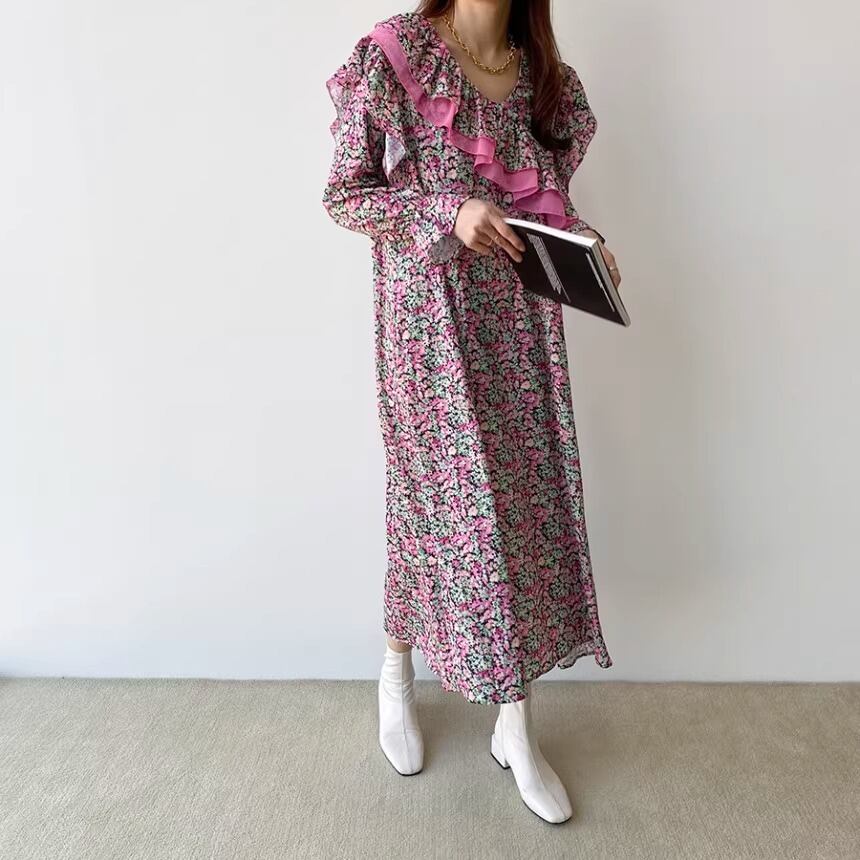 大人可愛い印象の花柄のロングワンピースです。