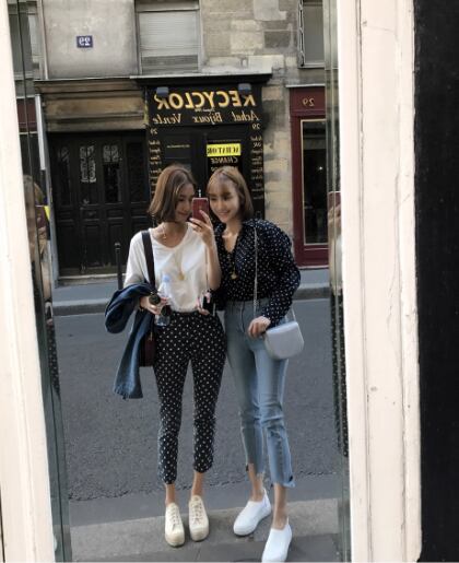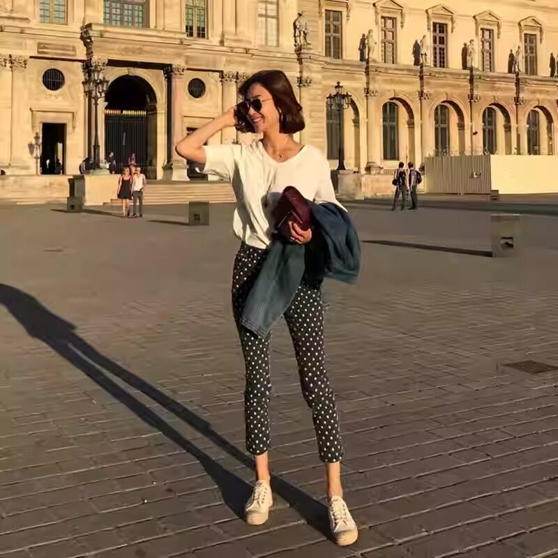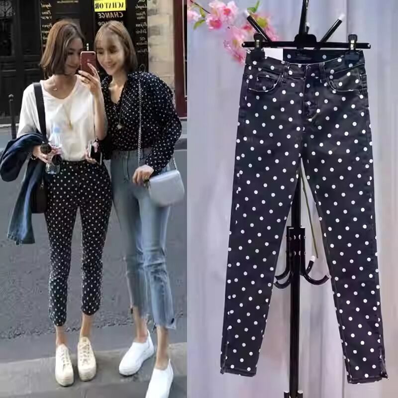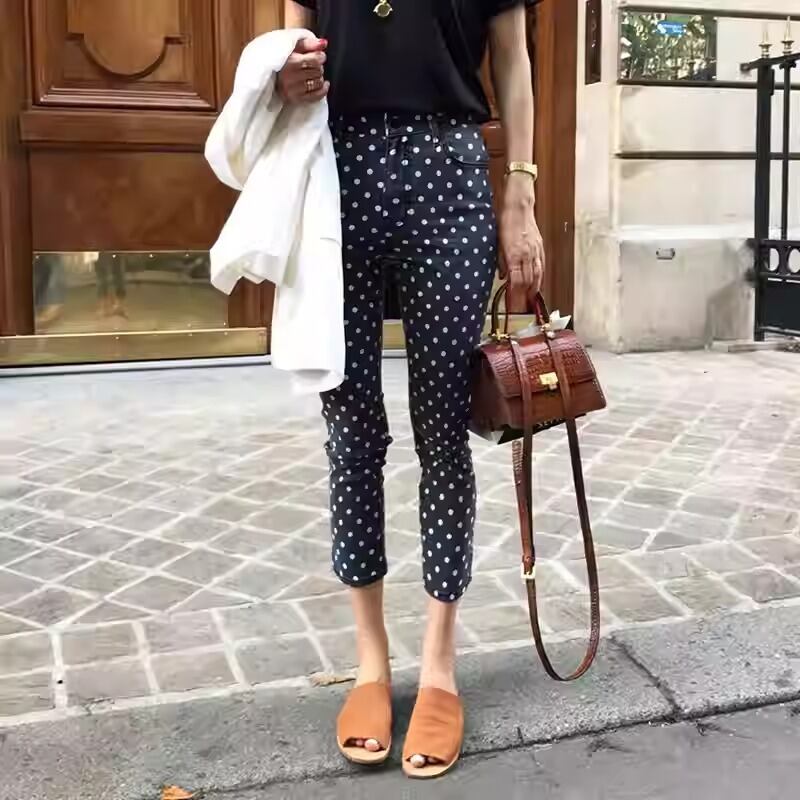 トレンド感あふれる水玉デザインがポイントのクロップド丈デニムパンツ。ハイウエスト仕様で脚長効果があり、シンプルながらもおしゃれな印象を与えます。ストレートシルエットが美脚ラインを引き立て、カジュアルからフェミニンまで幅広くマッチ。