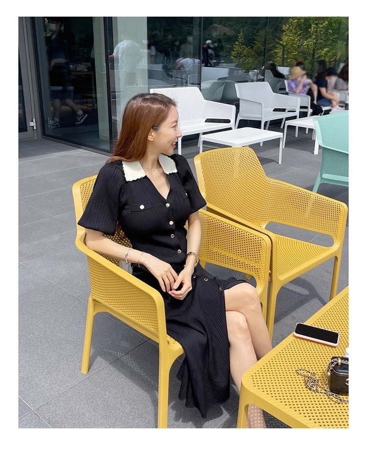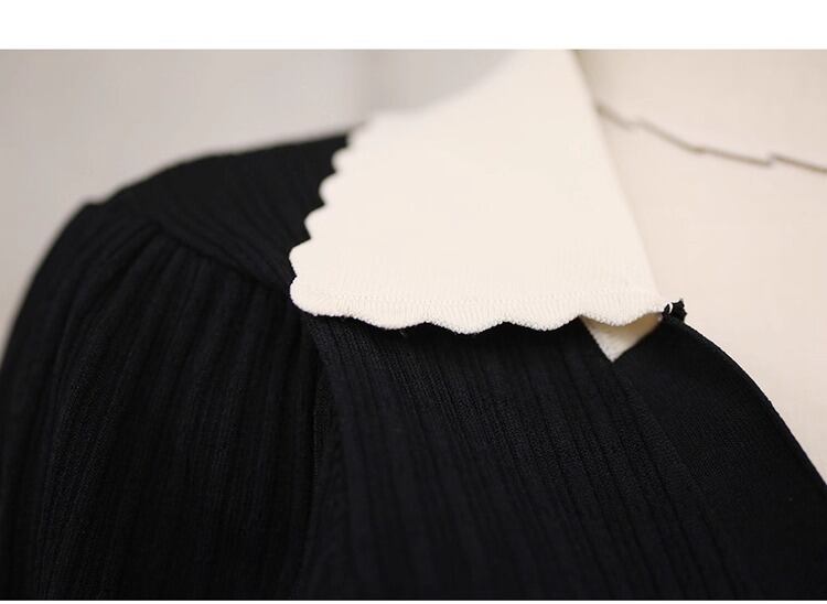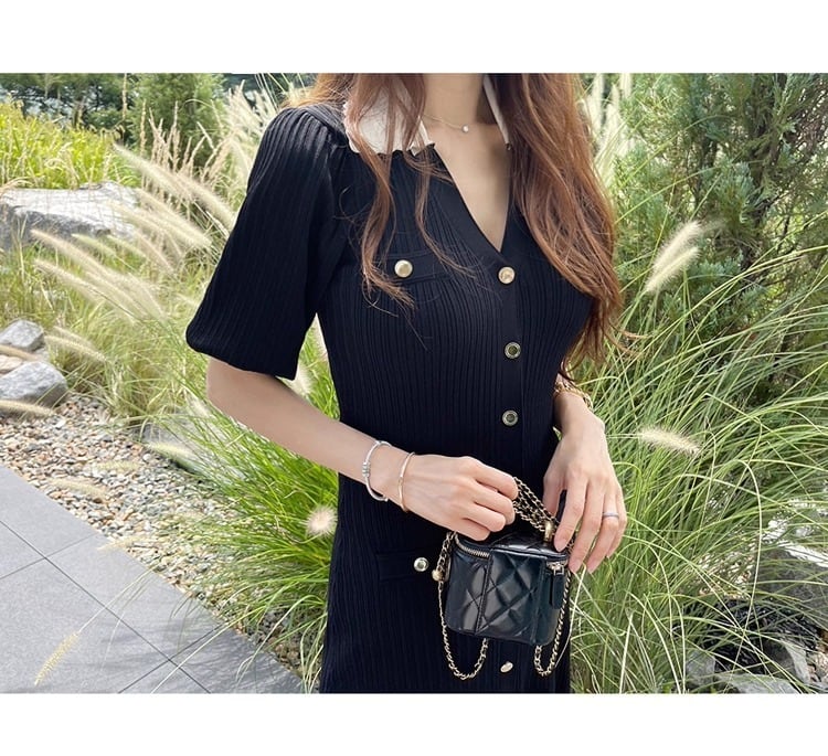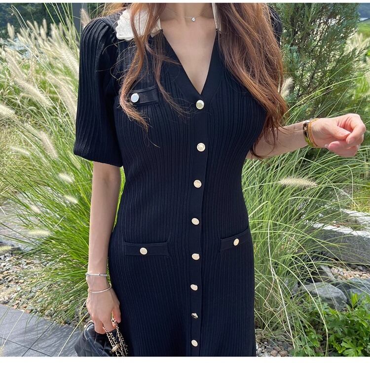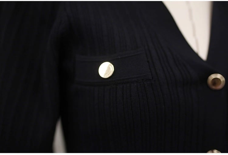 Vネックと真ん中のボタンがさりげない個性を引き出し、エレガントな印象を与えます。