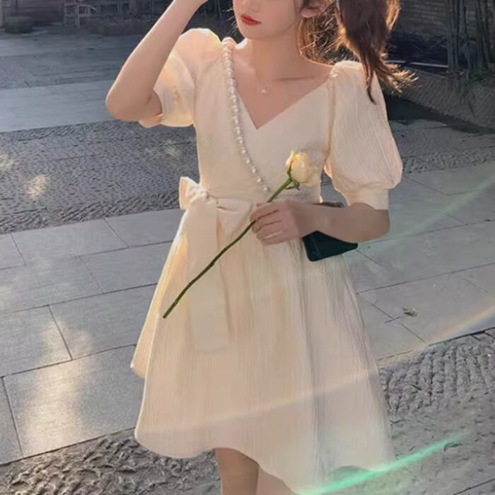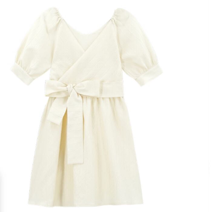 ウエストのリボンとパフスリーブが可愛いデザインです