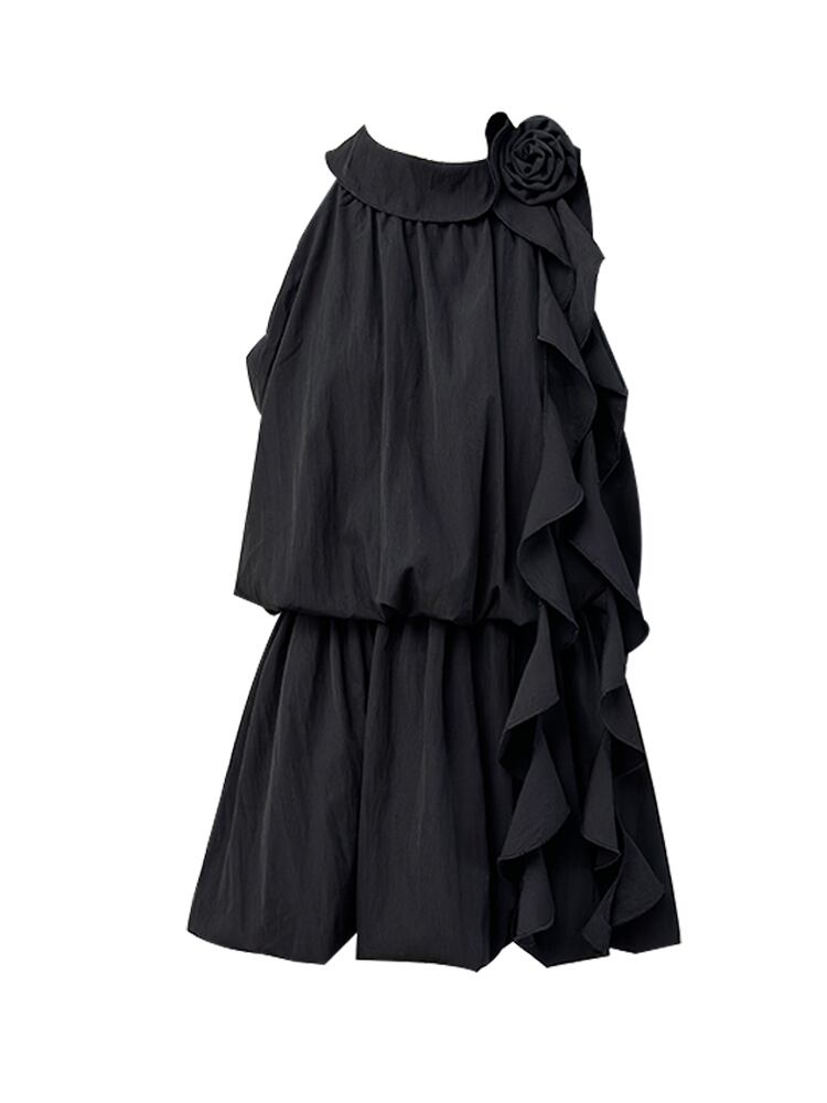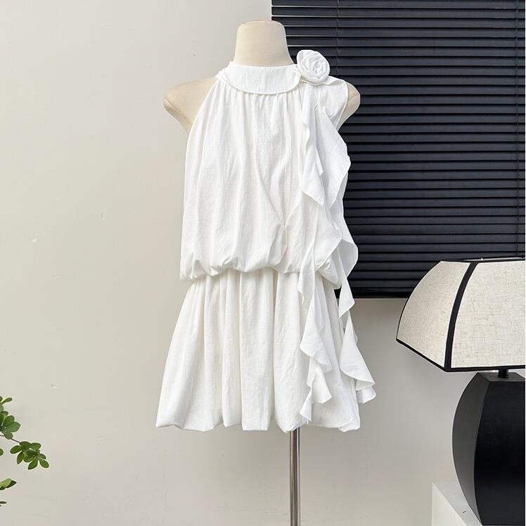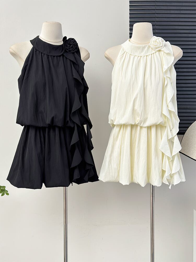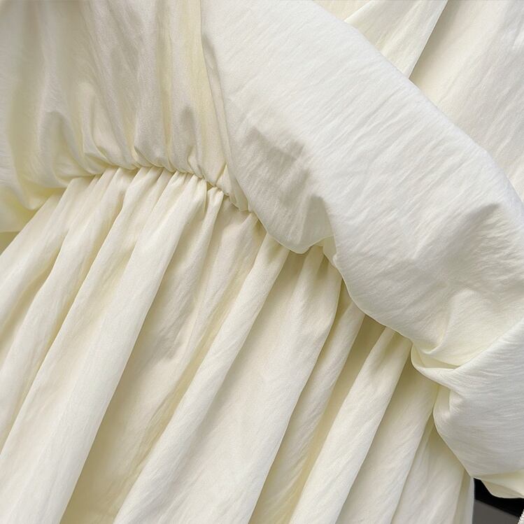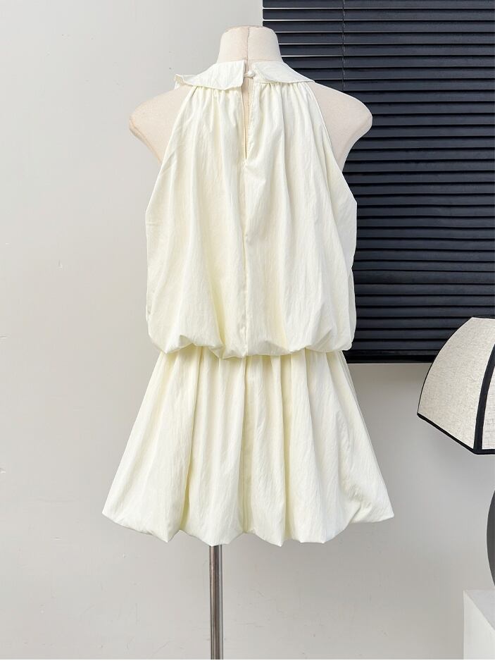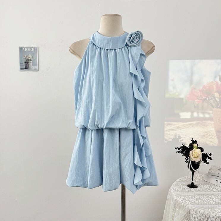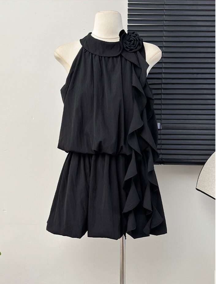 透け感のある薄手素材が使用されており、軽やかさを感じることができます。切り替えデザインやフリル、リボンが施されていることで、より可愛らしく、ガーリーな雰囲気を演出します。シンプルながらも主役級の存在感を持つこのドレスは、女子会にもぴったりです。