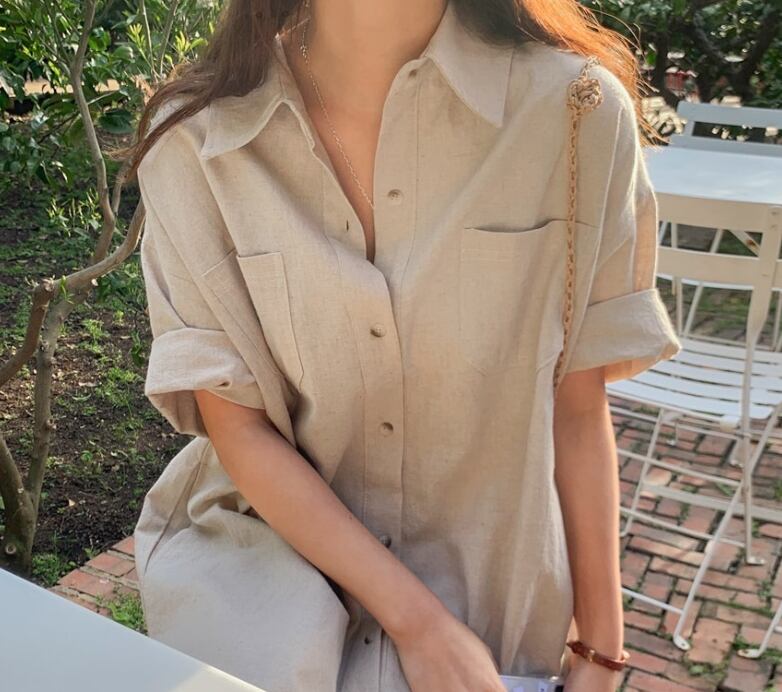 ゆったりとしたシルエットで体型をしっかりカバーしつつ、襟付きデザインが上品さを演出します。