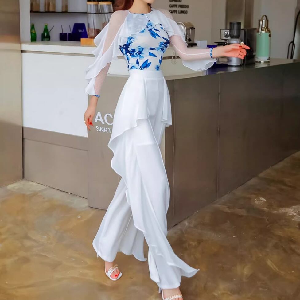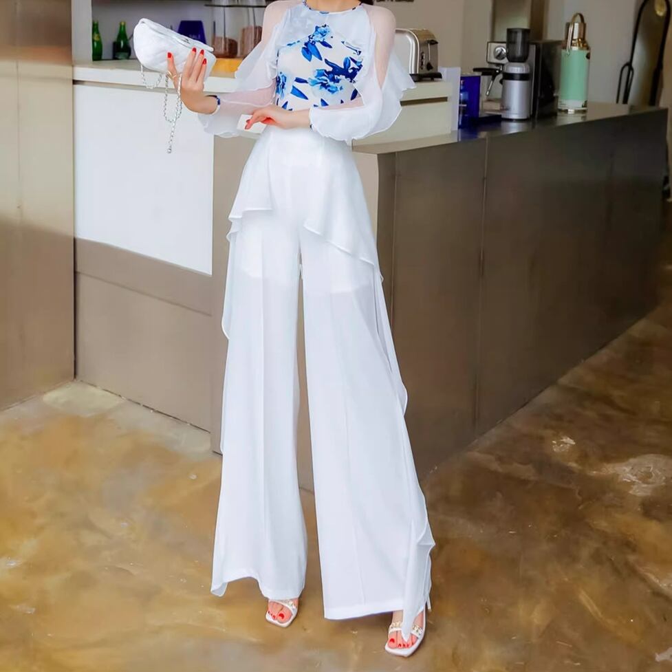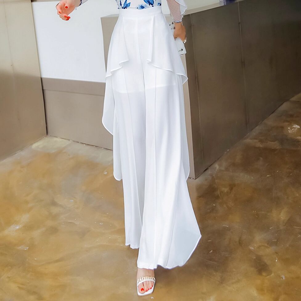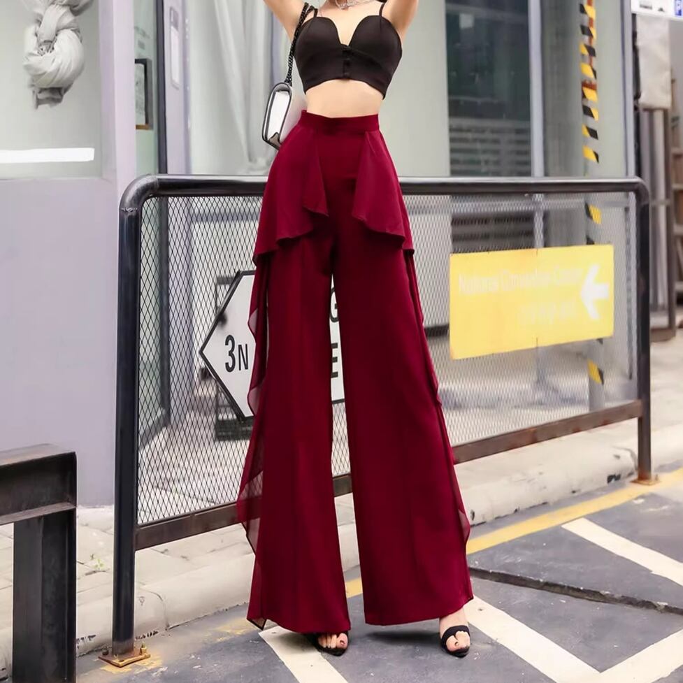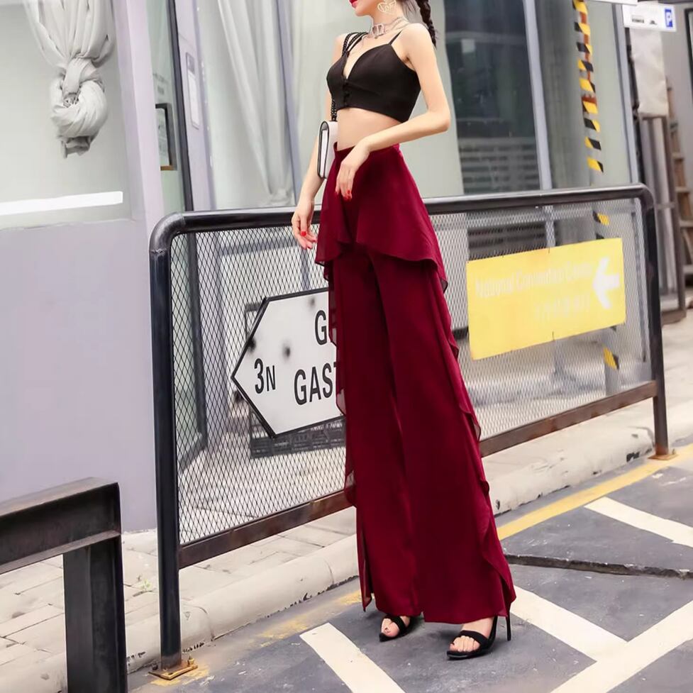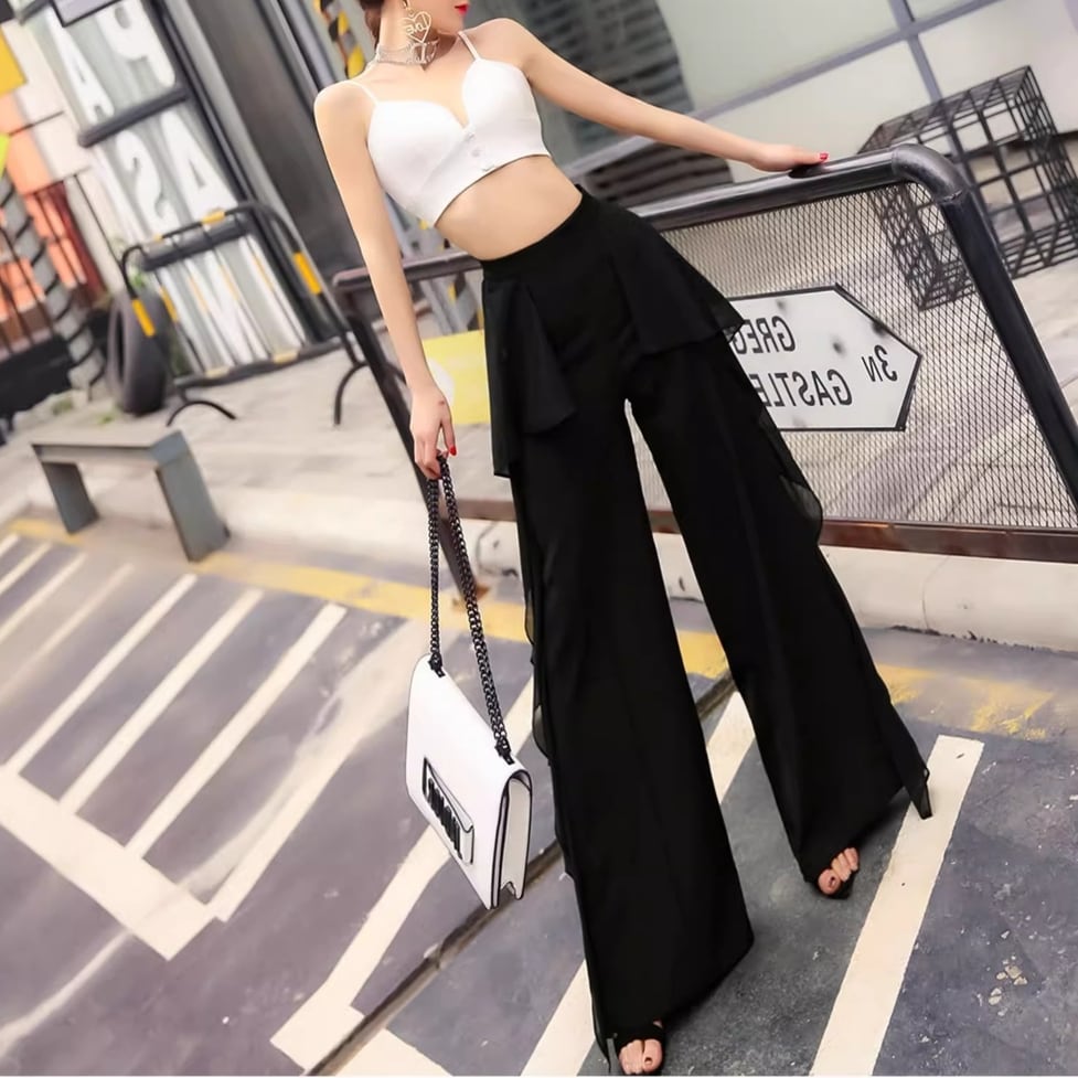 サイドにボリュームのあるフリルデザインが大人っぽくおしゃれに着られるシフォンワイドパンツです。スタイリッシュな雰囲気をプラスし、リラクシーな中にも洗練さを演出します。レッグラインを拾わないシルエットできれいにすっきり見えます。シフォン素材でほんのり透け感があるので軽やか。