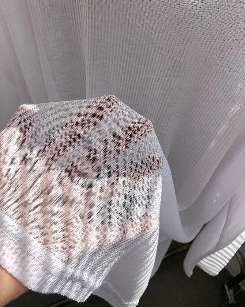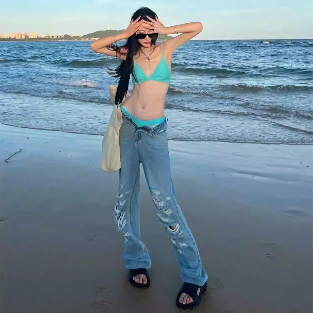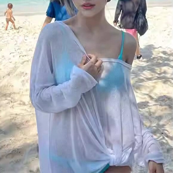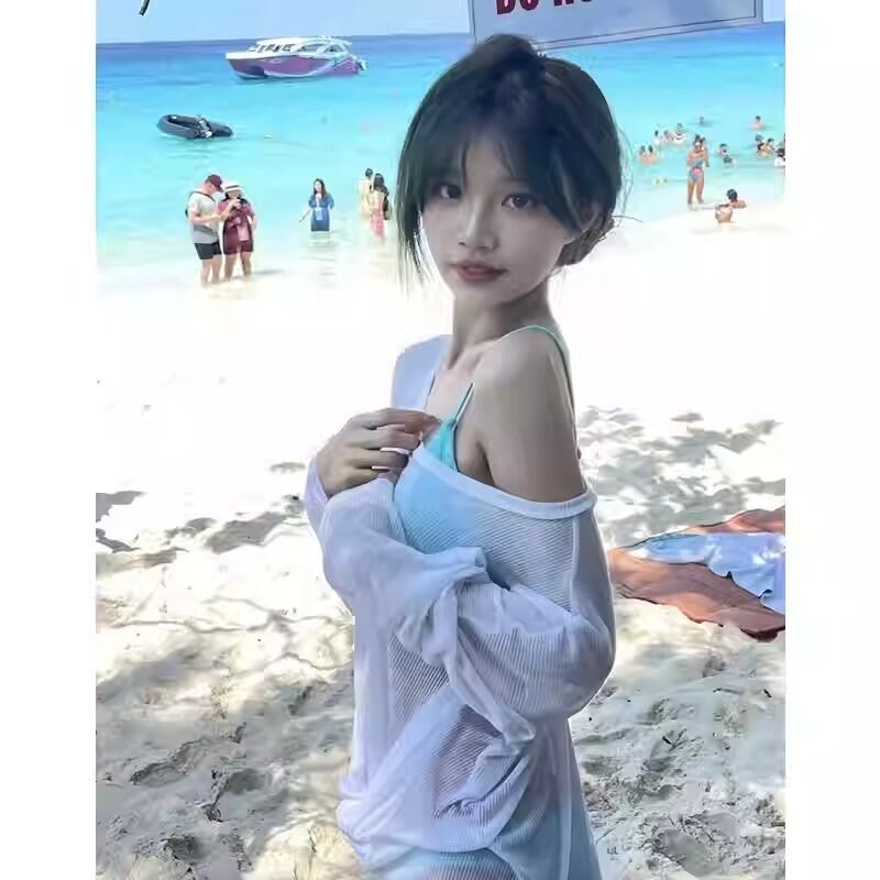 透け感のあるシャツがセットになった、トレンド感あふれる三角ビキニスイムウェア。