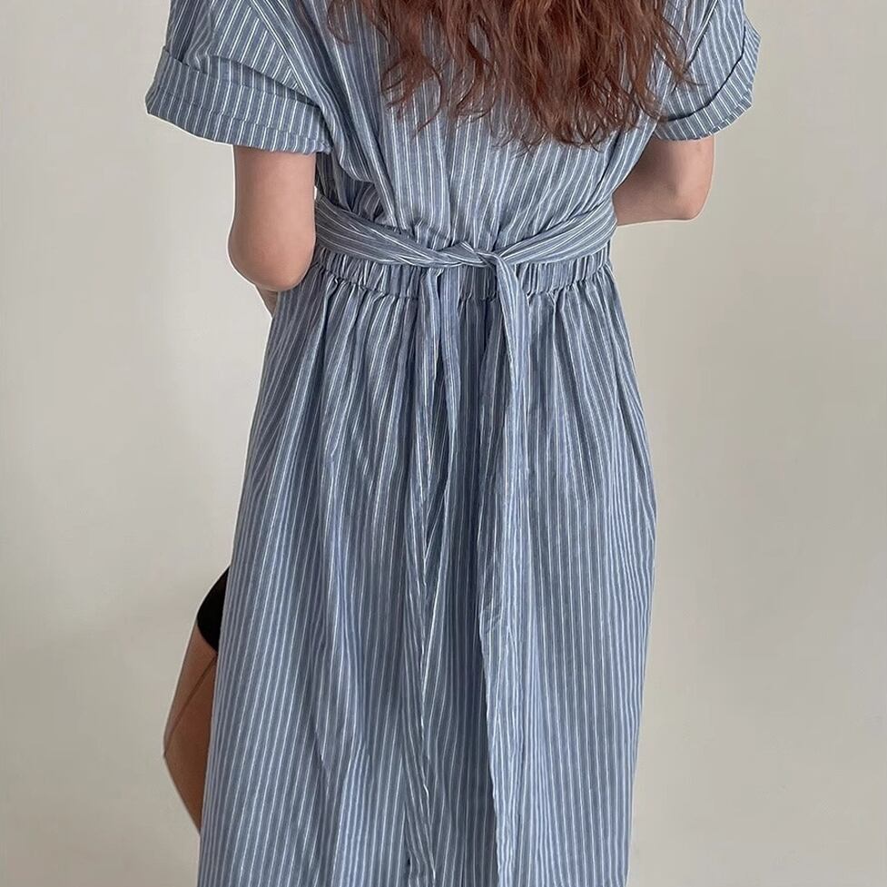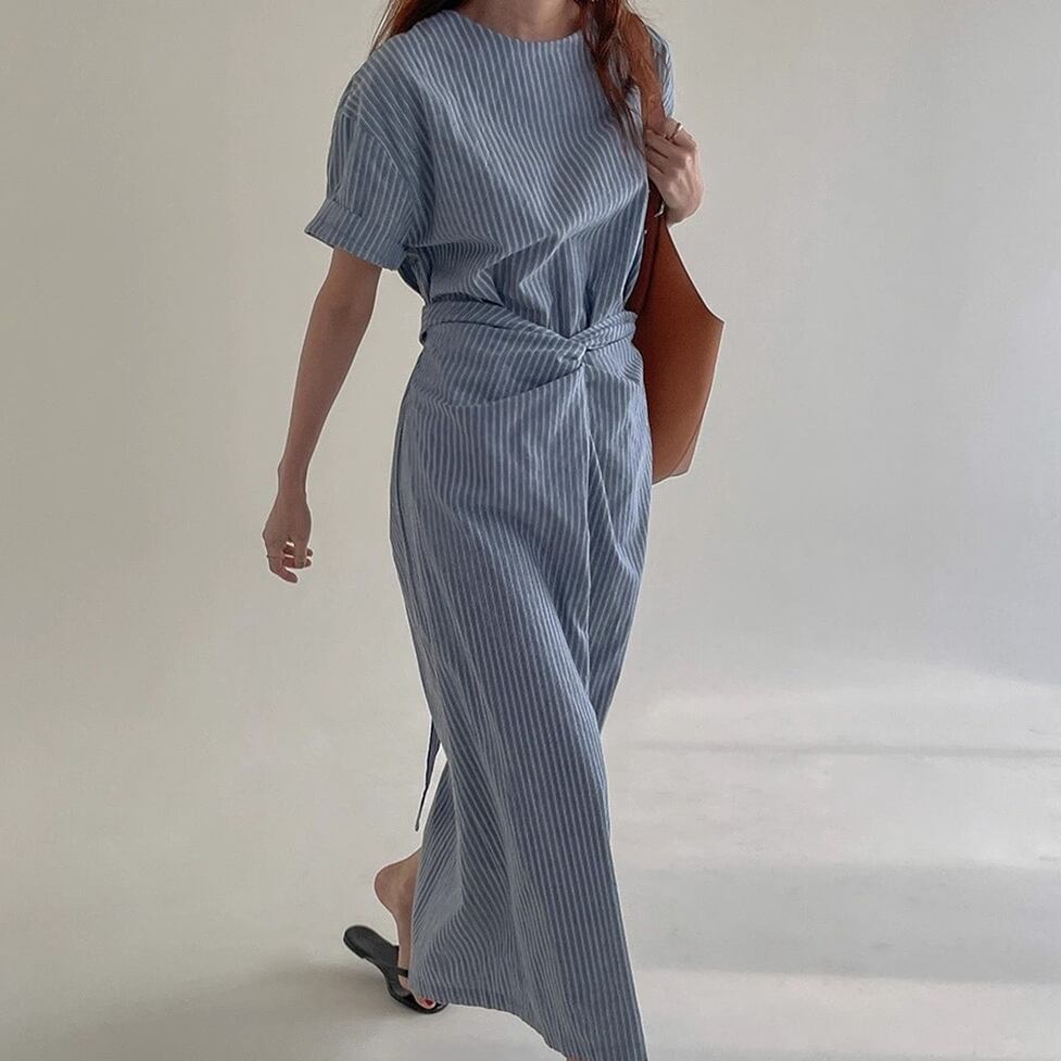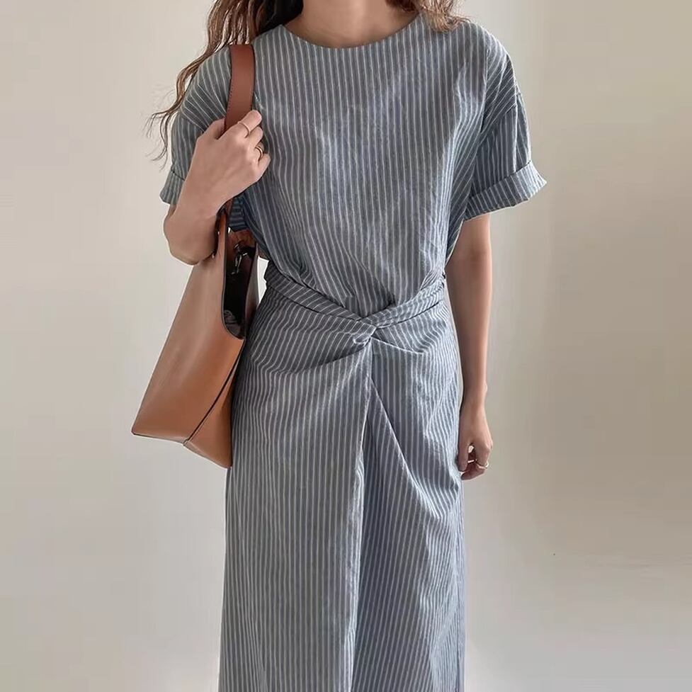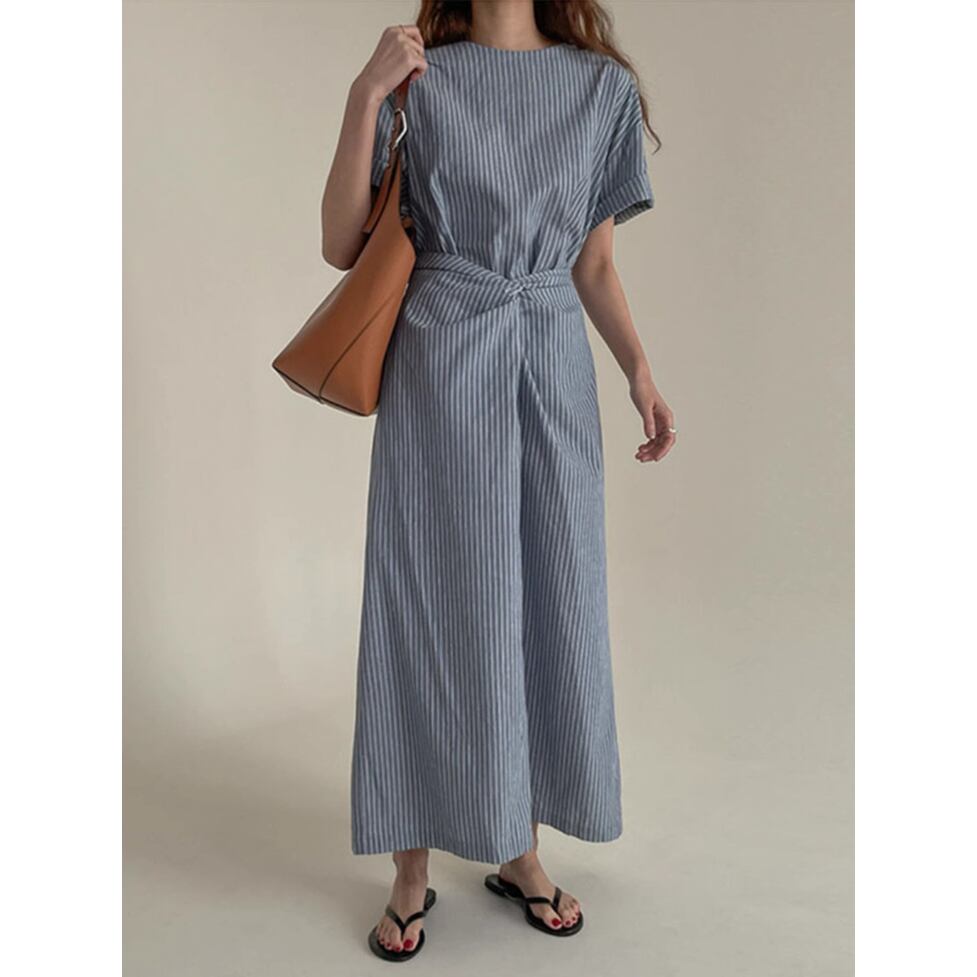 爽やかなノーカラー&オールストライプのワンピース。ウエストコンシャスでスタイルアップも叶うデザインです。視覚的なアクセントになりシンプルでありながらインパクトのあるスタイルを演出。すっきりとしたエレガントな印象を与えます。