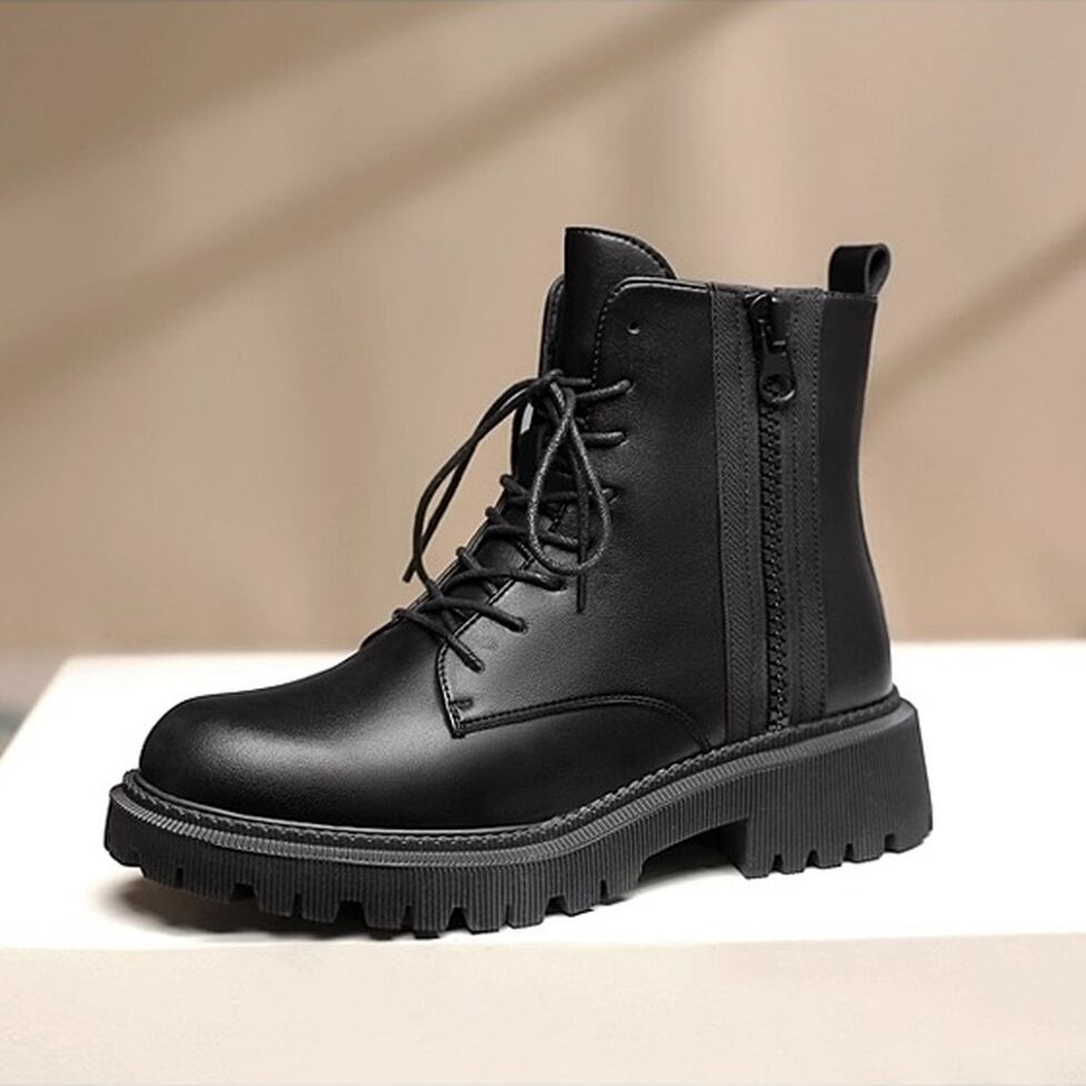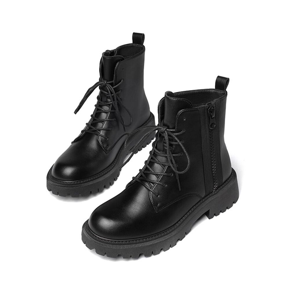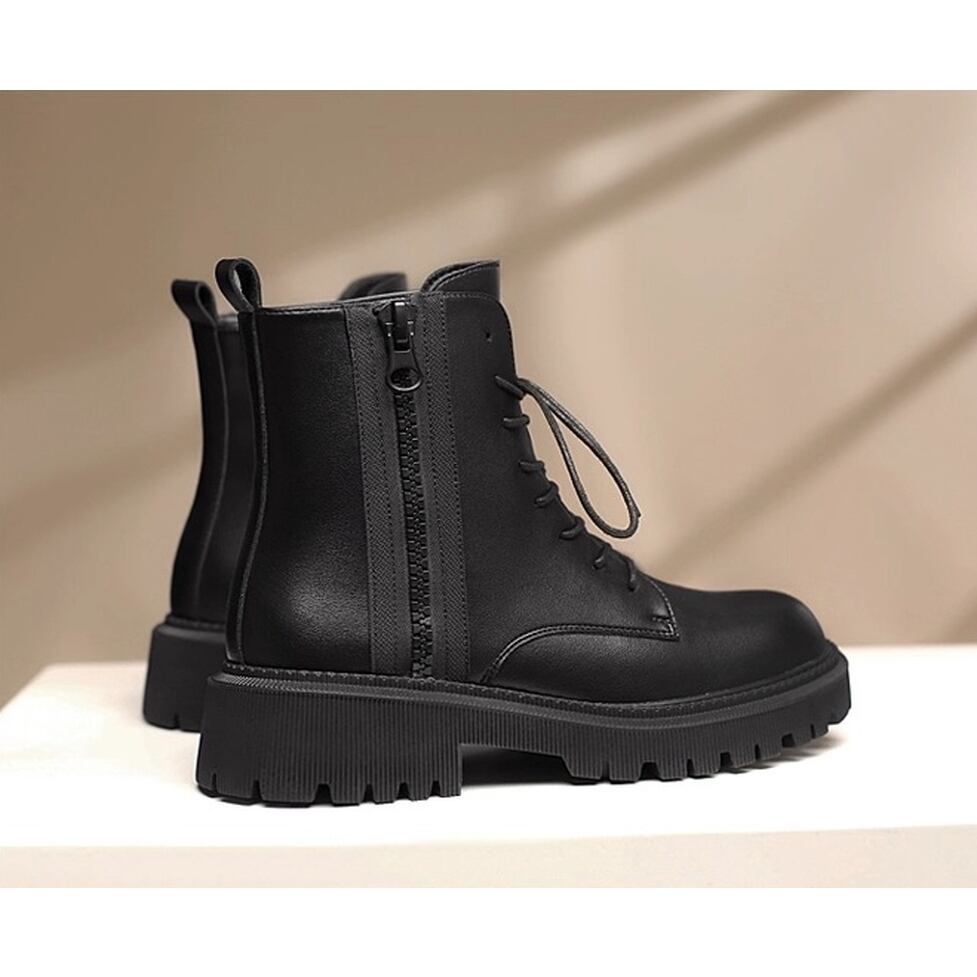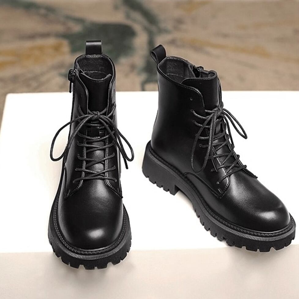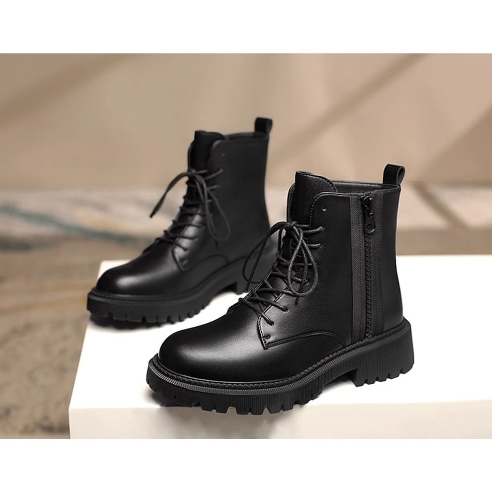 上質なツヤ感があり高級感漂うレザー調レースアップブーツ。サイドファスナーで着脱が楽ちん。カジュアルにもキレイ目にもマッチしてどんなコーデも好相性のシンプルデザイン。マニッシュなのにカジュアルになりすぎない万能アイテム。幅広いコーディネートのハズしとして活躍。