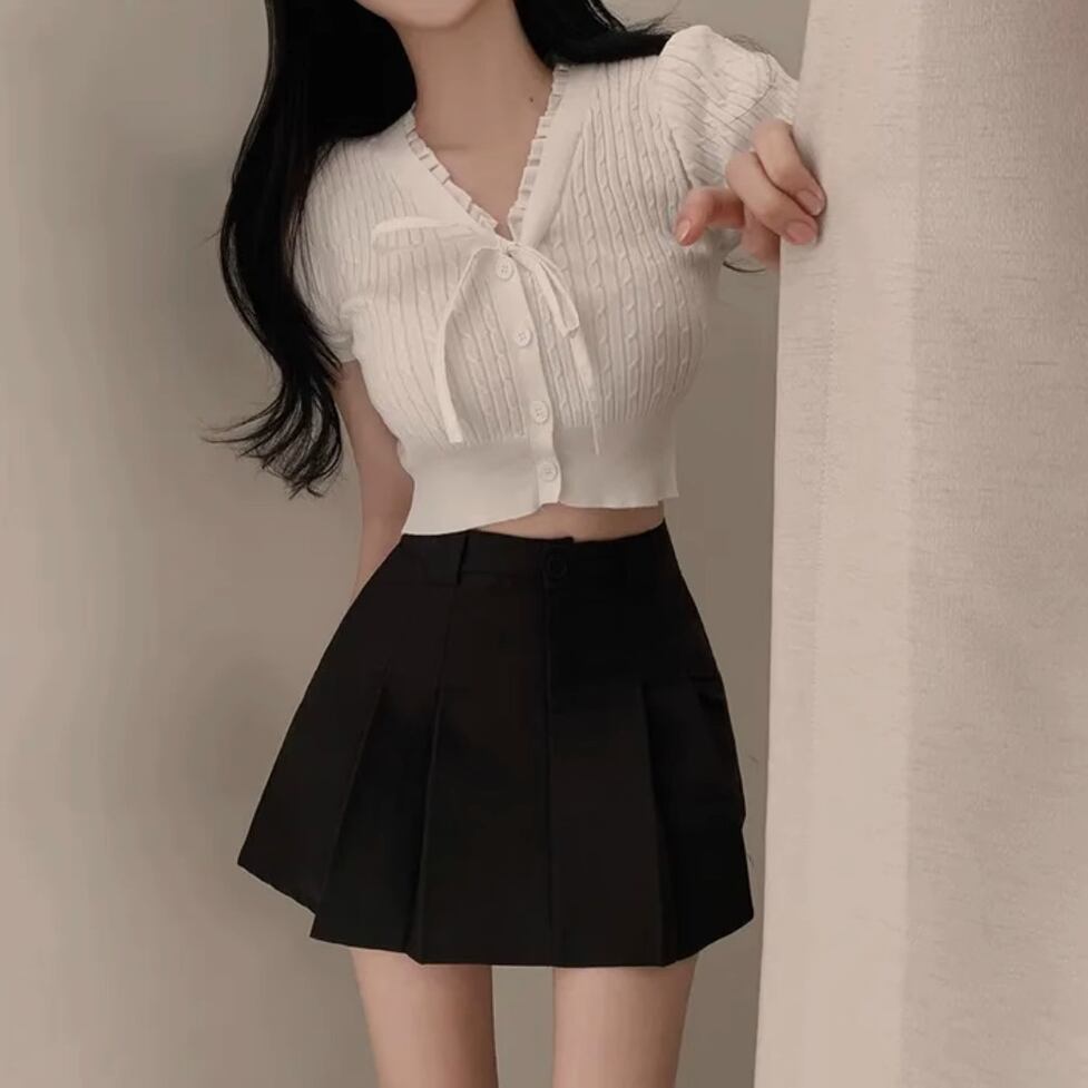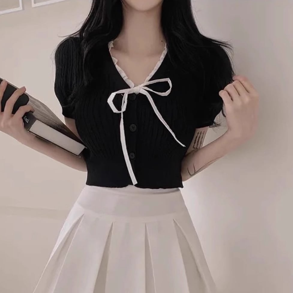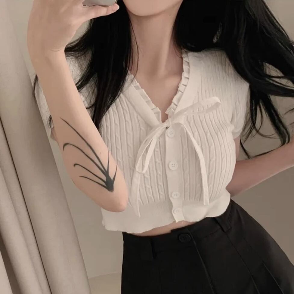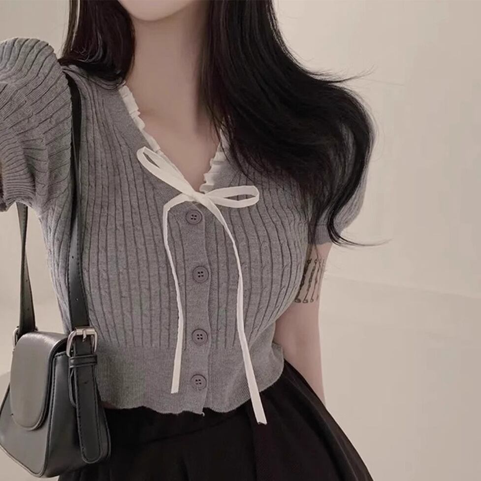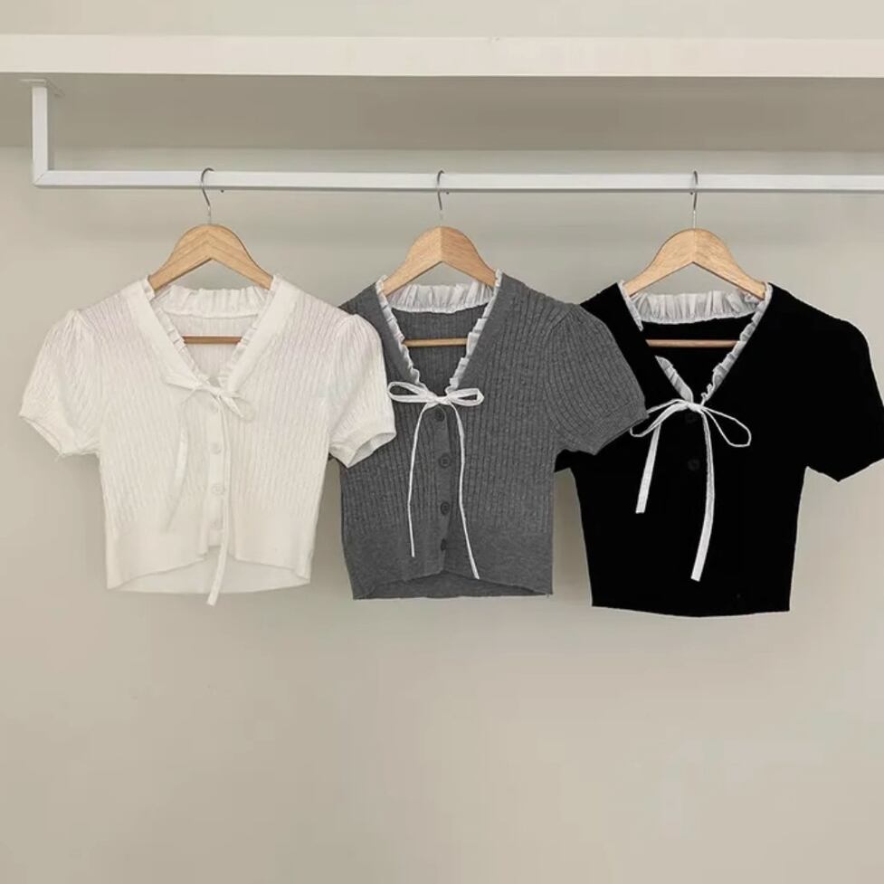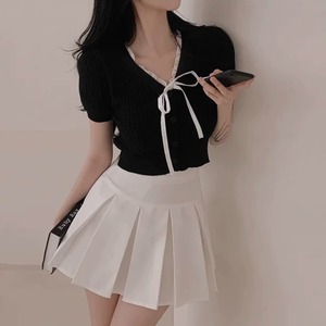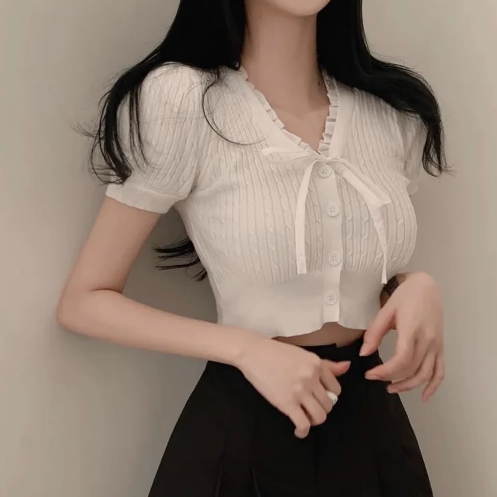 フロントにリボンとレースが施されたガーリーなリブニットトップス。Vネックなので胸元がスッキリ見えて女の子らしく華奢なスタイルを提案。ケーブル編みの立体感が華やか。ショート丈なのでハイウエストのボトムスと相性抜群。スリムフィットなシルエットが女性らしさを引き立てます。