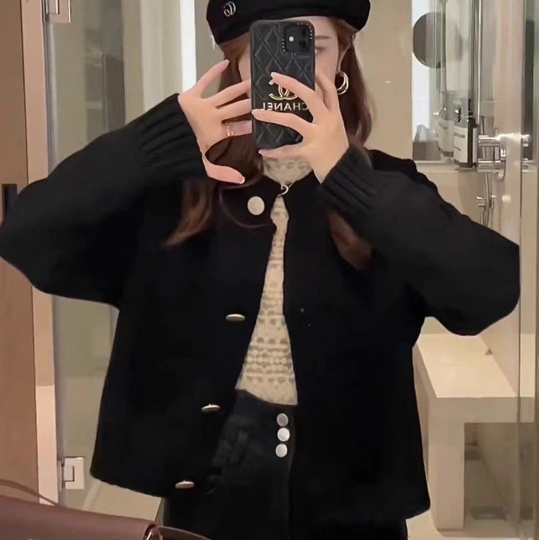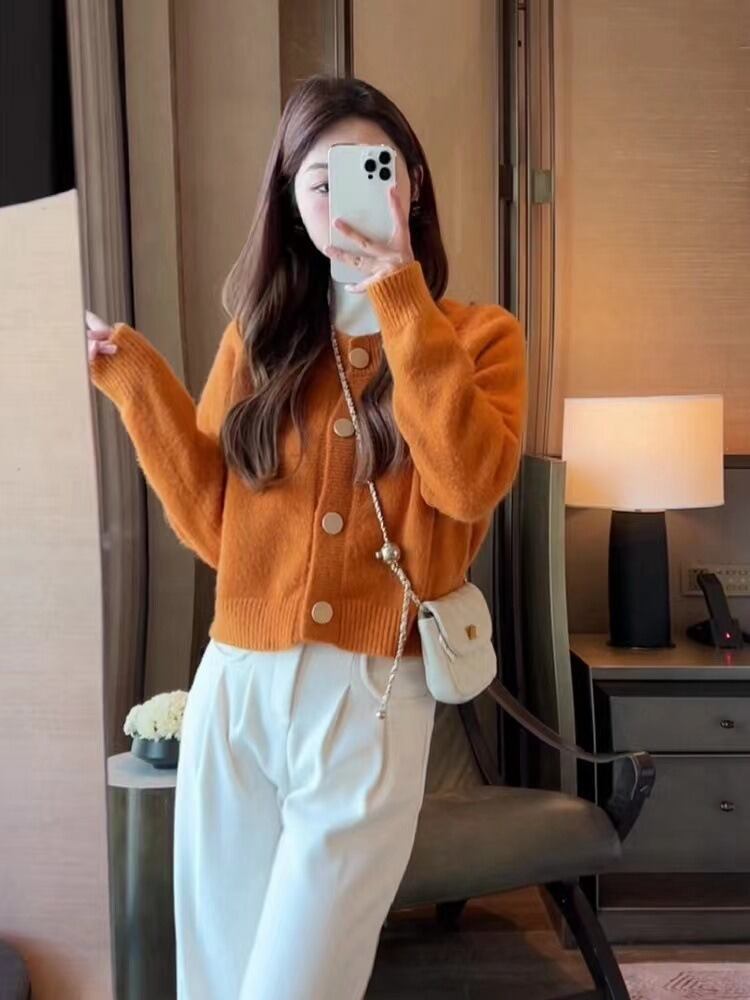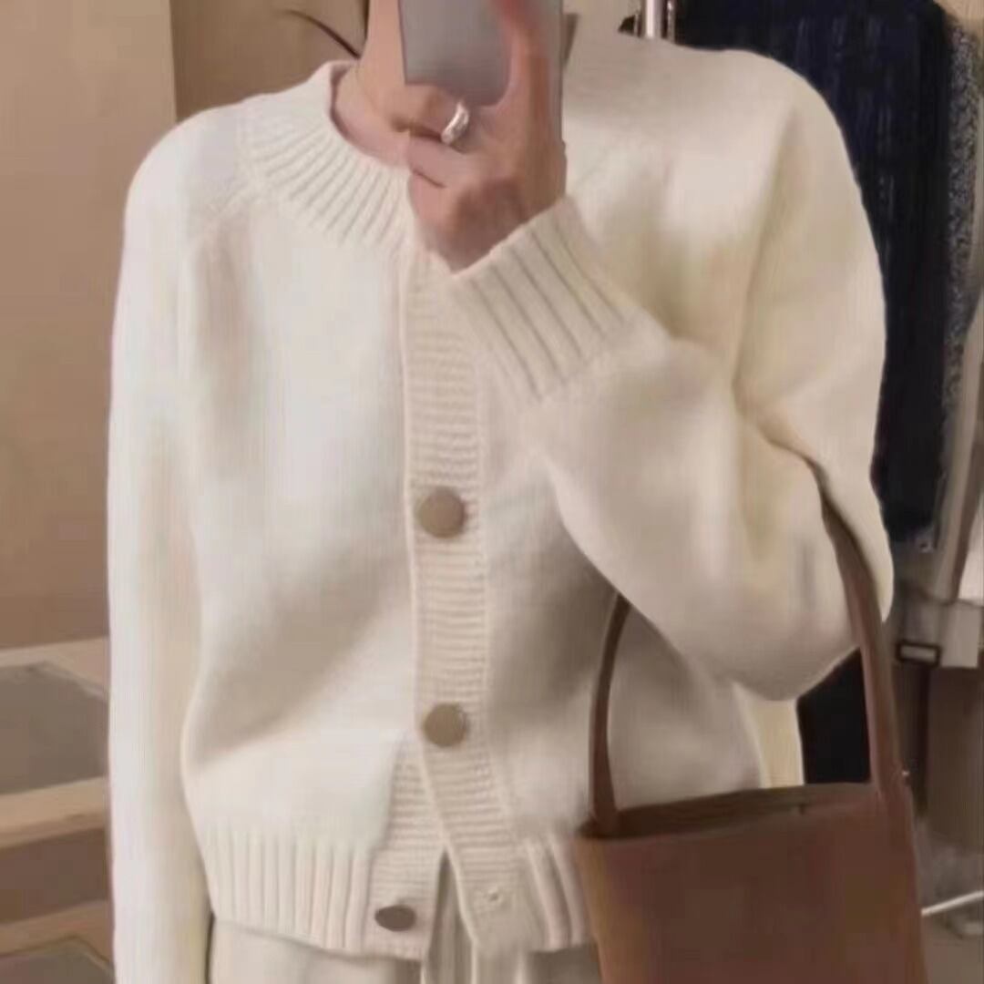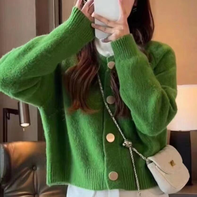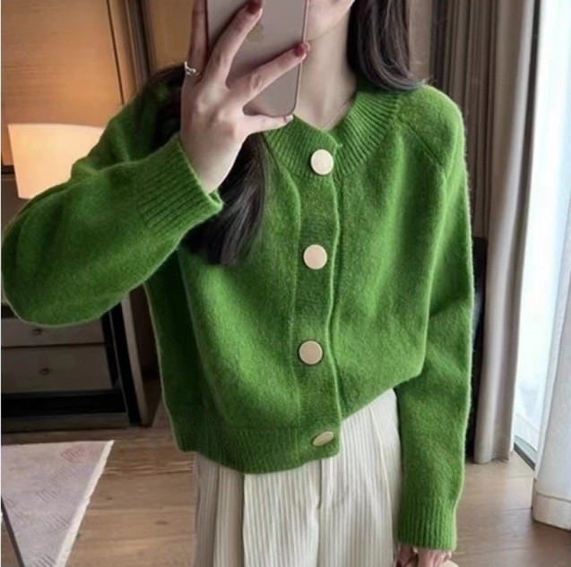 前開きデザインで羽織るだけでこなれ感を演出し、ラウンドネックと萌え袖が女性らしい可愛さを引き立てます。