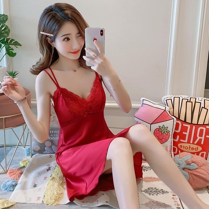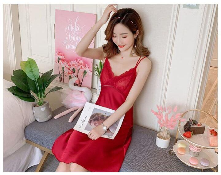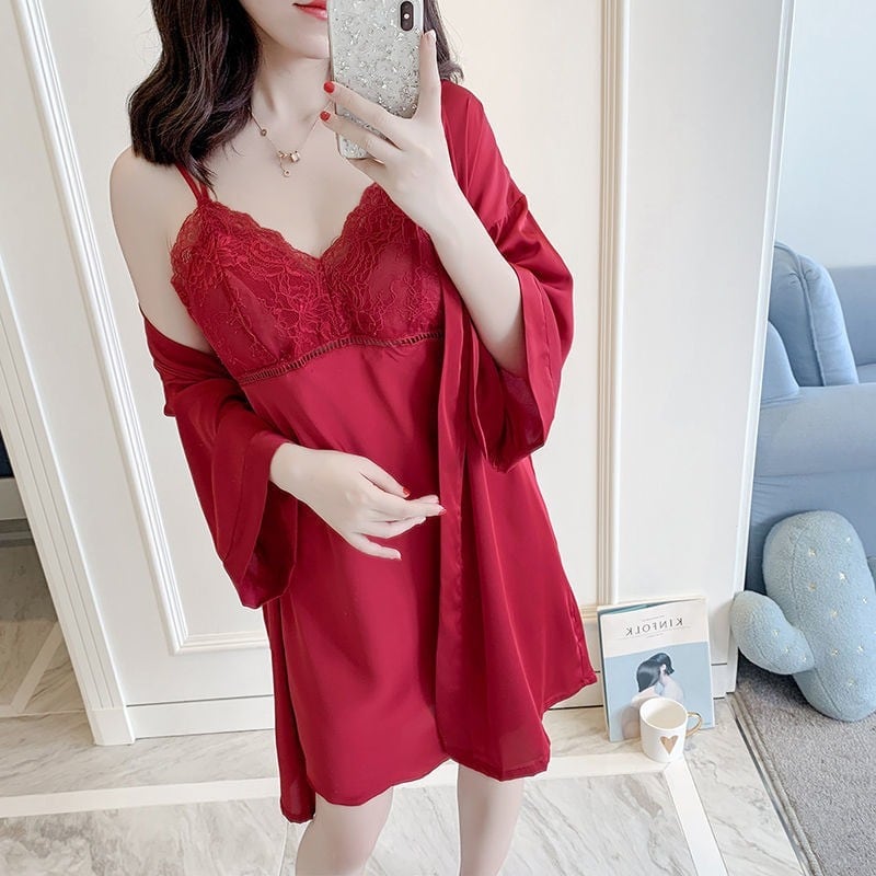 繊細なレースとバッククロスデザインが印象的なキャミワンピースとガウンのルームウェアセットアップ。