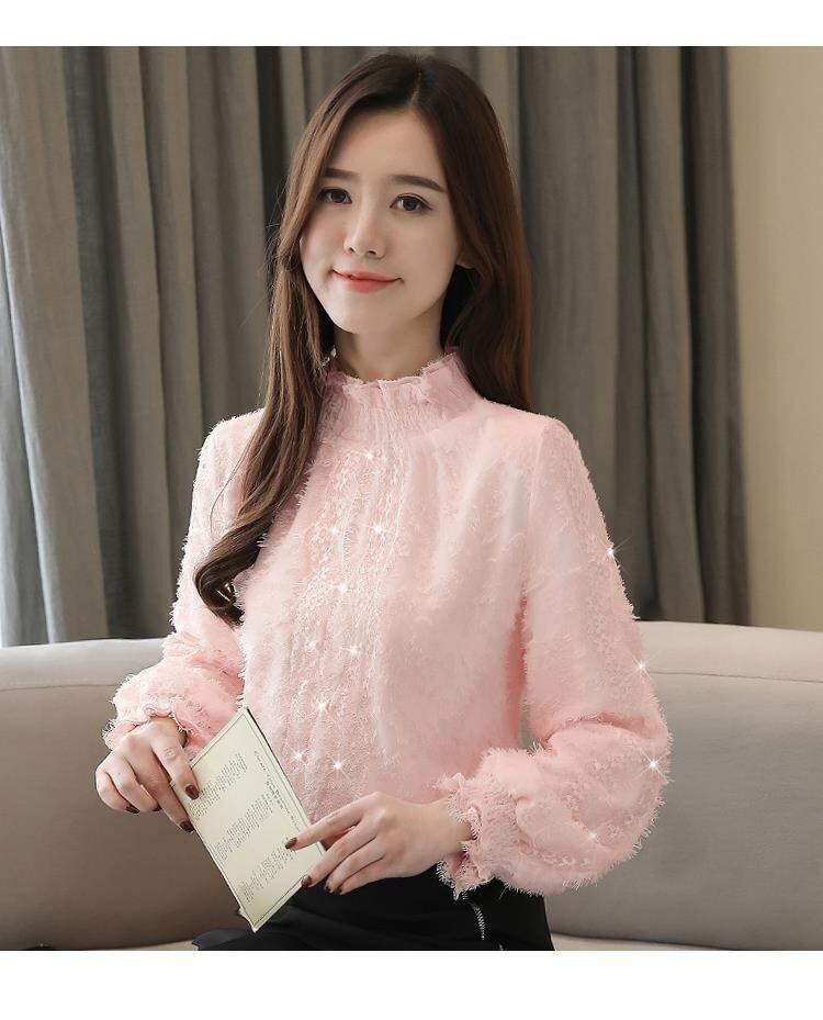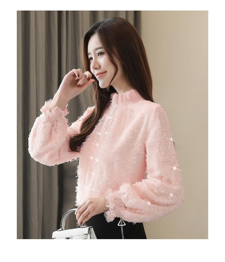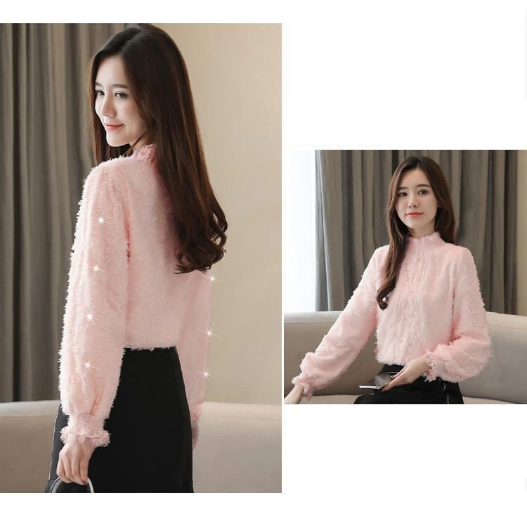 柔らかなカラーが印象的な、上品でフェミニンな長袖ブラウス。